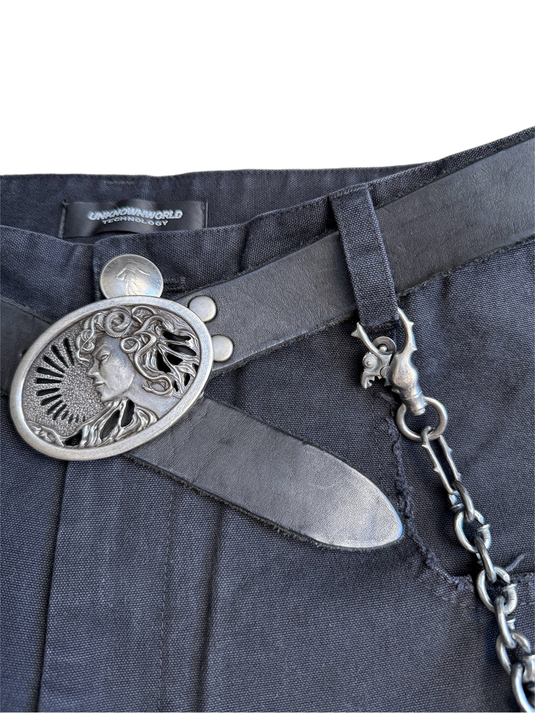 Buckle: Crafted from copper with thick silver plating, featuring a Medusa-inspired demon-season design. The snake-scale and hair details are sharply defined, presenting a bold blend of artistry and avant-garde aesthetics. Each buckle undergoes hand-aged finishing, achieving a texture close to solid silver.