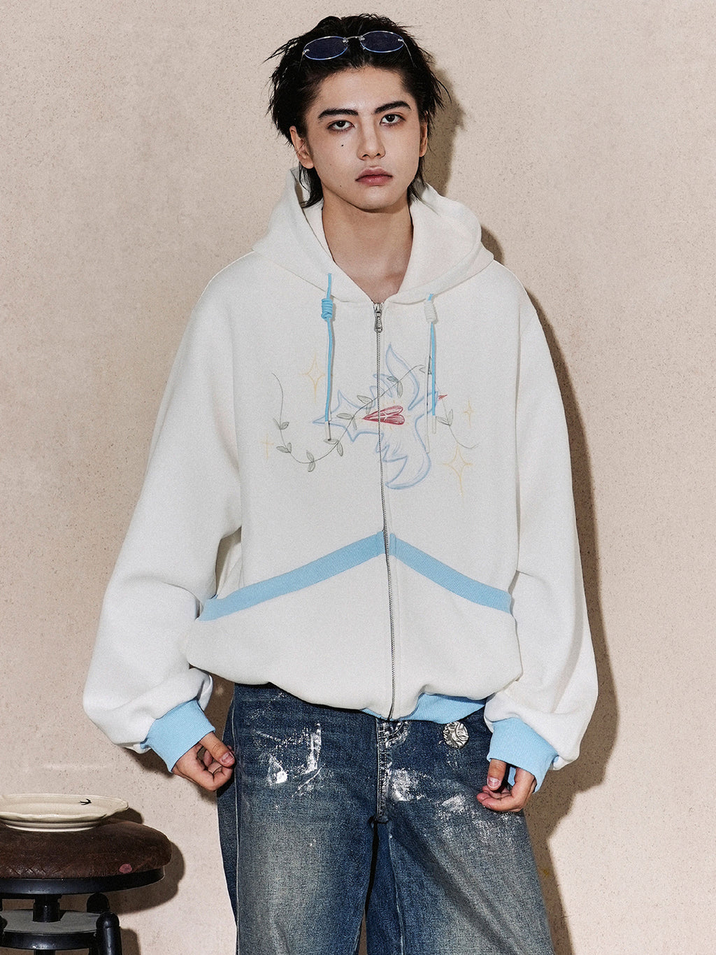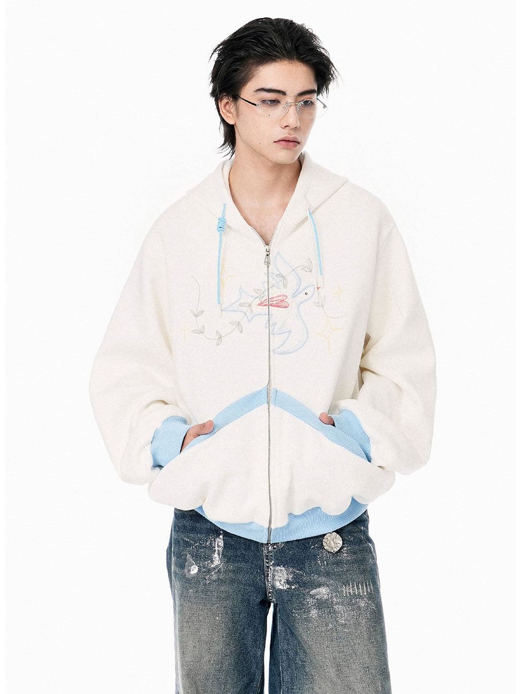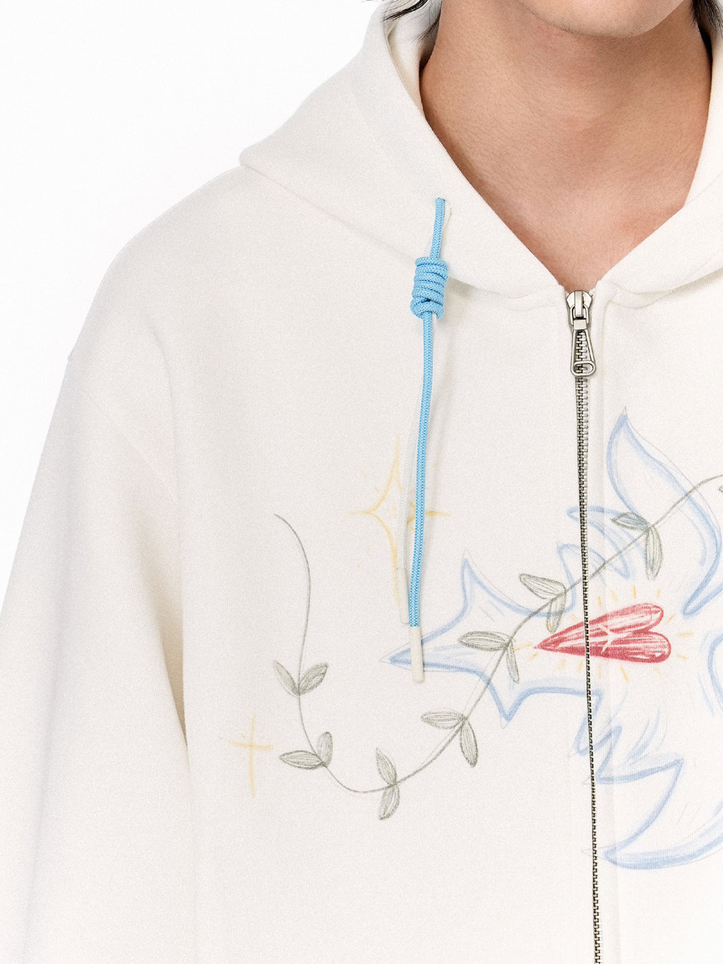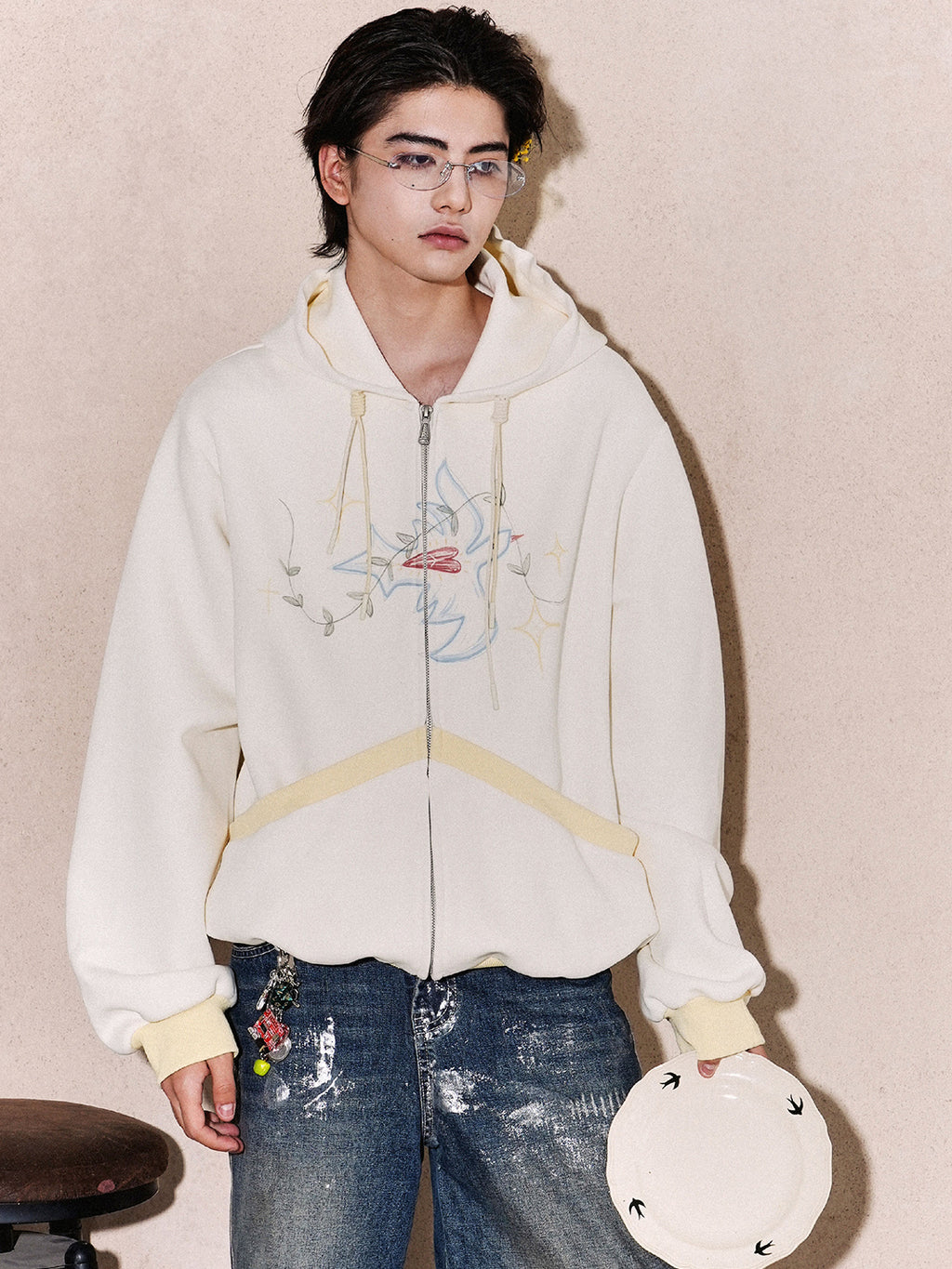 This sweatshirt jacket, inspired by the theme of "May the world be at peace," is crafted from high-quality jelly sweatshirt fabric that is both structured and soft. Drawing inspiration from the symbol of peace and incorporating a unique pocket design, it breaks with convention to create a jacket with distinctive meaning.