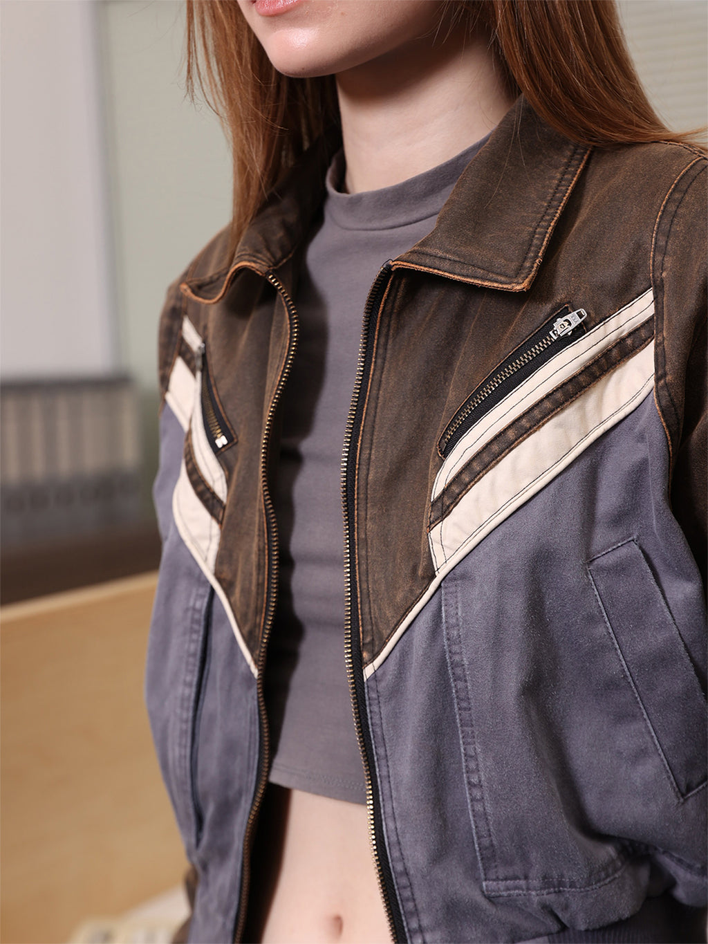 The slim-fit, short-length design is suitable for body types under 65kg. It has a crisp, structured look. The soda ash washing process allows the surface dye to naturally bleed away, creating an antique, brownish hue. The black and blue fabric is combined, and the black and white stripes on the chest create a V-shaped silhouette.