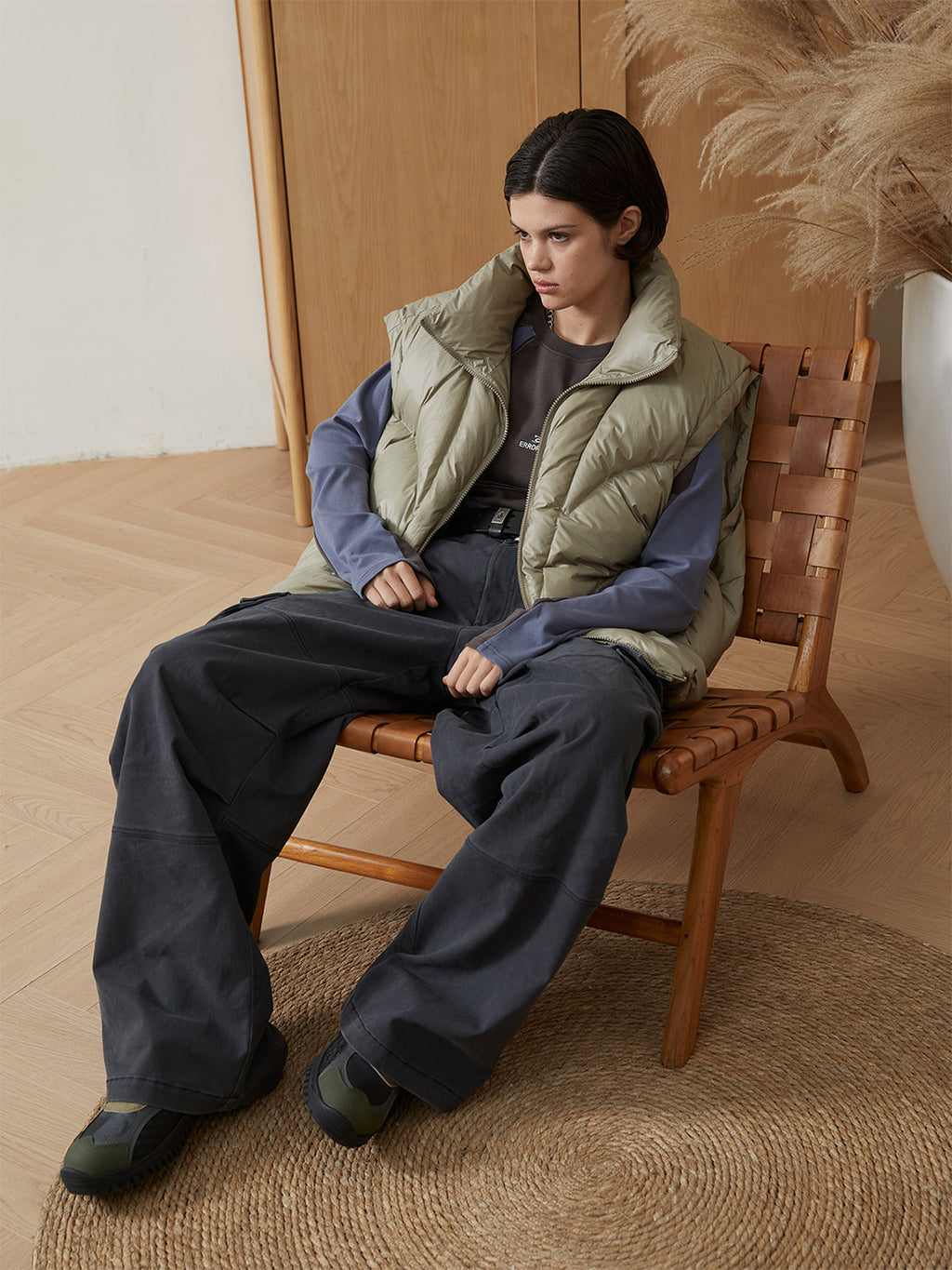 Made from a slightly stretchy twill fabric, the pants have a soft yet substantial feel. The overall design features wide-leg cargo pants with pleats at the knees to enhance the leg's structure and slanted pockets.