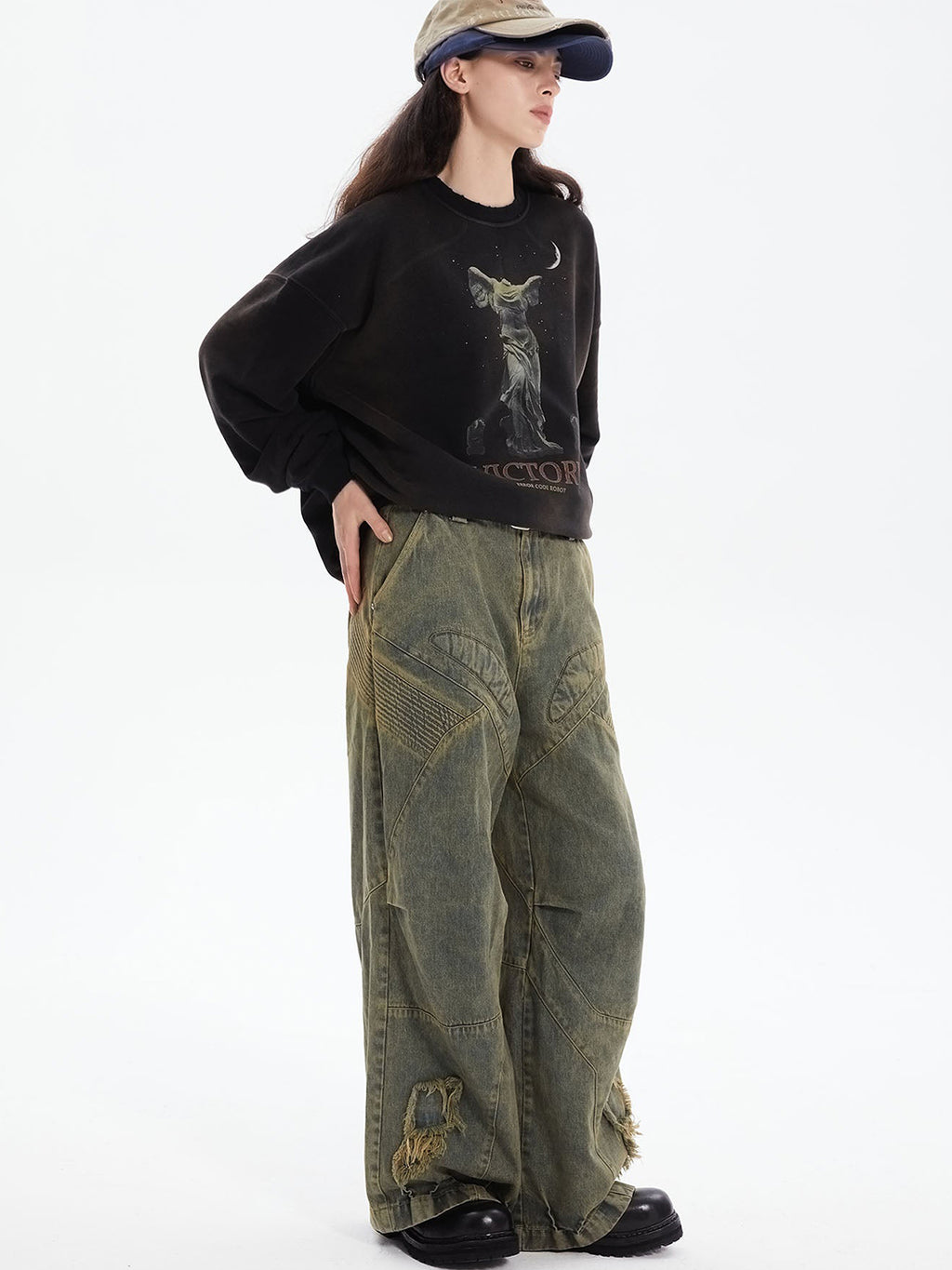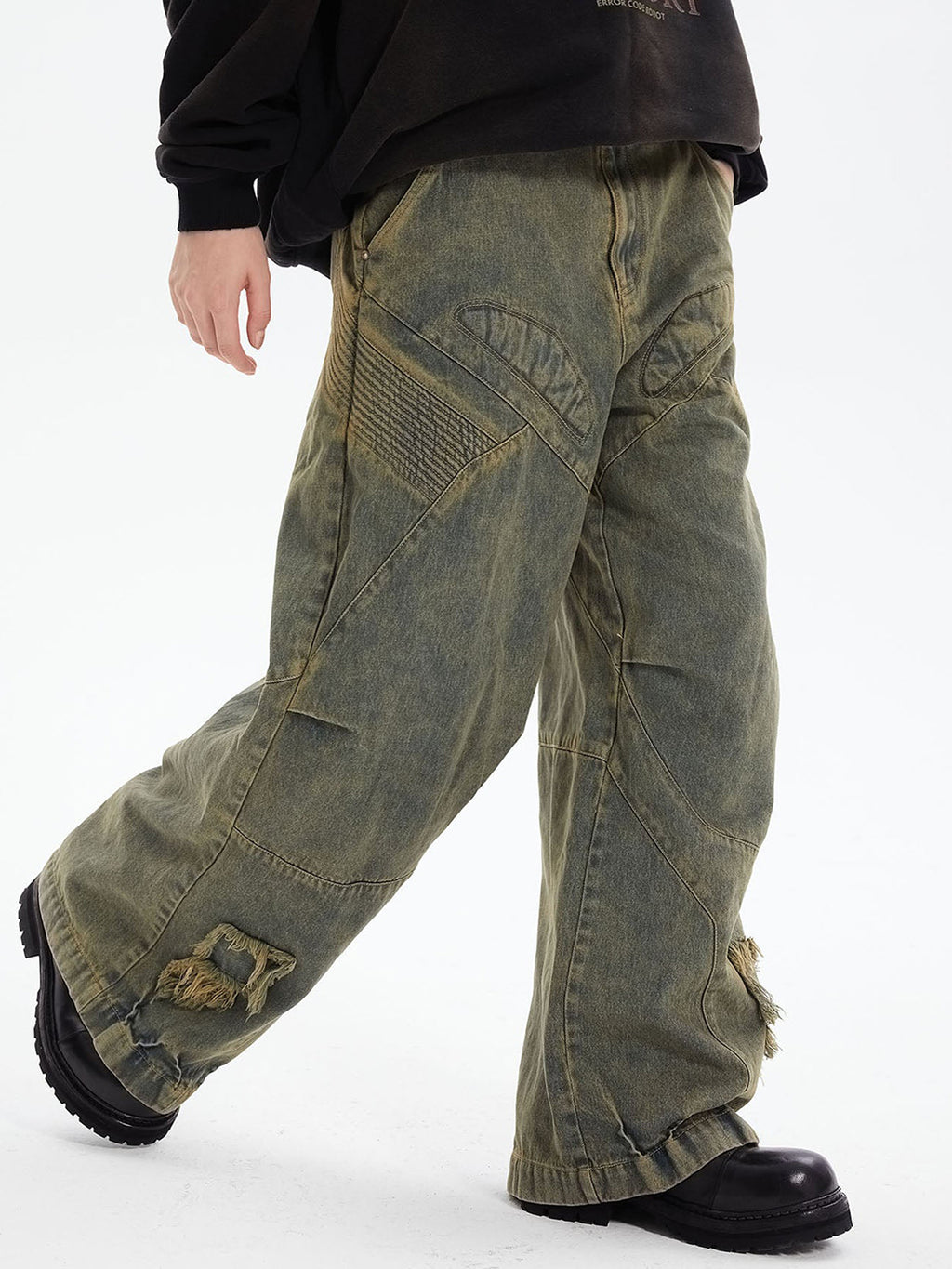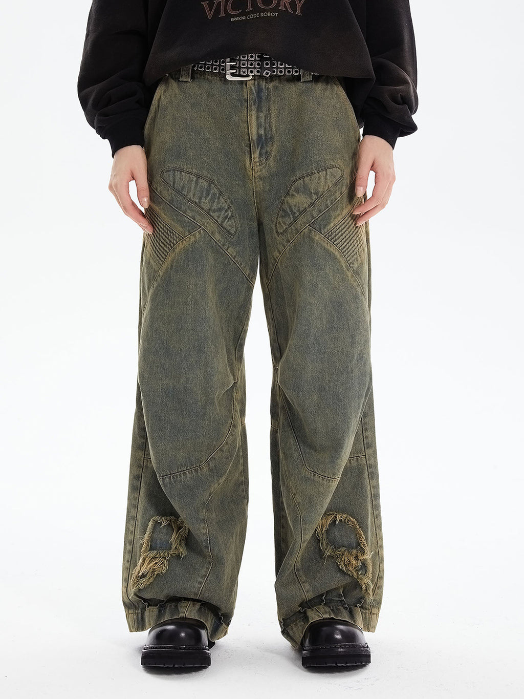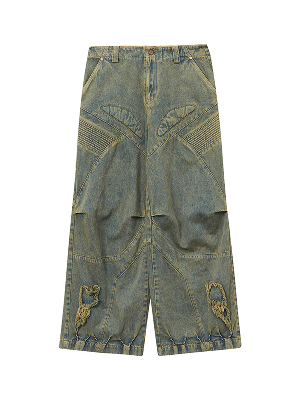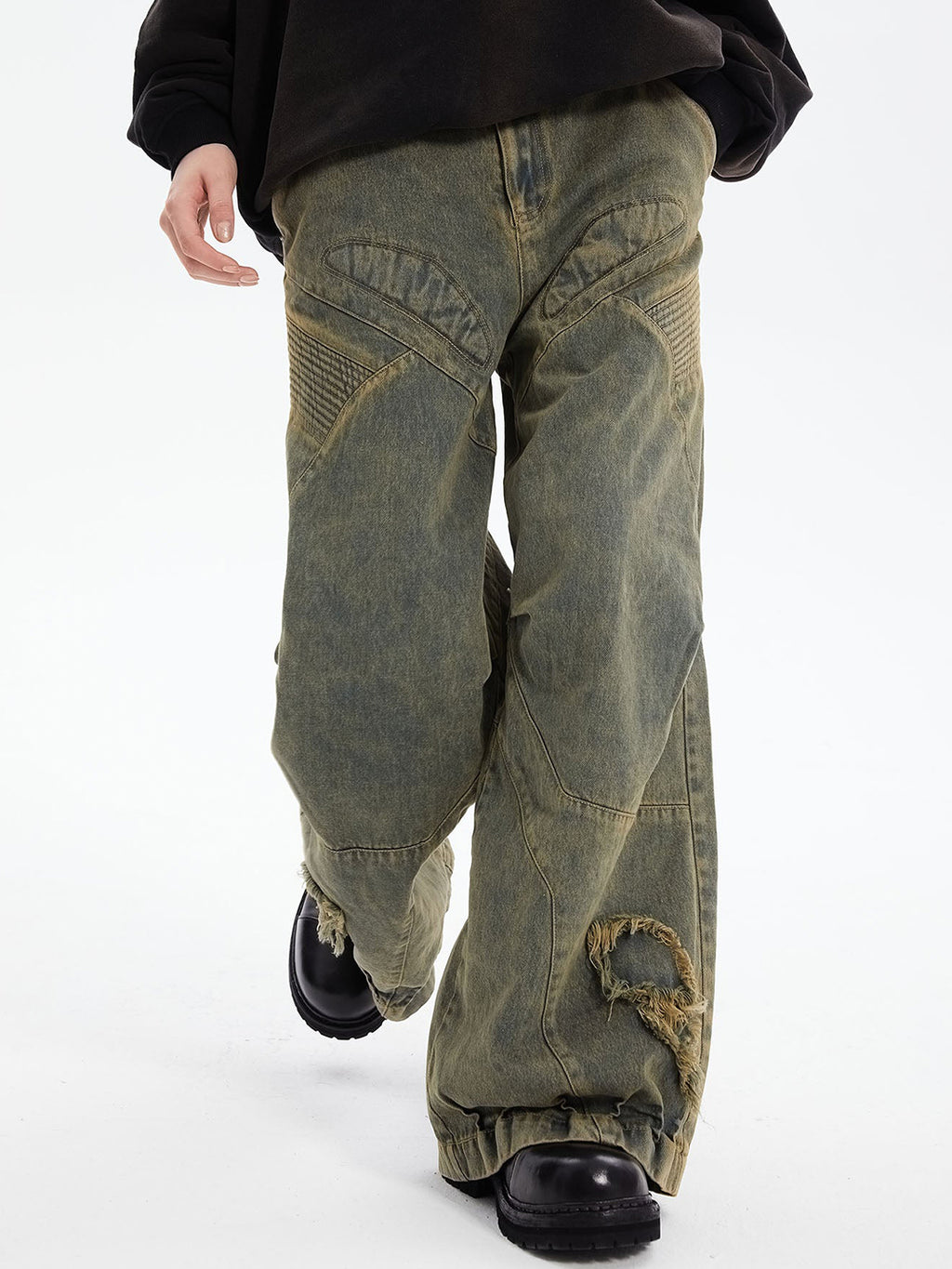 The loose, straight-leg wide-leg style is forgiving of most leg shapes and can flatter the overall body proportions. The addition of distressed overprinting and ripped details to the standard denim wash creates a mechanical, racing-inspired look.