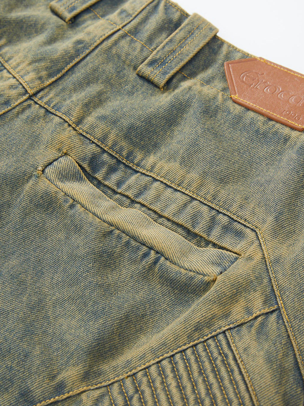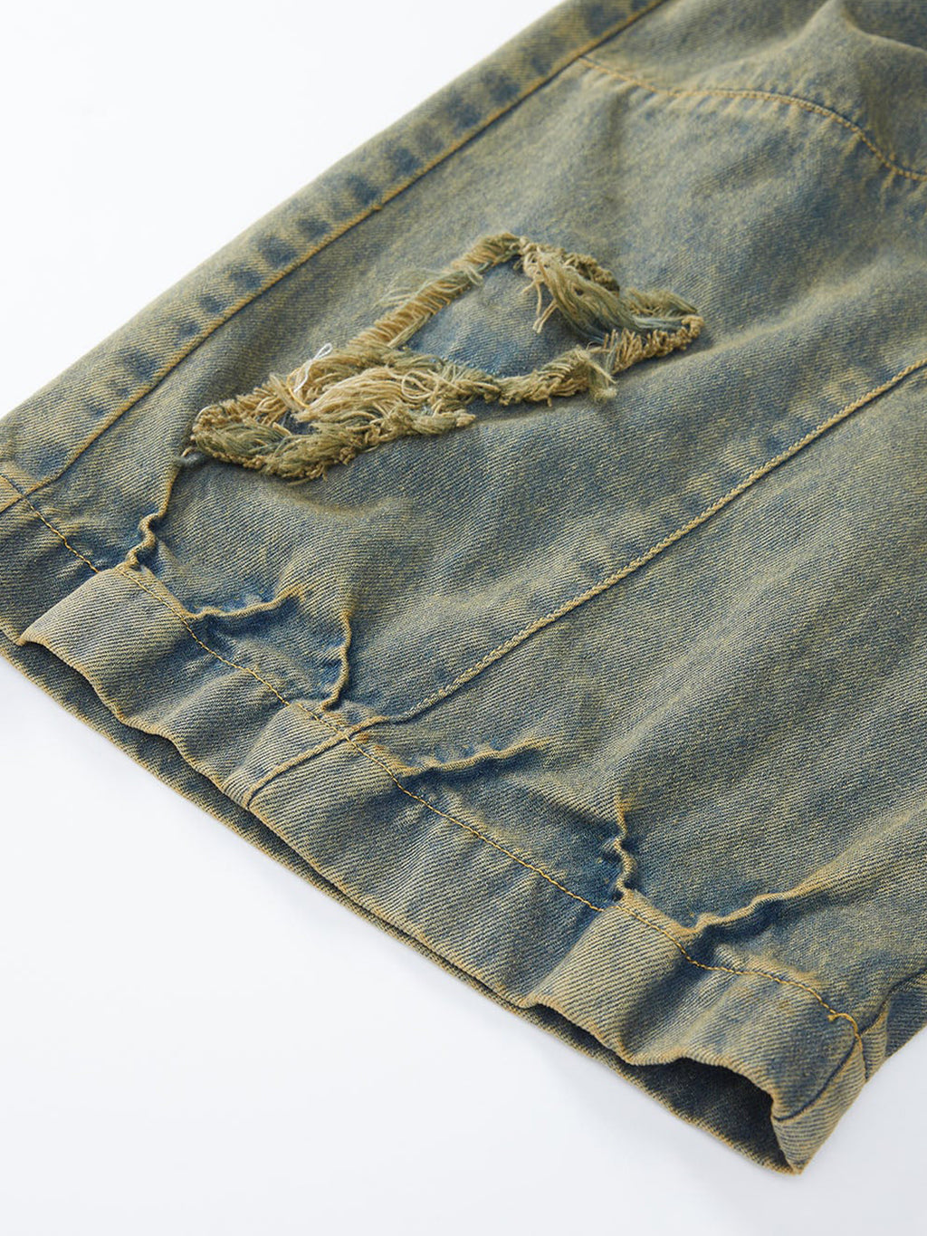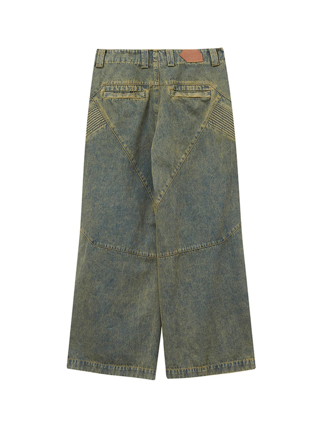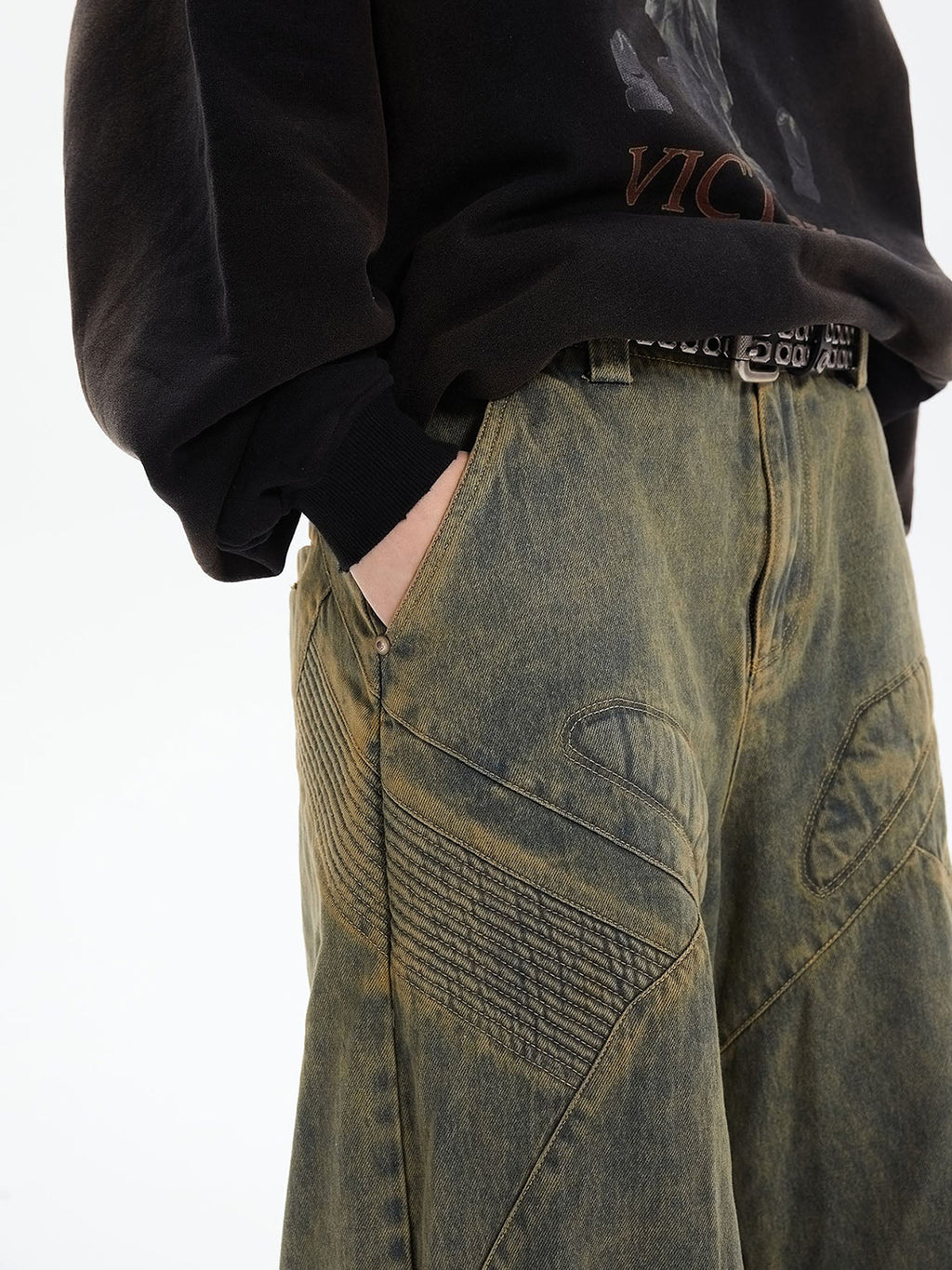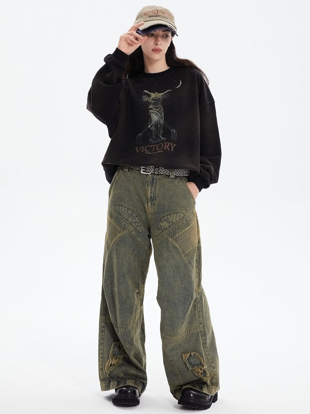 The loose, straight-leg wide-leg style is forgiving of most leg shapes and can flatter the overall body proportions. The addition of distressed overprinting and ripped details to the standard denim wash creates a mechanical, racing-inspired look.