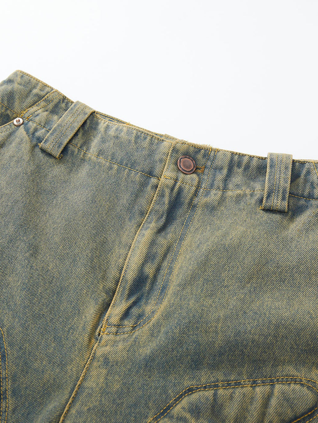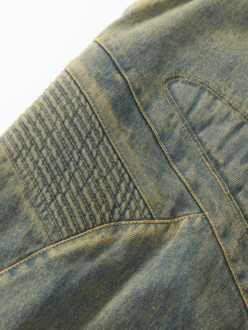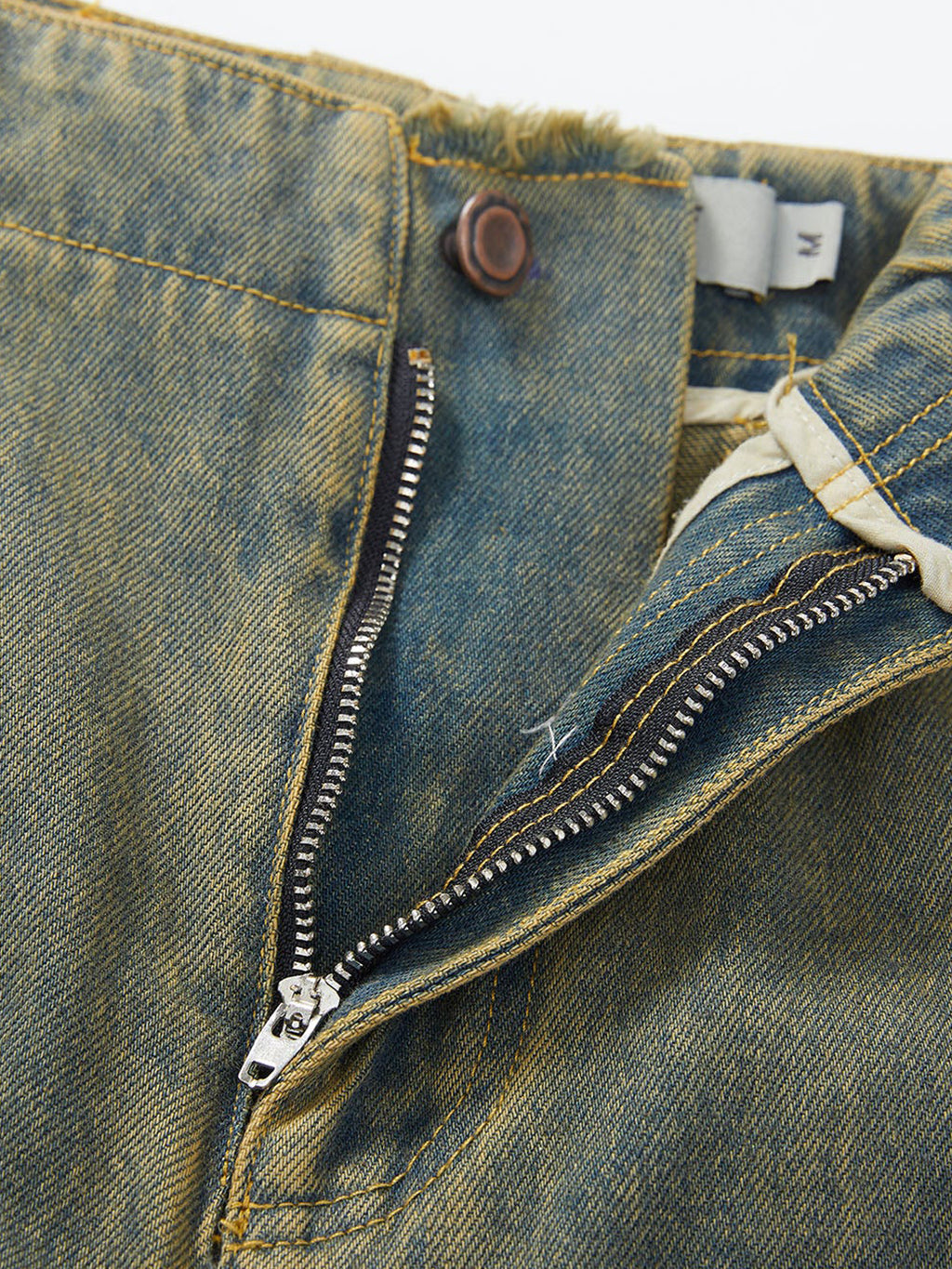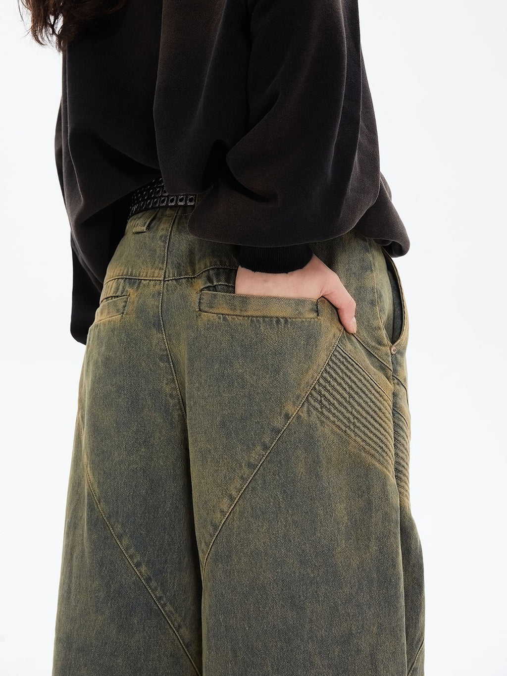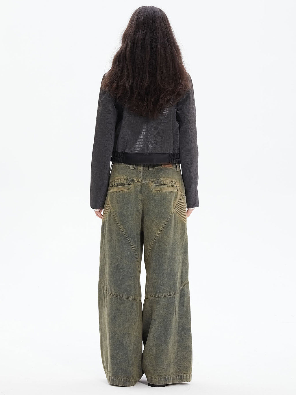 The loose, straight-leg wide-leg style is forgiving of most leg shapes and can flatter the overall body proportions. The addition of distressed overprinting and ripped details to the standard denim wash creates a mechanical, racing-inspired look.