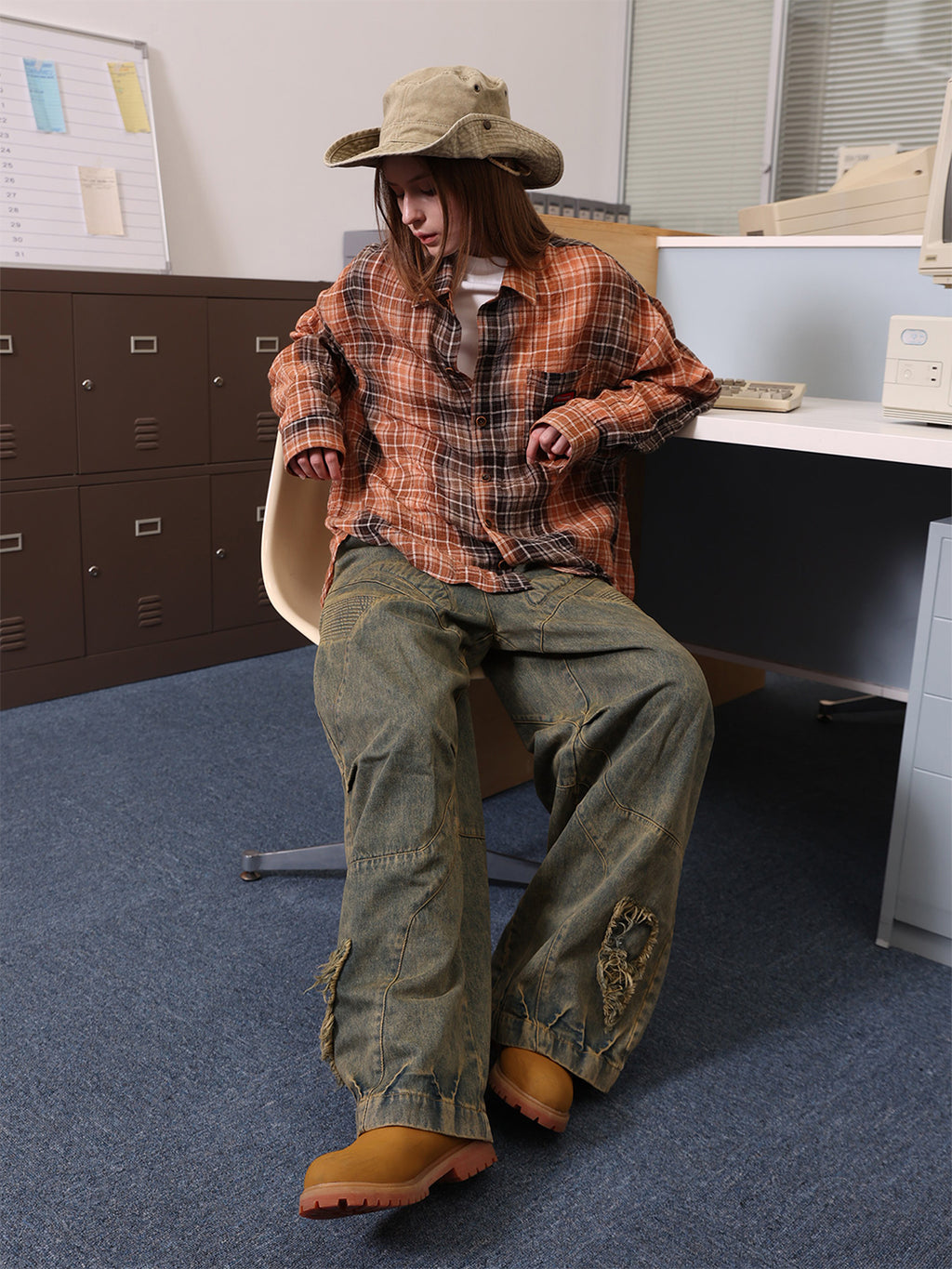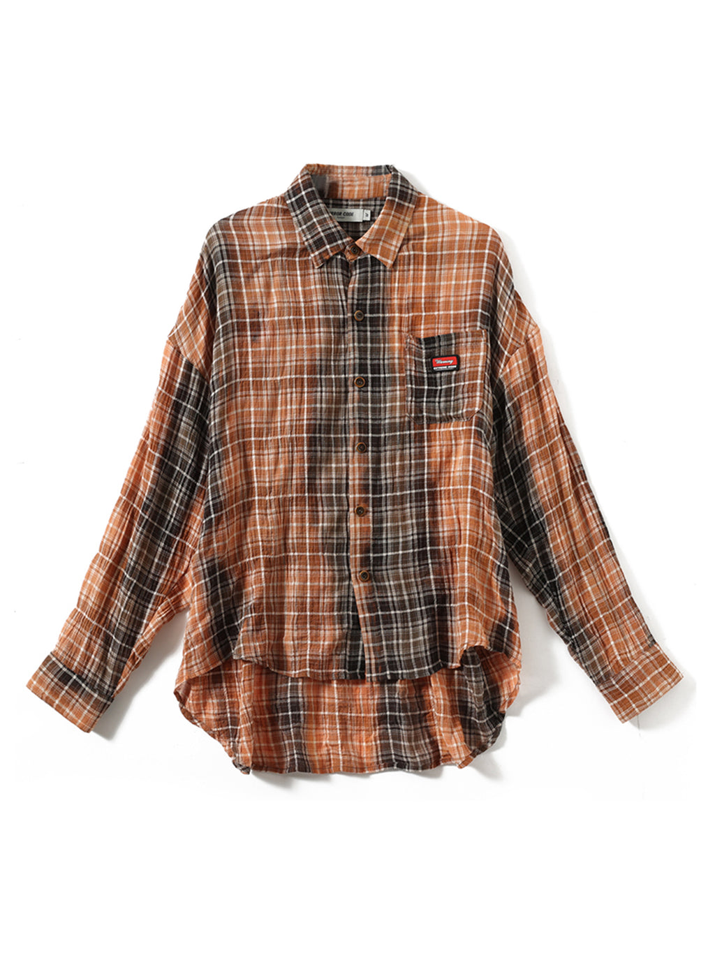 Leisurely Holiday Chain Embroidery Tie-Dye Pleated Plaid Shirt. The plaid fabric undergoes a special process to create a unique pleated texture and tie-dye effect. The chain embroidery on the back adds a relaxed holiday feel. The typography uses a loose fit and highly elastic fabric to accommodate different body types.