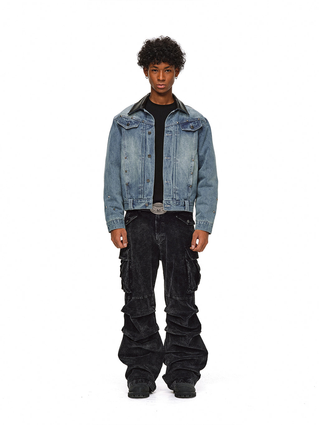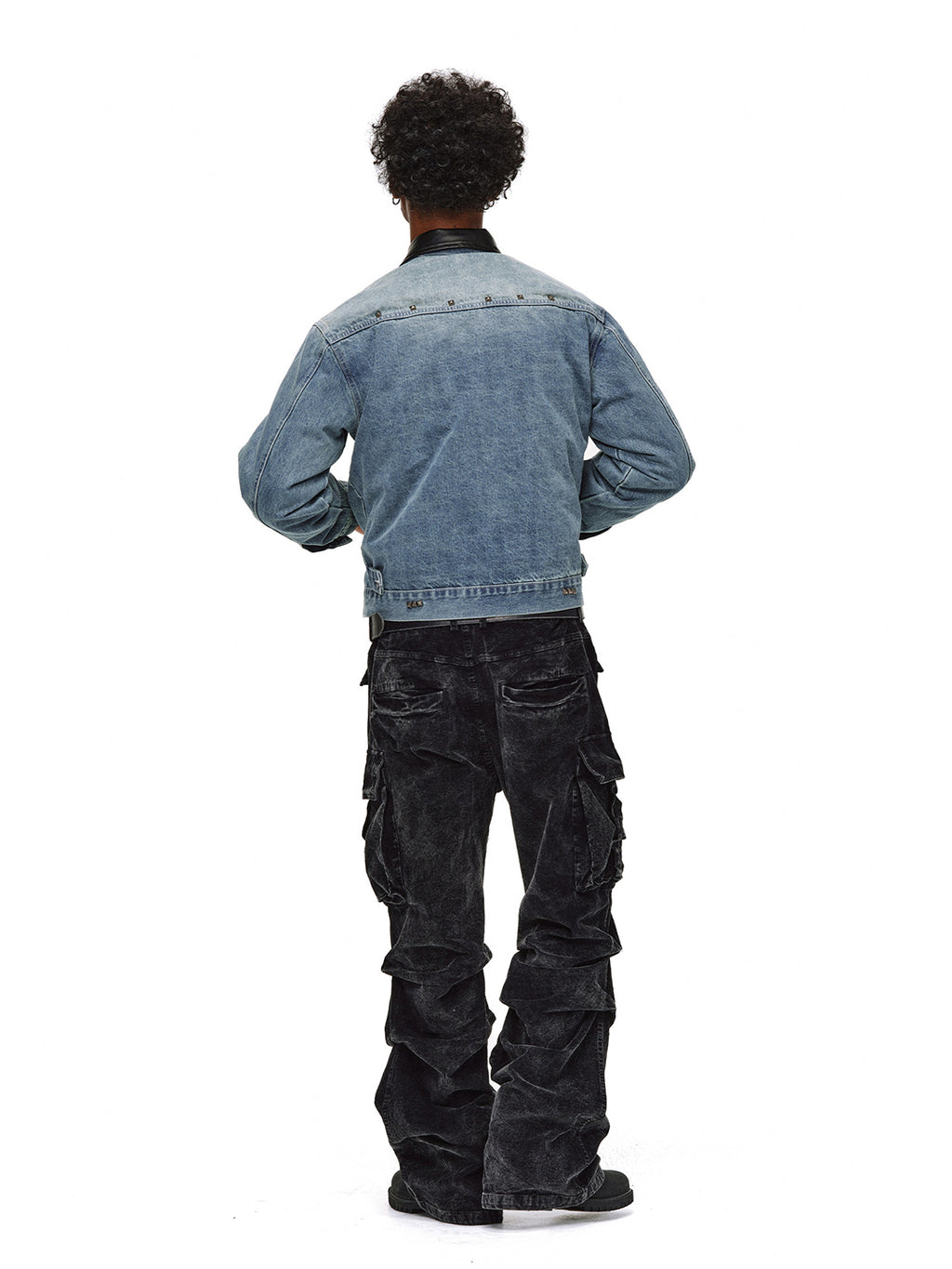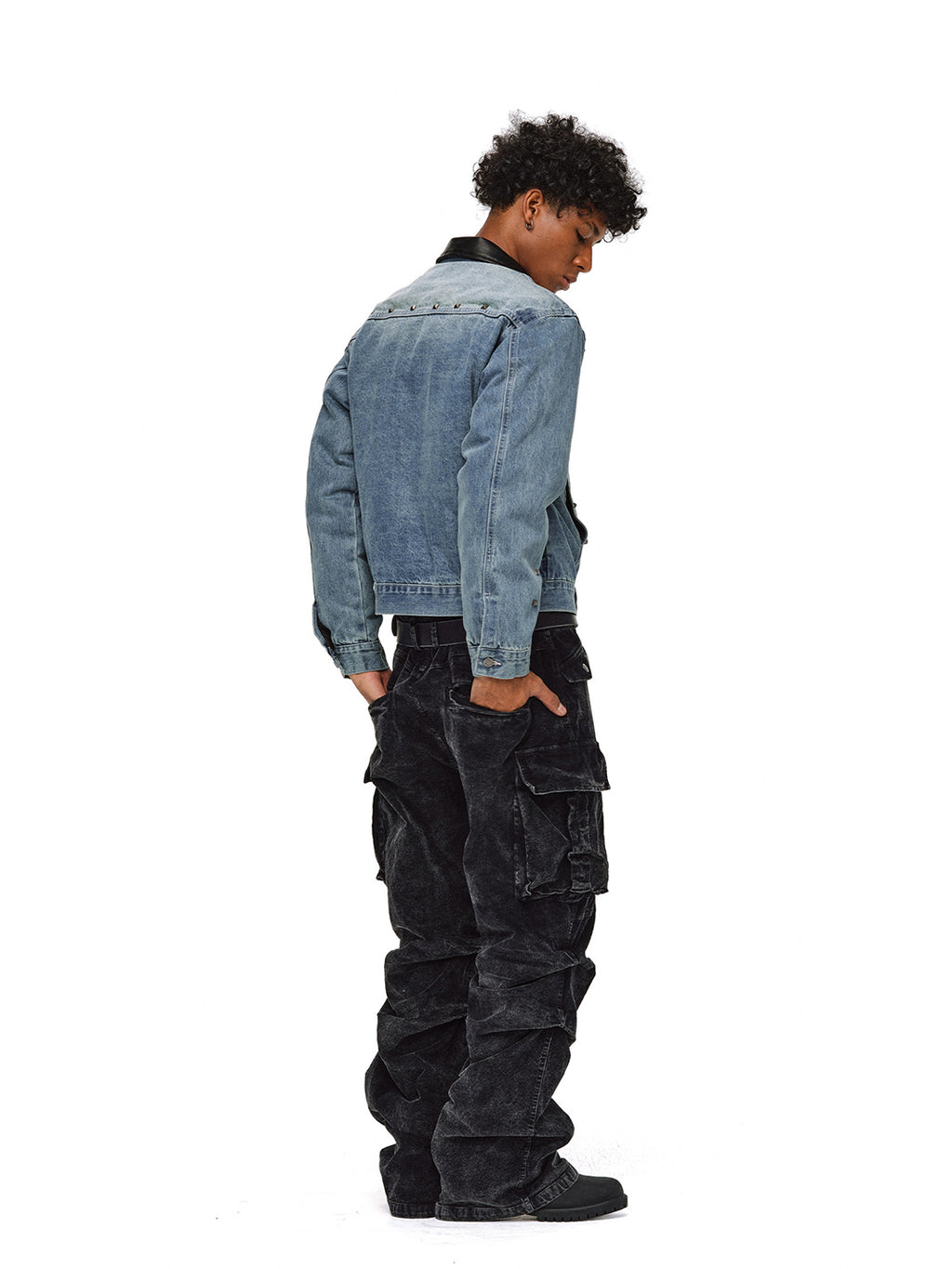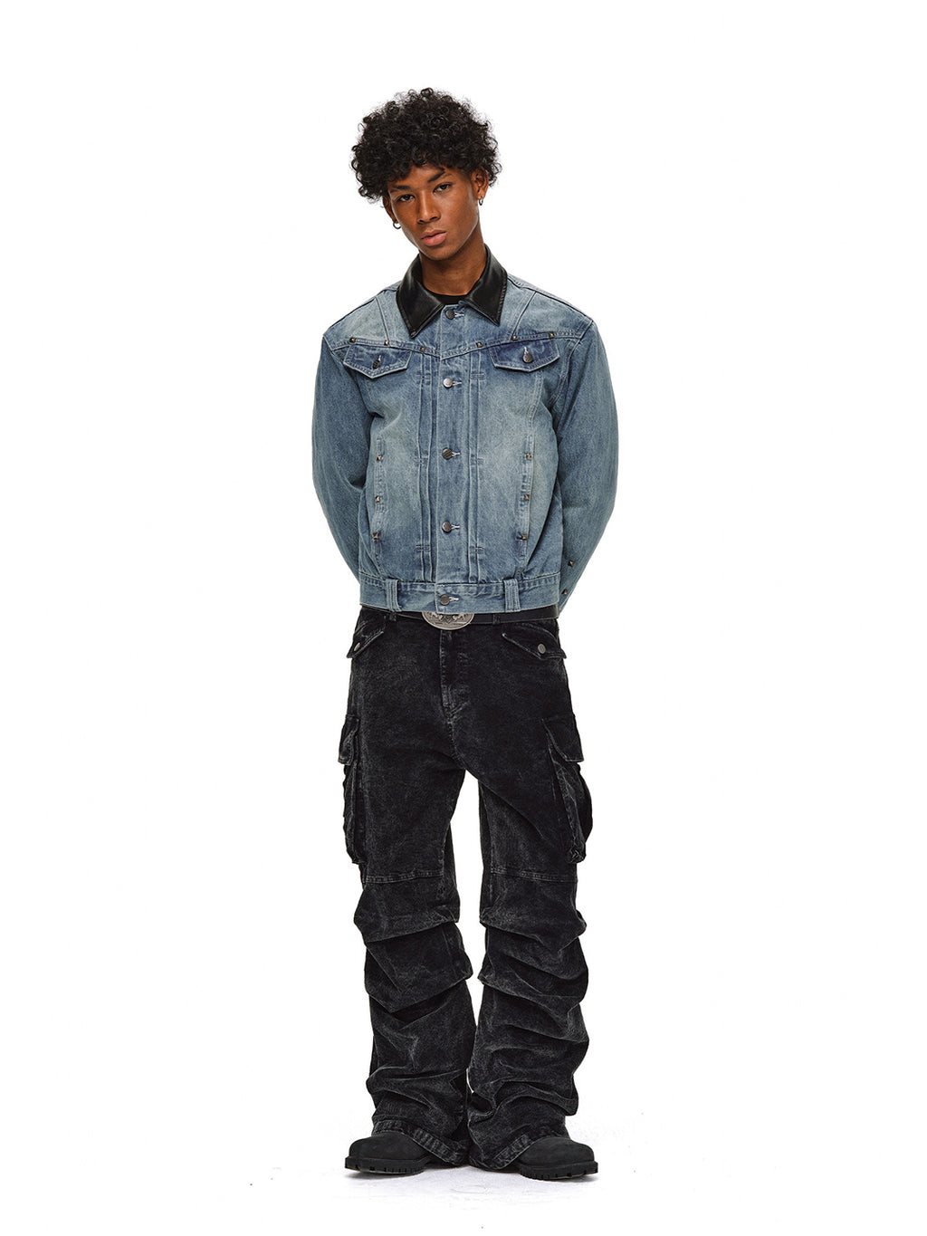 The black leather collar adds a touch of luxury, softening the ruggedness of the denim and enriching the overall style.