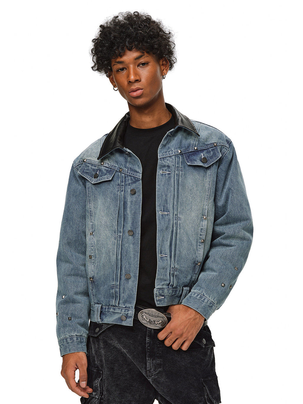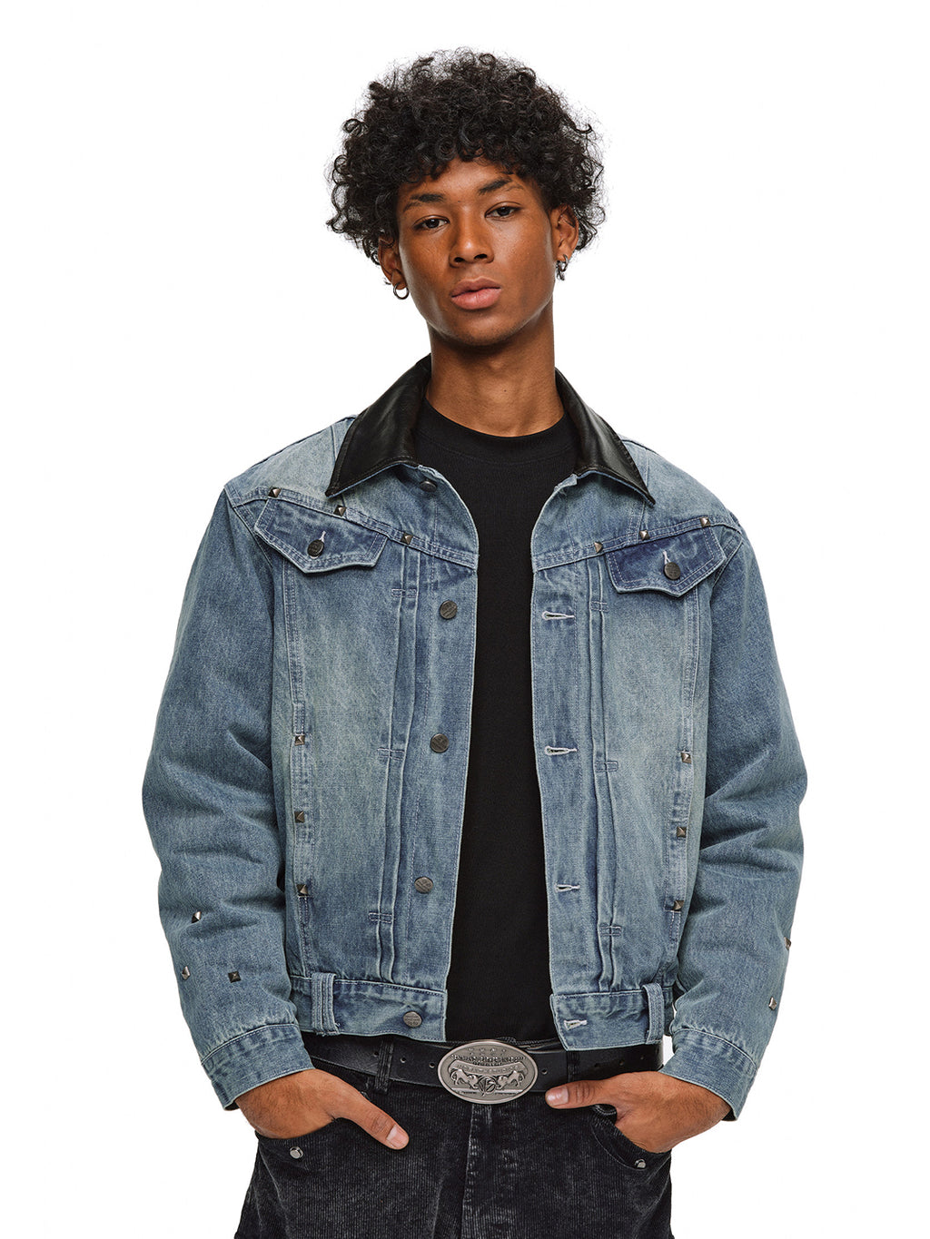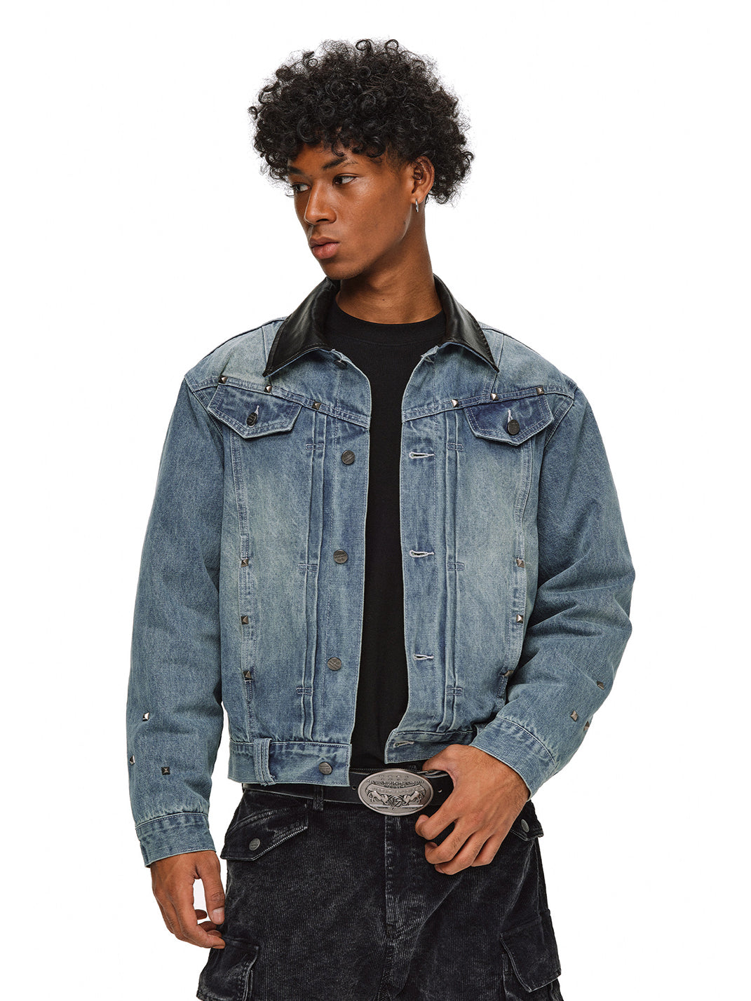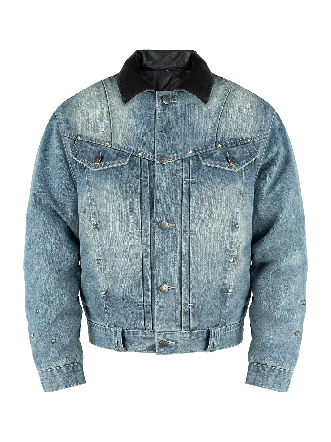 The jacket is adorned with metal studs, creating a striking visual contrast between the cool metallic texture and the retro feel of denim.