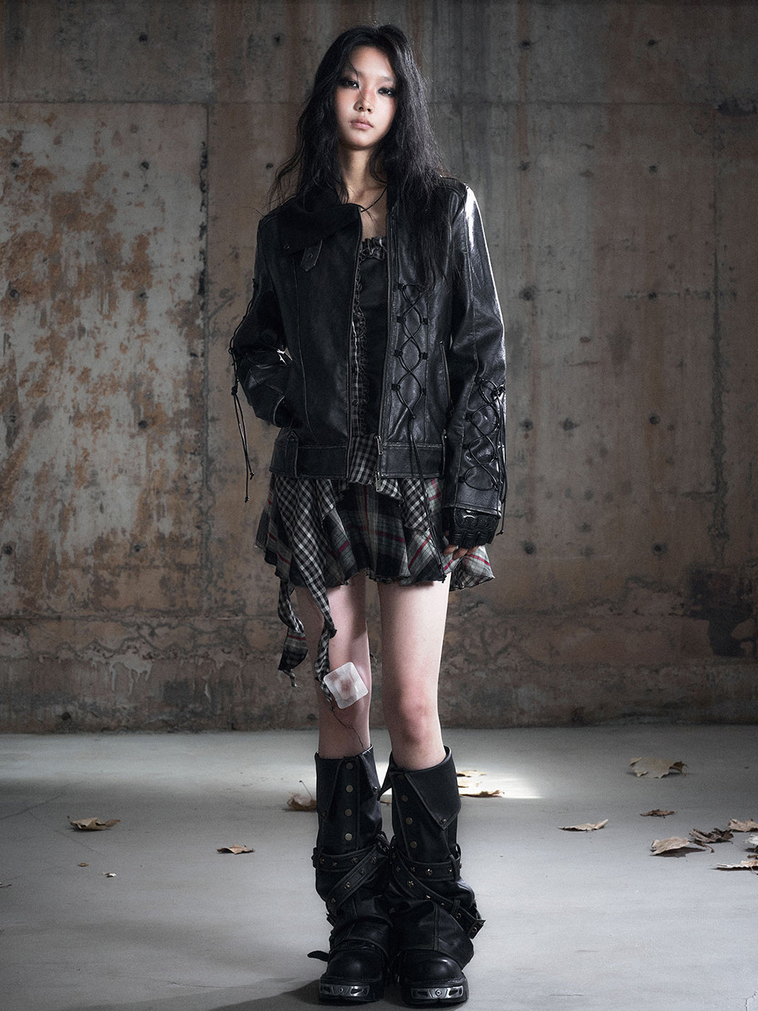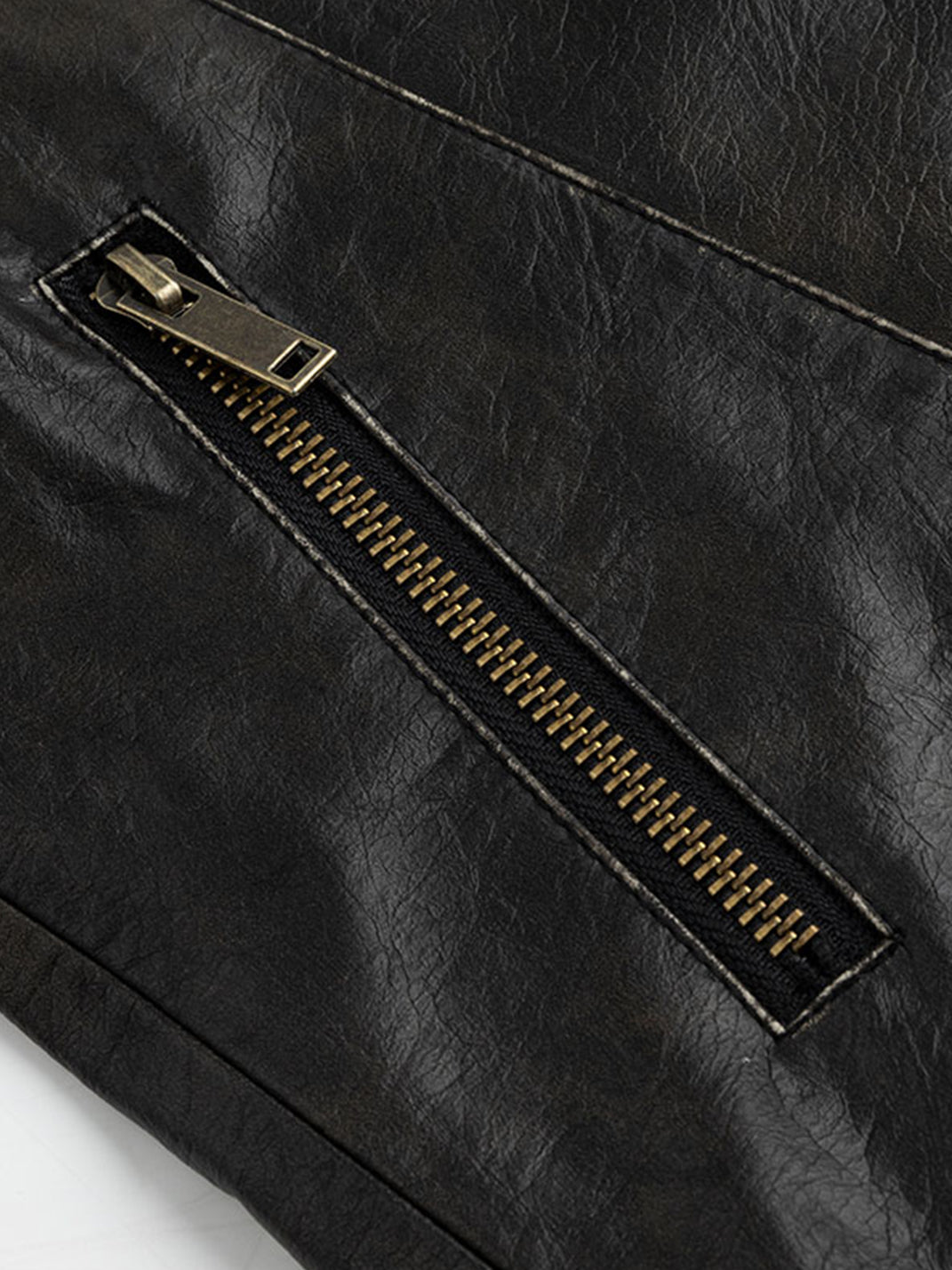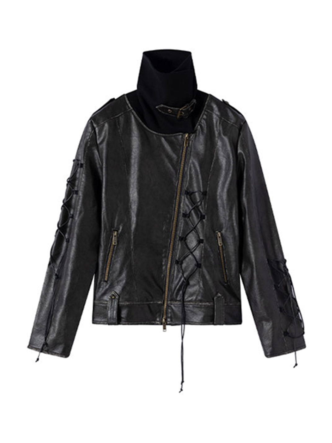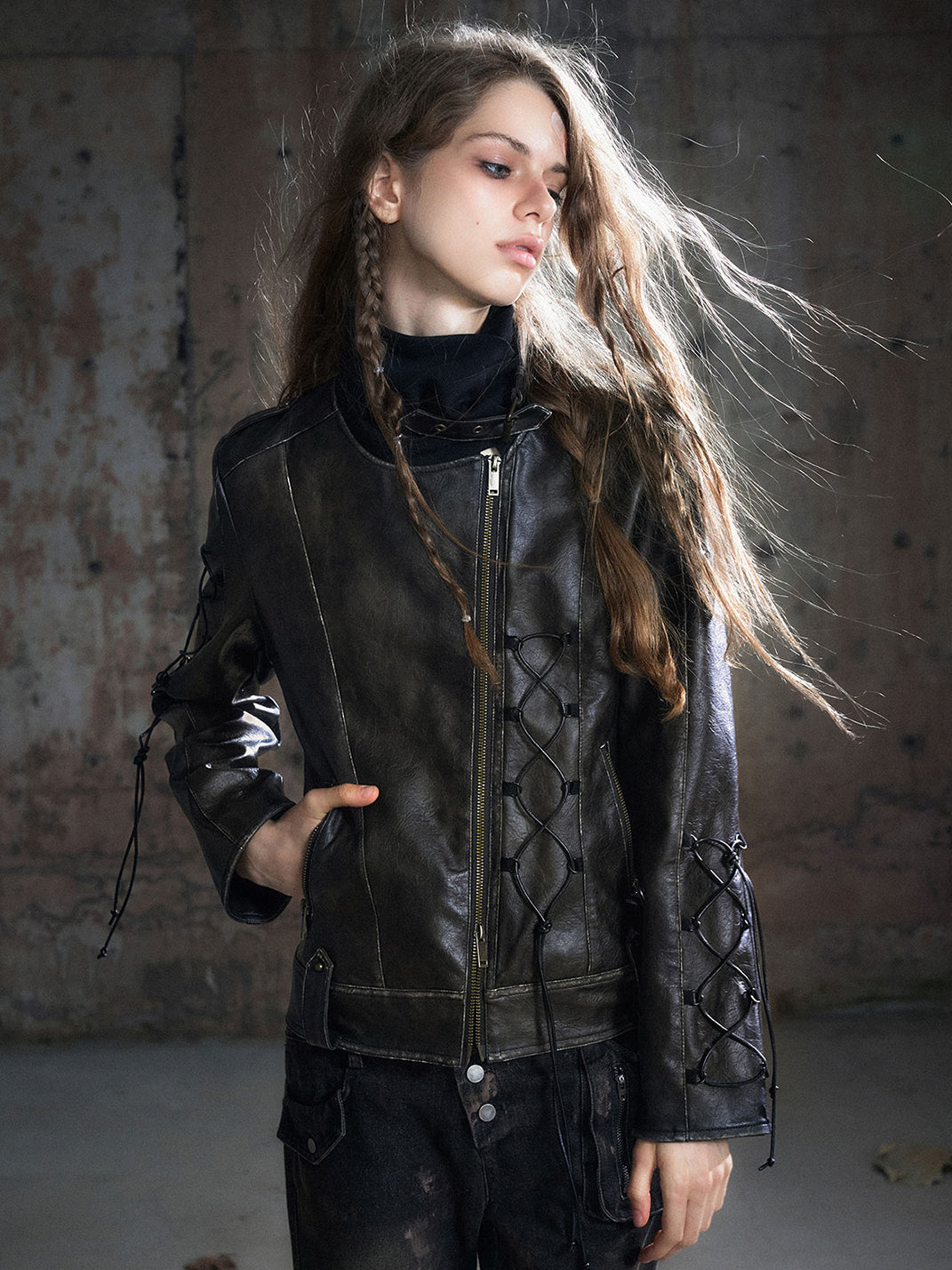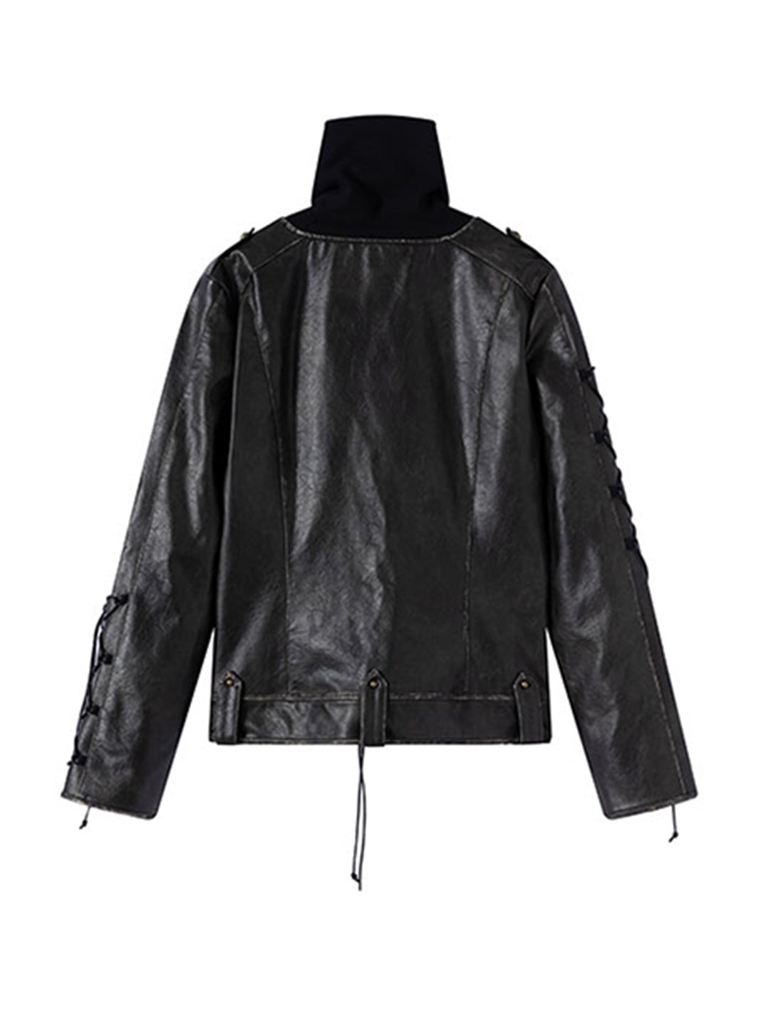 CestNous | Vintage Leather Jacket with Knit High Collar