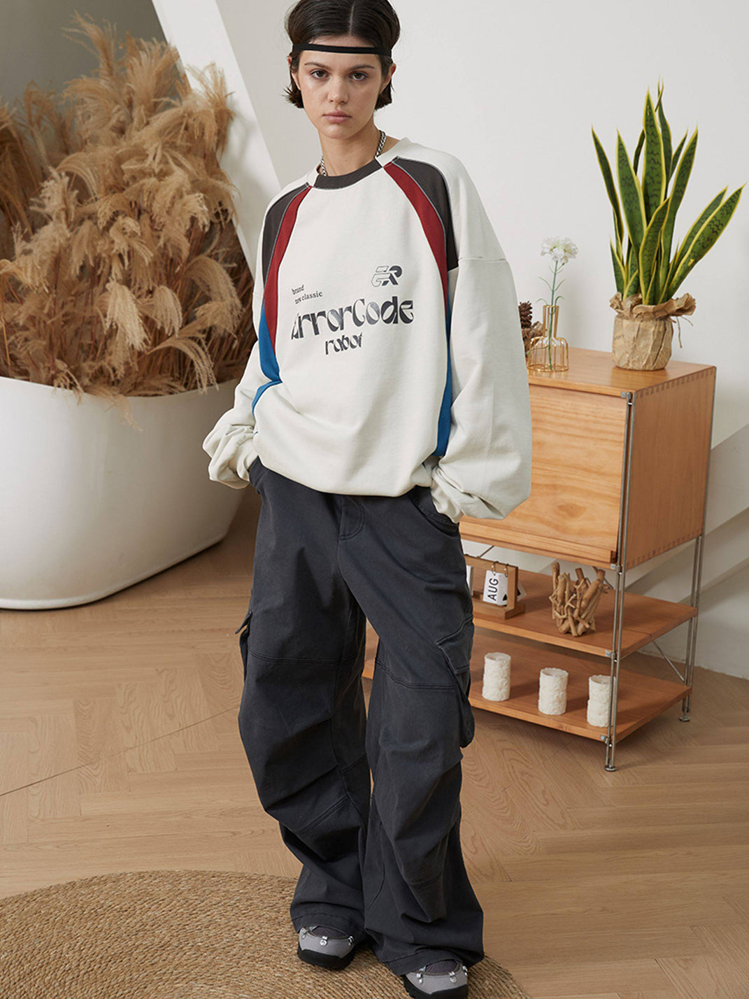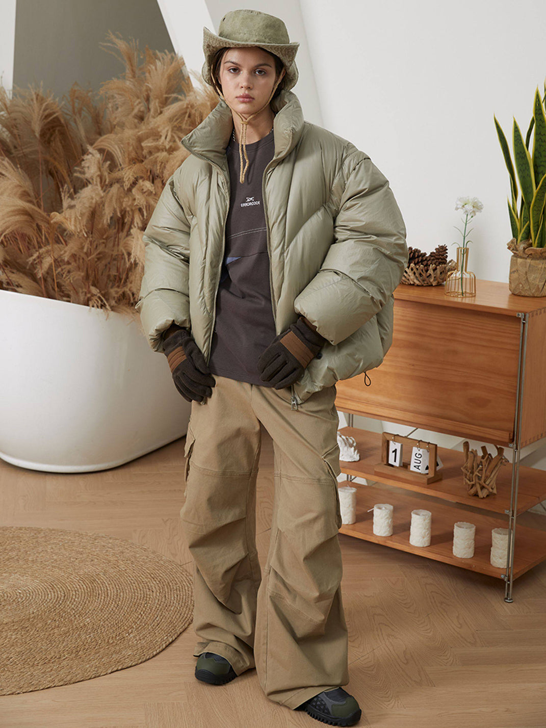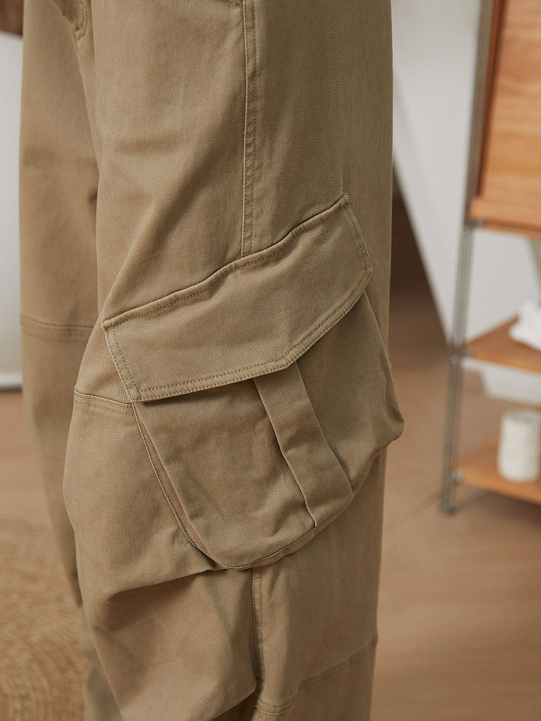 Made from a slightly stretchy twill fabric, the pants have a soft yet substantial feel. The overall design features wide-leg cargo pants with pleats at the knees to enhance the leg's structure and slanted pockets.