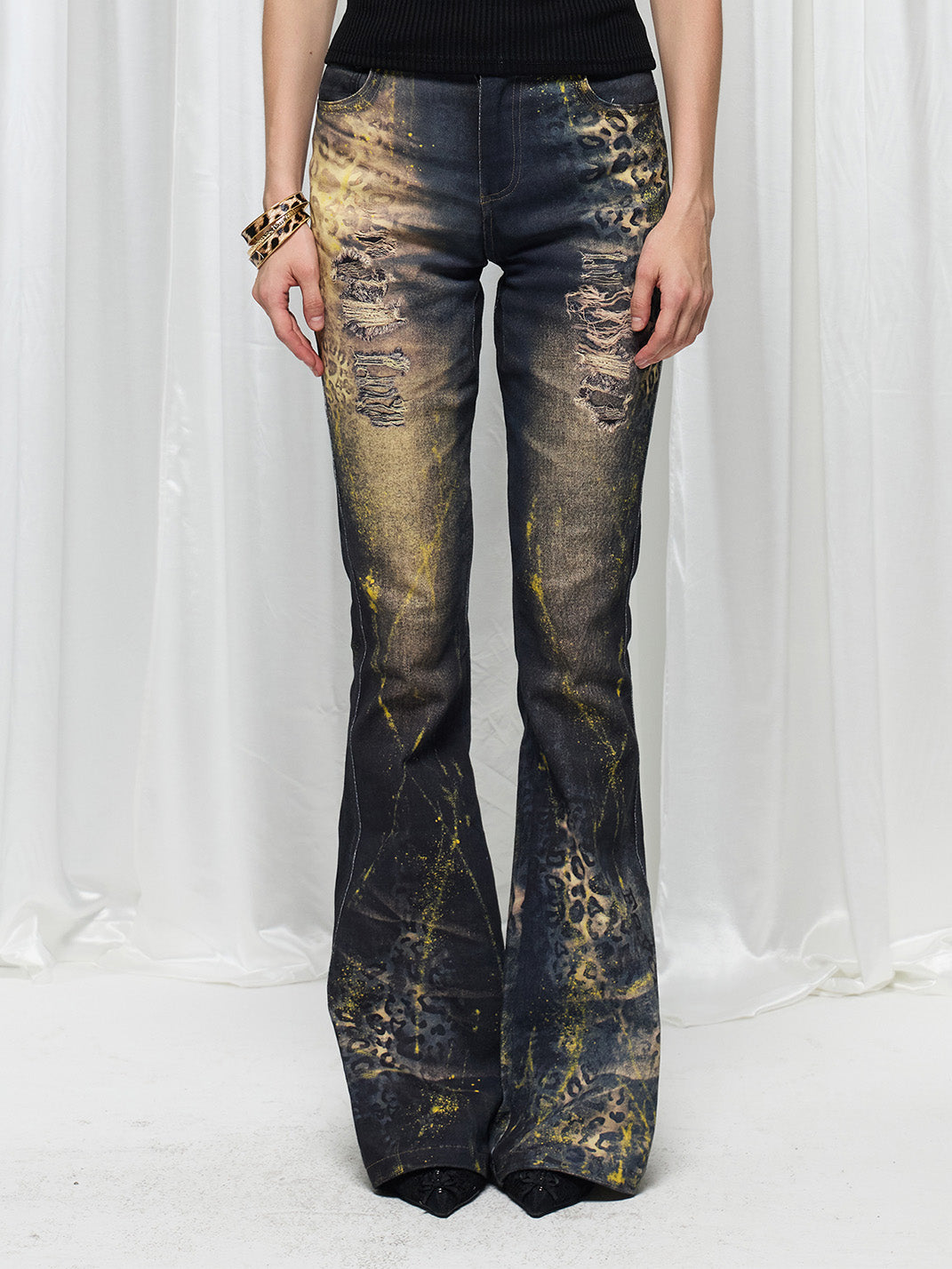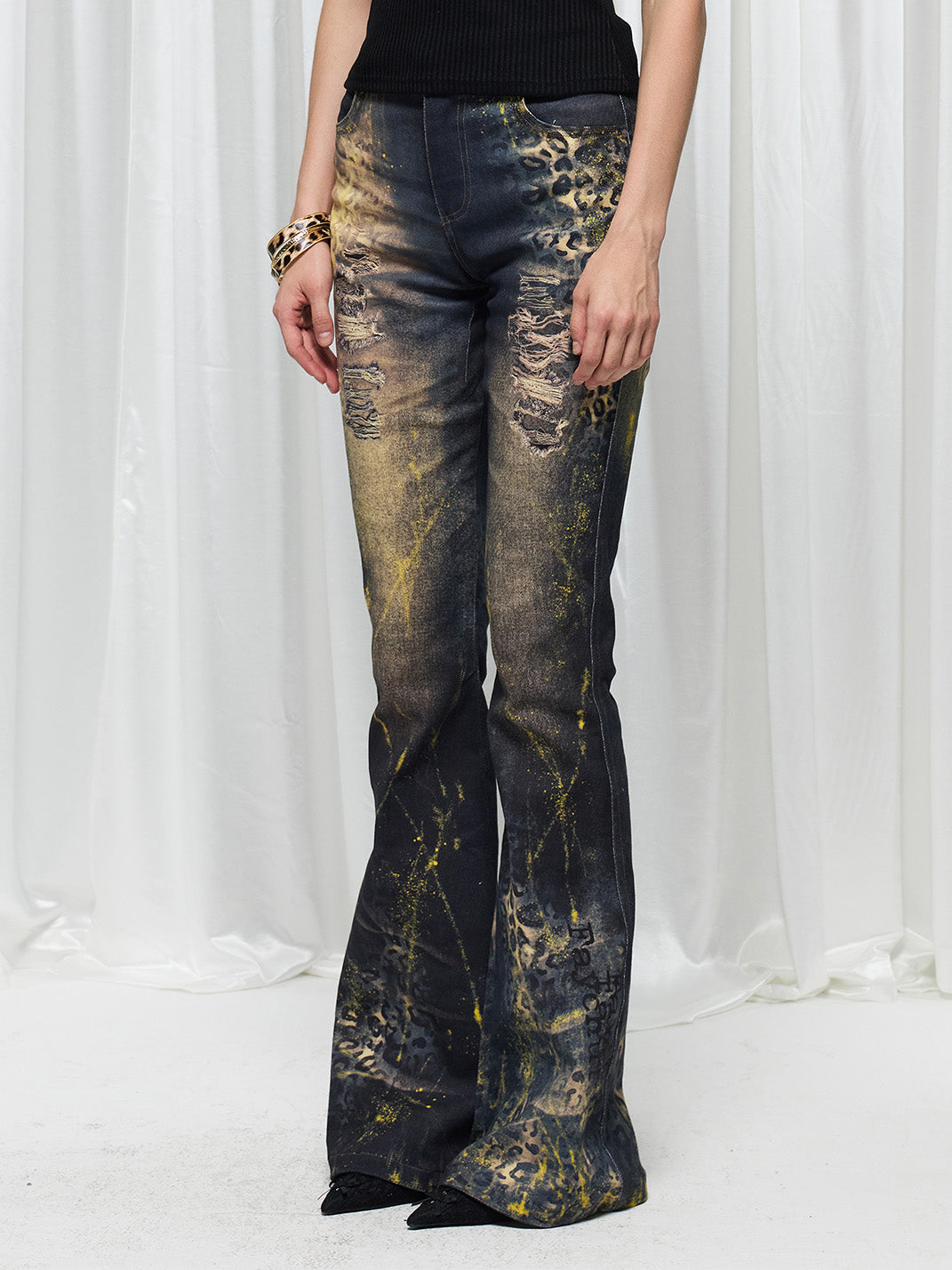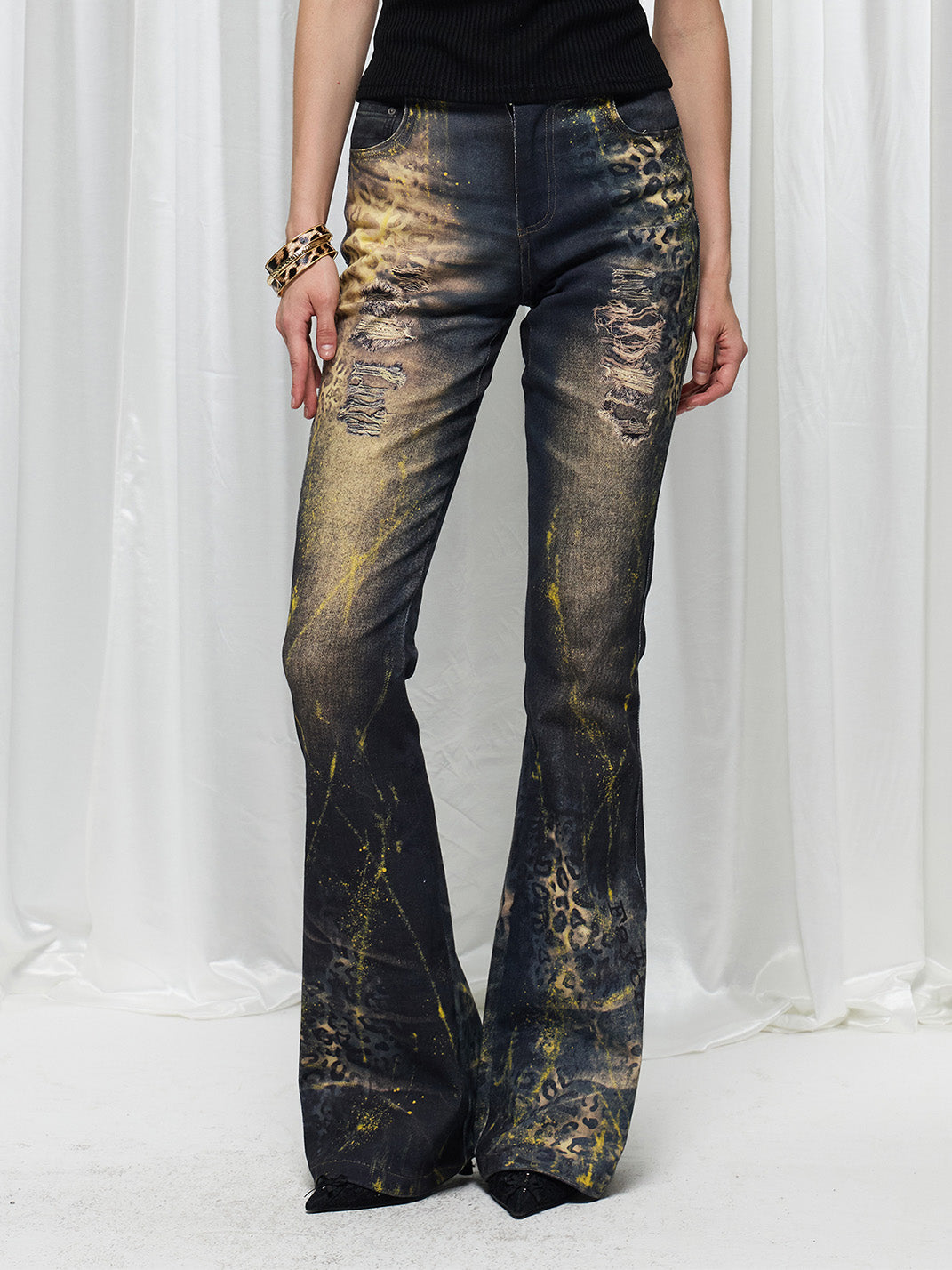 FayChui | Leopard Print Gold Foil Flare Jeans Skip to content
