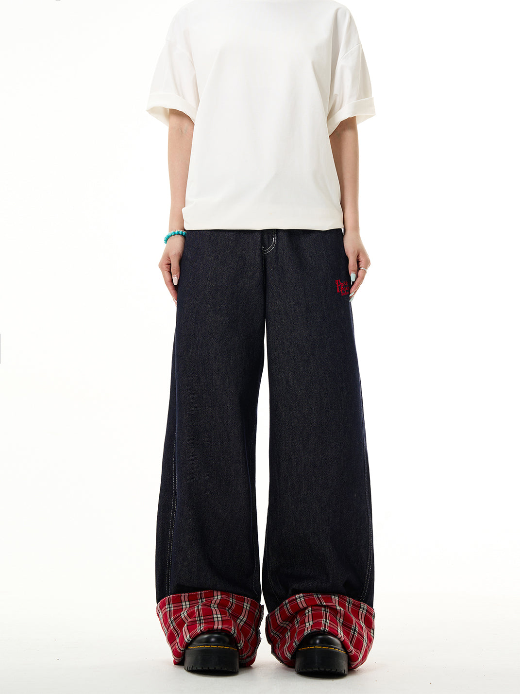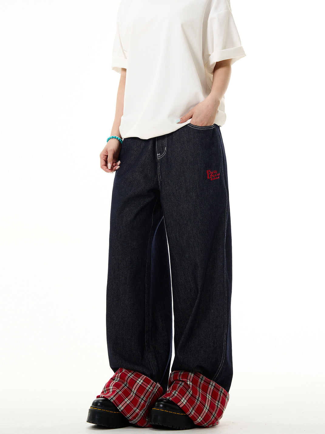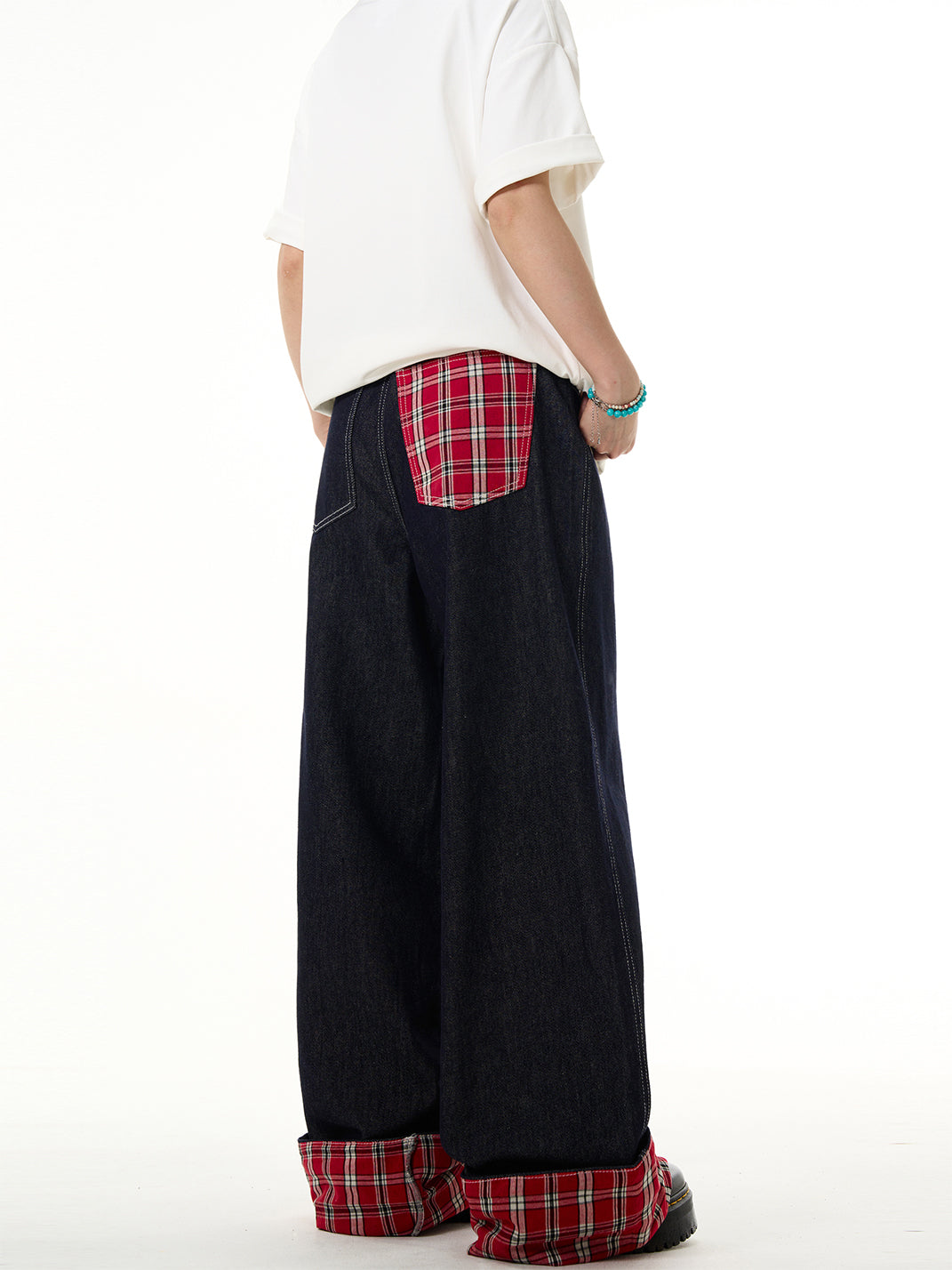FLYOFF | Vintage Plaid Cuffed Denim Wide-Legged Pants Skip to content