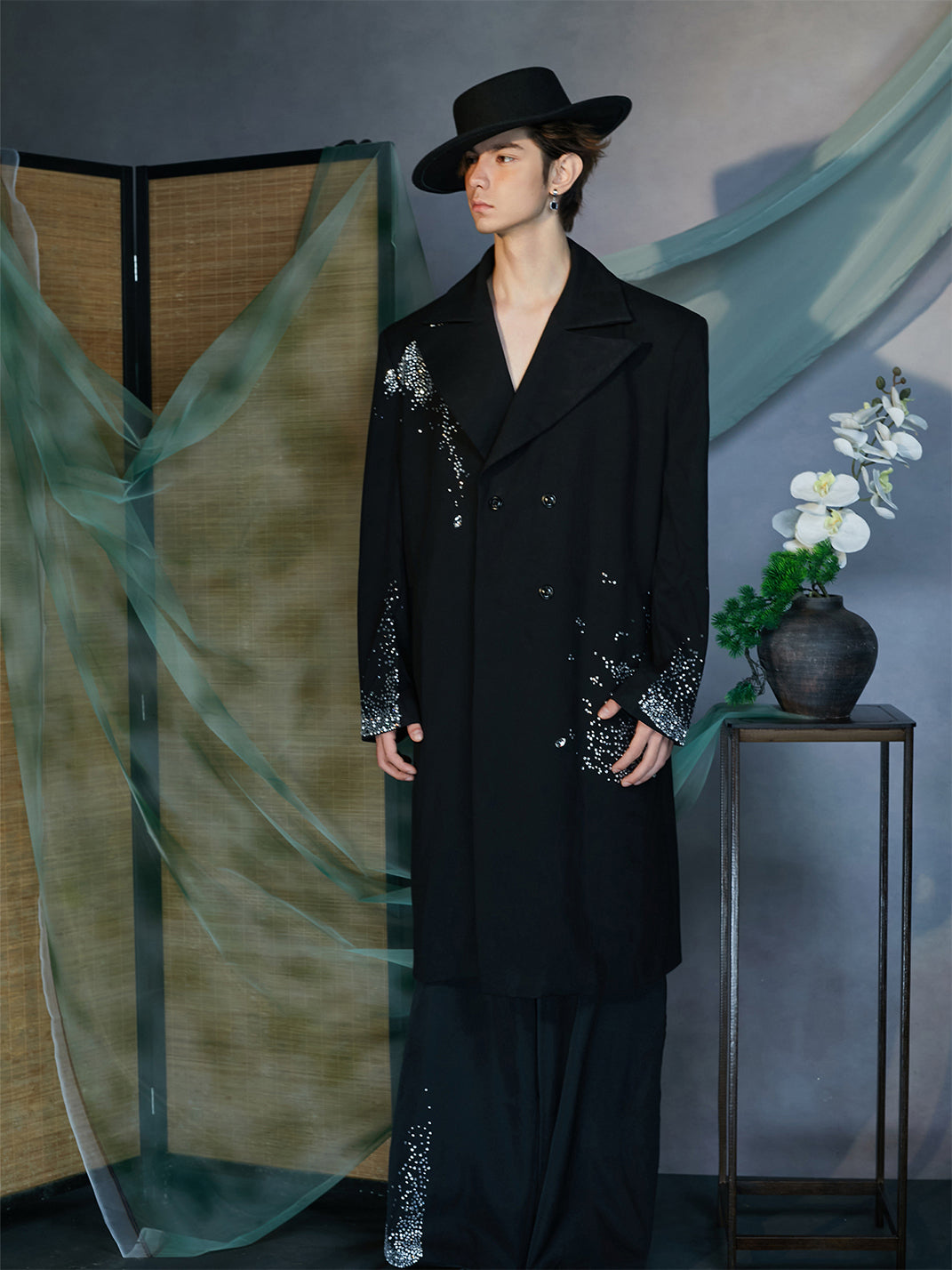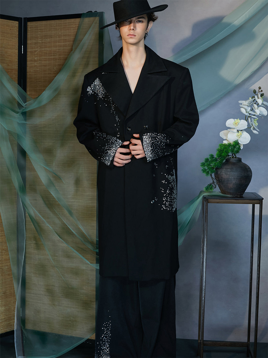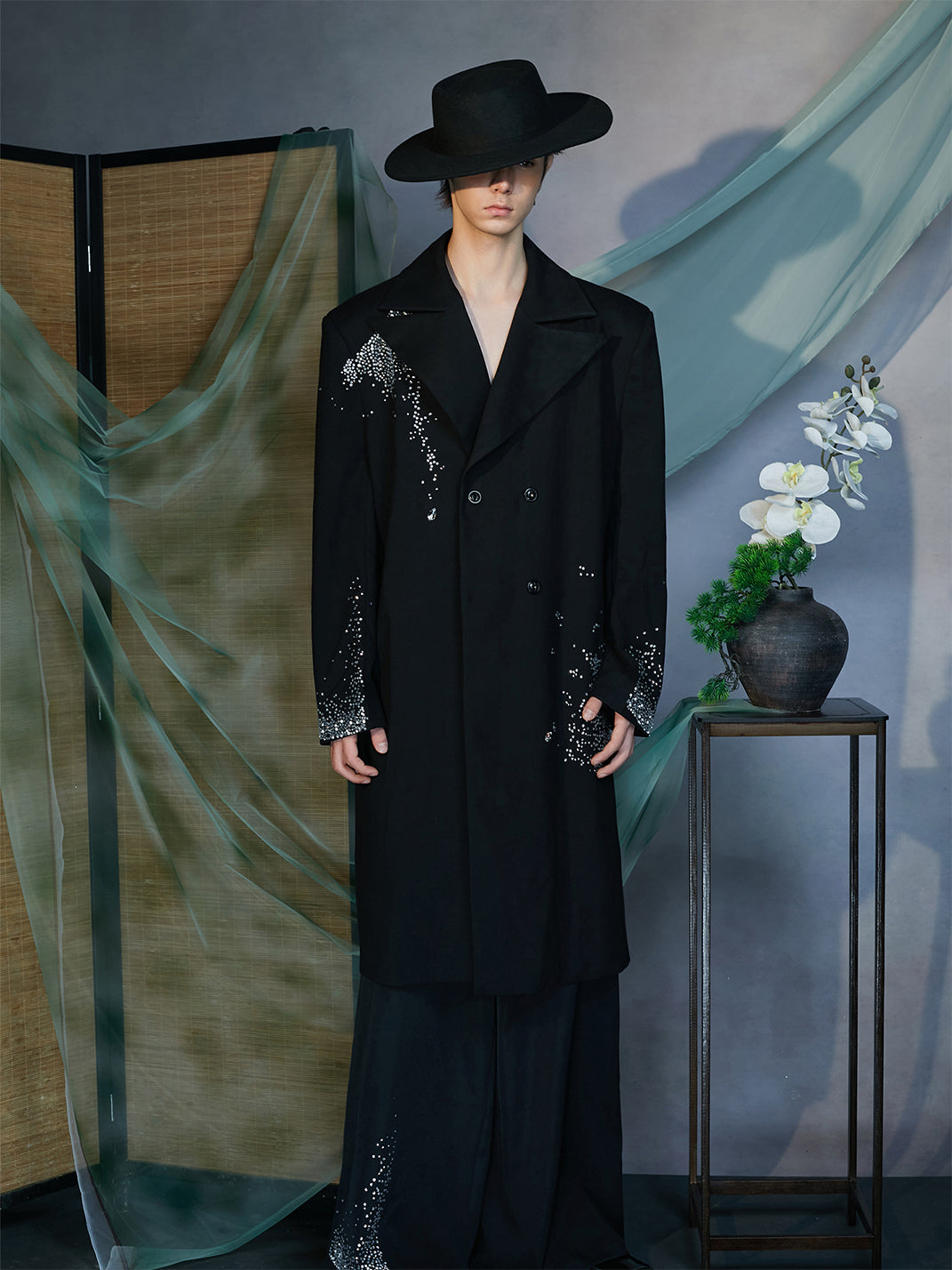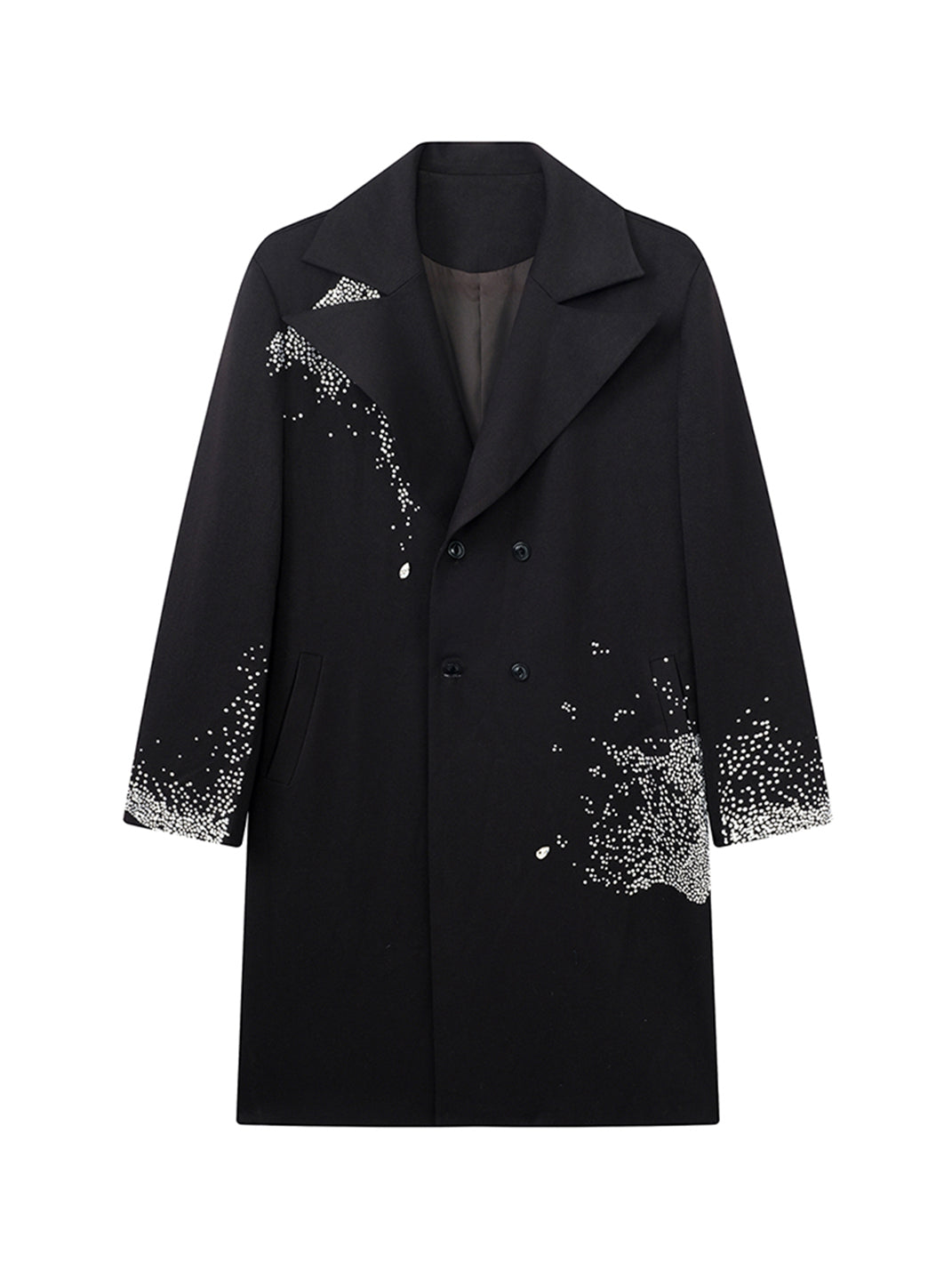 The Diamond Structured Overcoat redefines classic tailoring through a contemporary lens of opulence and precision. Crafted from premium wool-blend fabric, this statement piece features meticulously hand-applied diamond embellishments that scatter across the shoulders, cuffs, and hem like constellations in motion. Its double-breasted construction and sharp lapels exude timeless structure, while the fluid drape of the long silhouette adds dramatic sophistication. Designed to balance strength and elegance, this overcoat elevates any ensemble with an artful sense of luminosity.