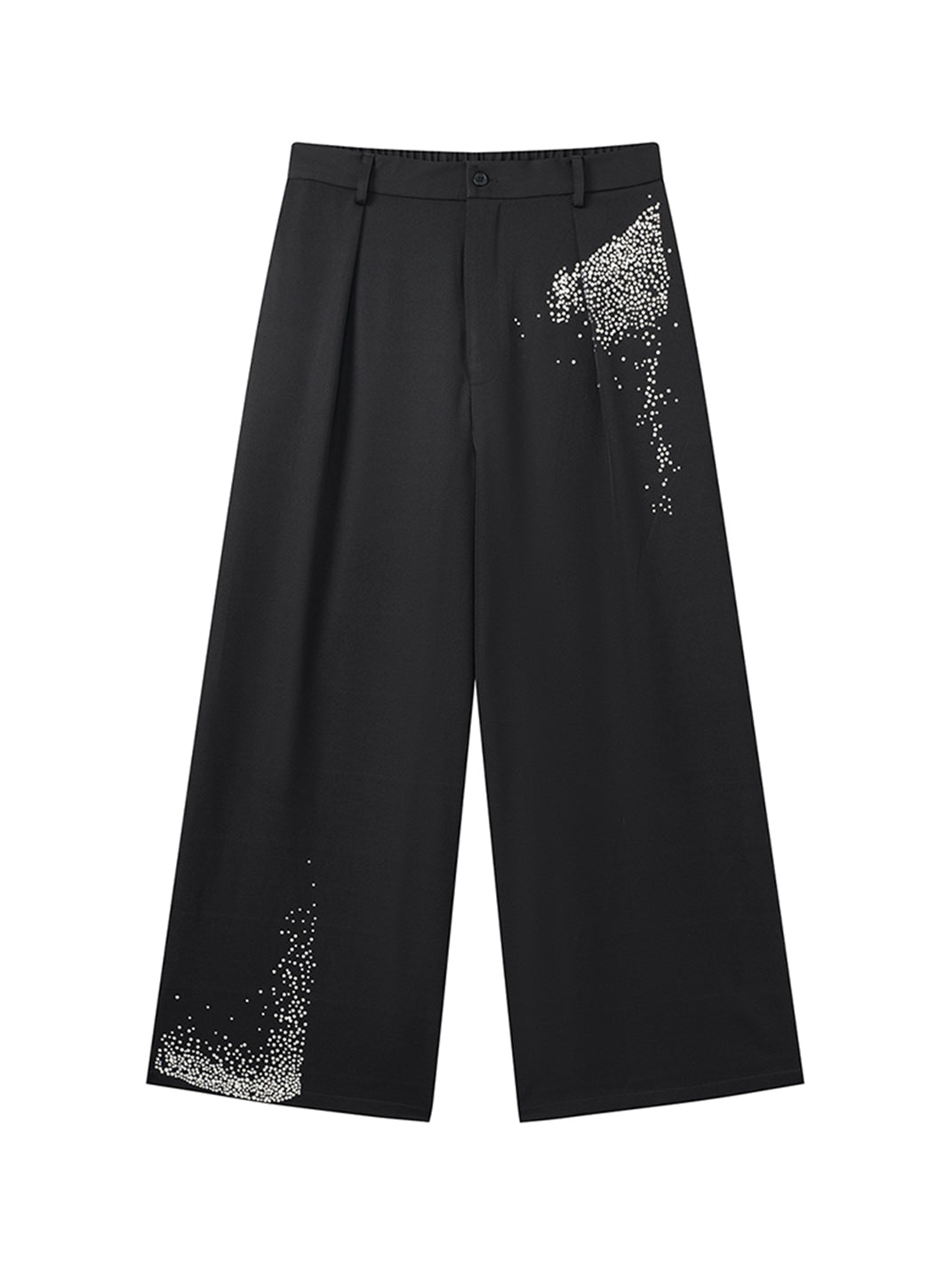 The Diamond Wide-Leg Pants combine refined tailoring with modern statement detailing. Crafted from a premium fabric blend of 90% pure cotton and 10% polyester, they feature a relaxed wide-leg silhouette with a mid-rise waist for effortless comfort. The standout detail comes from hand-applied rhinestone embellishments at the hip and hem, creating a sparkling gradient effect that evokes the imagery of falling stars. A balance of elegance and streetwear edge, perfect for both casual and elevated styling.