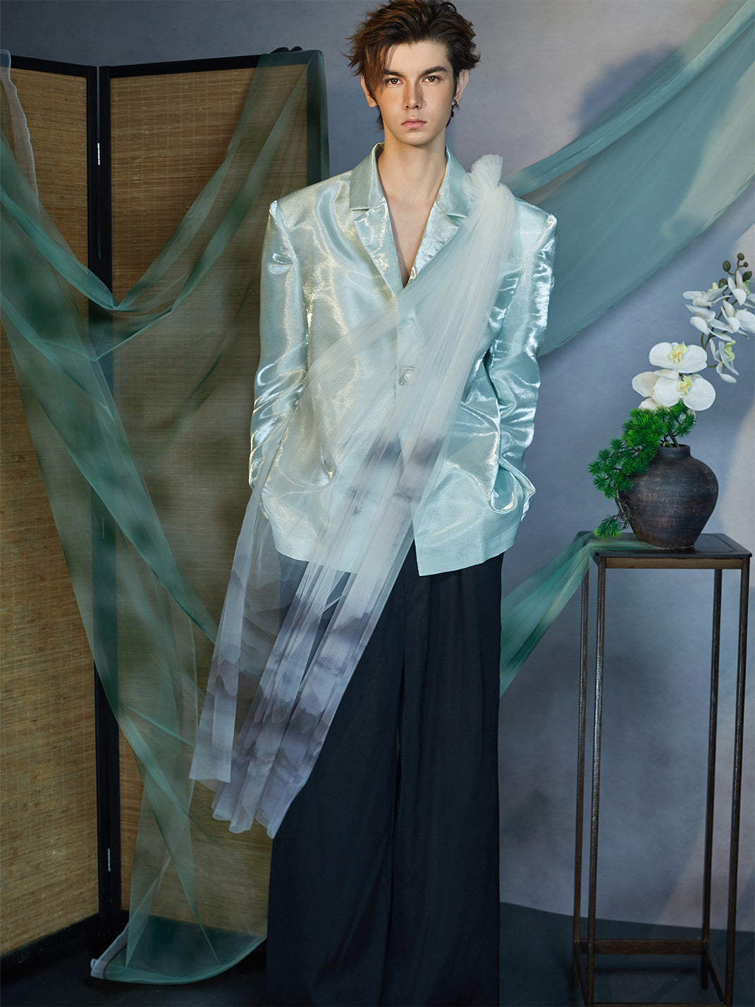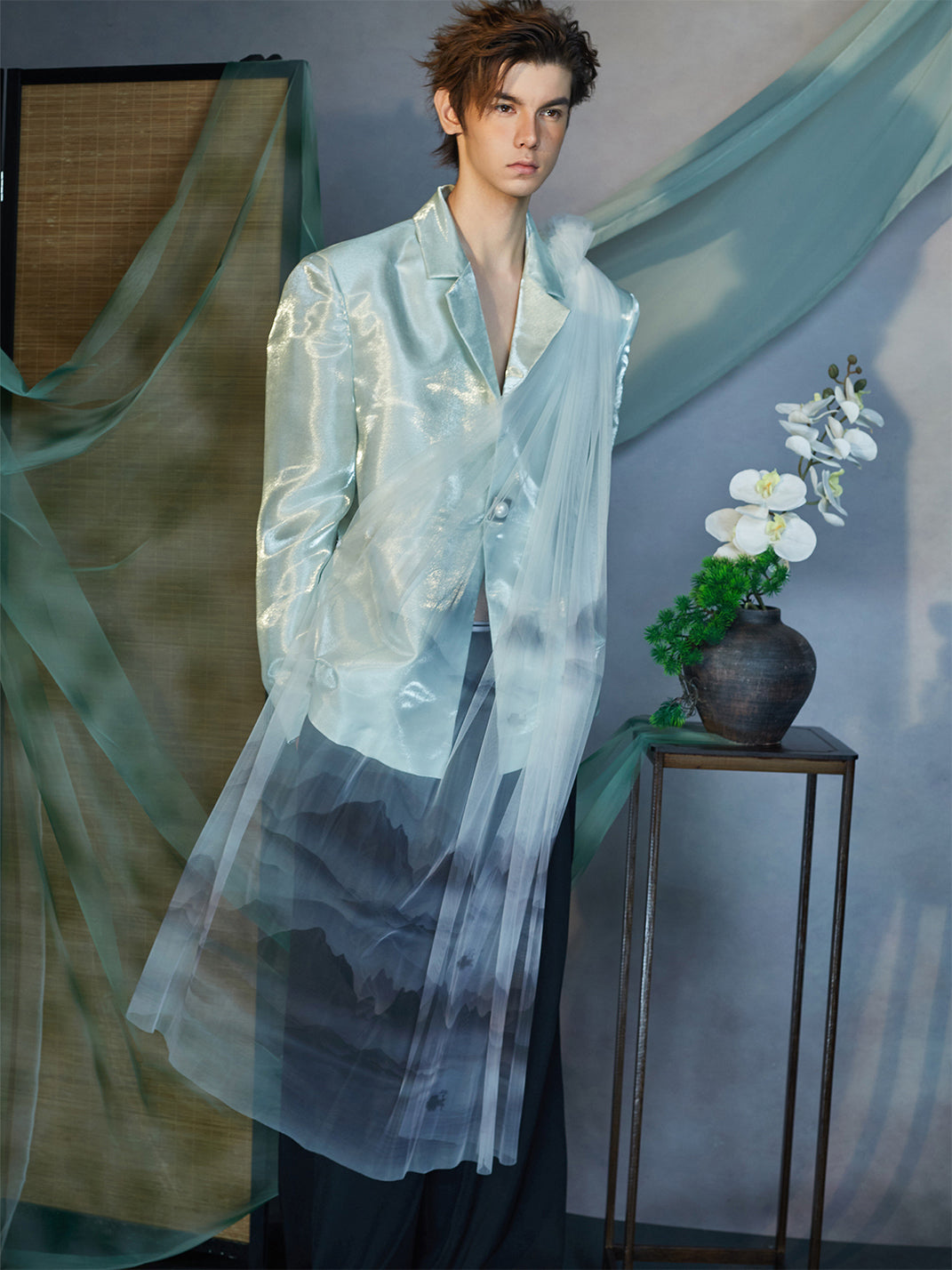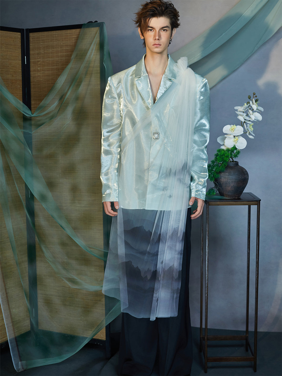 The Gradient Tulle Drape Satin Blazer captures a poetic blend of structure and fluidity, merging contemporary tailoring with ethereal artistry. Crafted from premium satin fabric, its luminous mint tone reflects light with a glass-like sheen, while a sheer gradient tulle overlay cascades from the shoulder to the hem, evoking mist drifting across painted landscapes. The single-button closure and sharp lapels ground the delicate composition, balancing transparency with architectural precision. This piece stands at the intersection of modern design and dreamlike expression.