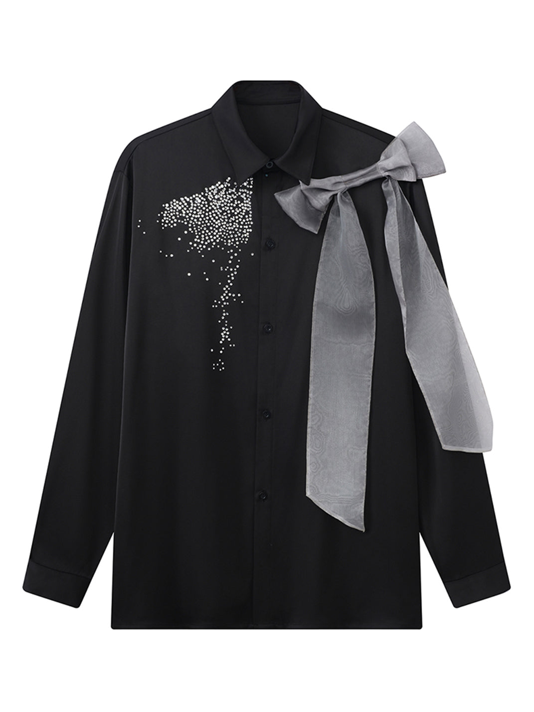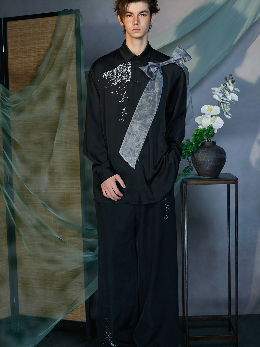 The Organza-Bow & Diamond Shirt blends refined tailoring with artistic detailing. Crafted from premium imported suiting fabric, it features a relaxed long-sleeve silhouette elevated by hand-applied rhinestones across the chest, creating a constellation-inspired shimmer. A voluminous sheer organza bow drapes from the shoulder, adding a dramatic, ethereal touch. Each detail is carefully executed with artisanal construction, balancing sophistication and avant-garde design.