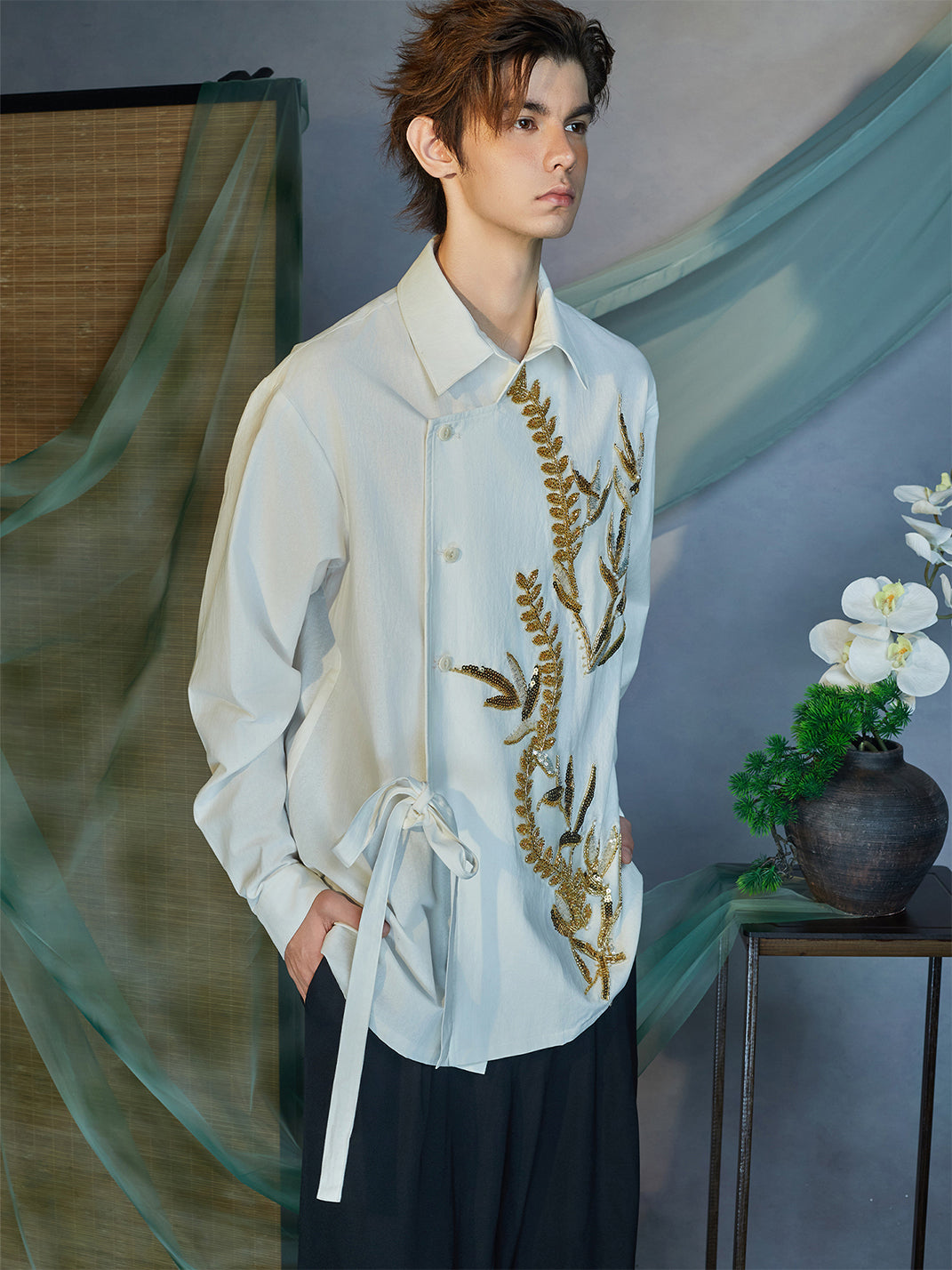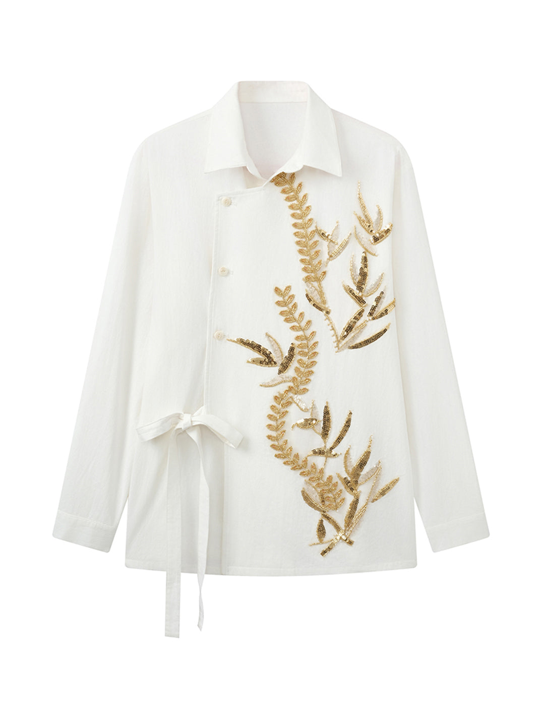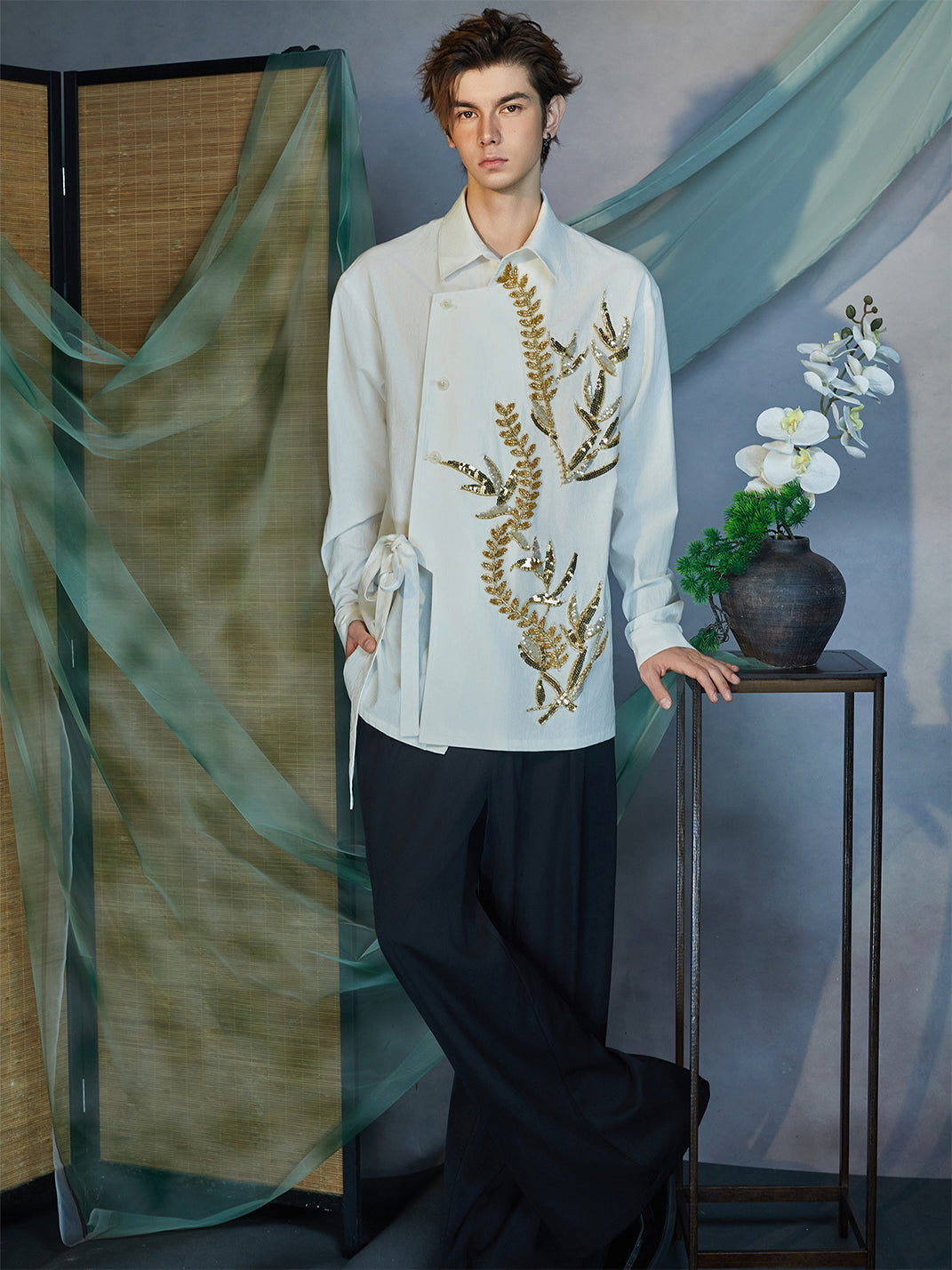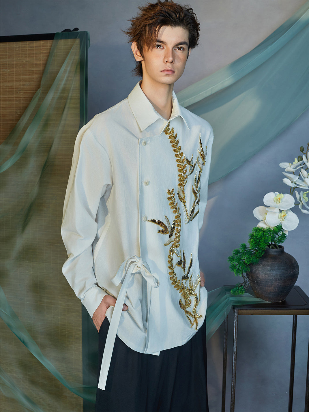The Leaf Embroidered Asymmetrical Wrap Shirt fuses modern tailoring with refined artisanal details. Cut from premium imported embroidered fabric, it features an asymmetrical wrap-front secured with side ties, bringing both fluidity and structure. Gold-tone leaf embroidery cascades across the chest in an ornate pattern, creating a bold yet elegant visual statement. The relaxed oversized silhouette ensures effortless layering and versatility, making it a standout piece that bridges contemporary style with timeless sophistication.