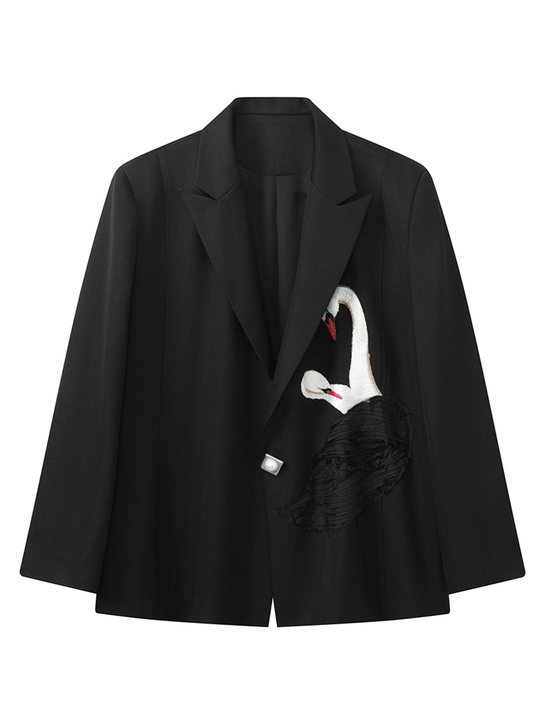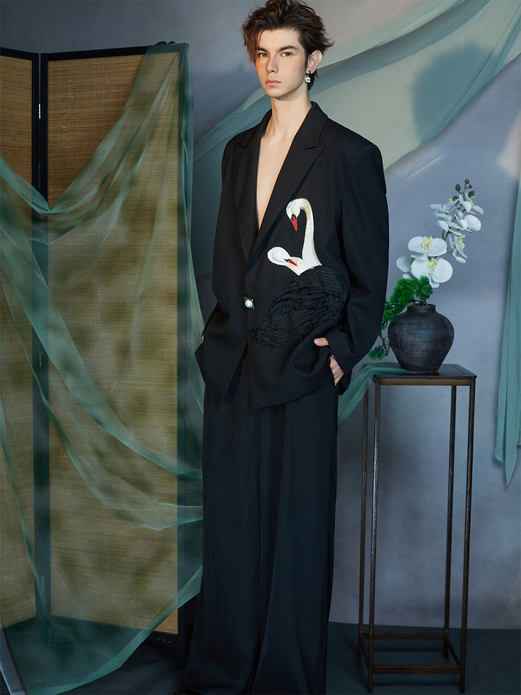 The Swan Embroidered Pearl Button Blazer combines classic tailoring with romantic artistry. Crafted from premium imported suiting fabric, it features an oversized silhouette with clean, flowing lines. The standout detail is the hand-embroidered swan motif at the chest, enhanced by textural fabric layering for added depth and elegance. A single pearl button fastening provides a refined finishing touch, balancing contemporary minimalism with intricate craftsmanship. Perfect as a statement outerwear piece, it embodies sophistication with a poetic edge.