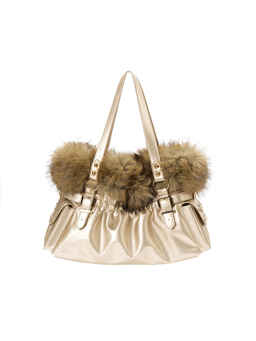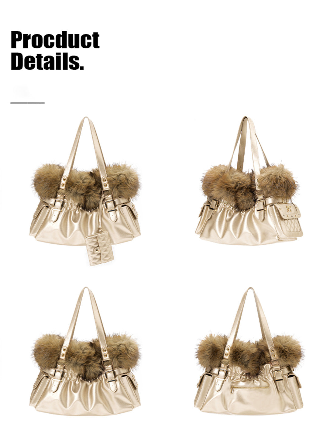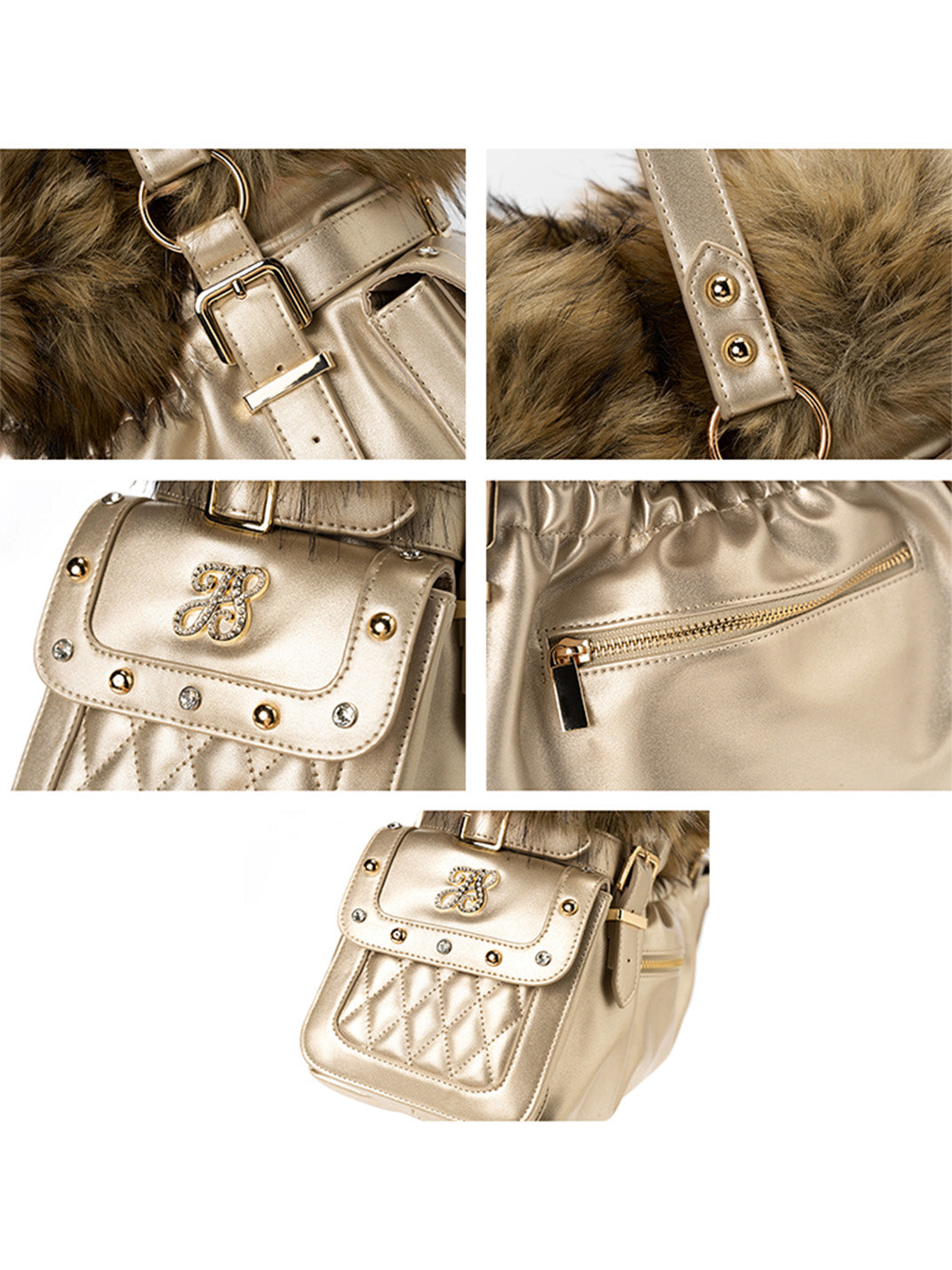 This design features a luxurious combination of champagne gold PU leather and tri-color faux fox fur, offering a soft and voluminous texture that exudes elegance and warmth. The bag closes with a magnetic clasp for convenience and ease. Structured side pockets with gold hardware, rivet, and crystal accents create a bold yet refined aesthetic. The elastic ruched body adds dimension while maintaining practicality with interior compartments. Equipped with adjustable dual straps, it can be worn as a shoulder or backpack. Optional accessories include a faux fur tail charm with a gold heart pendant and a matching champagne gold mini wallet, adding a touch of sophistication to the ensemble.