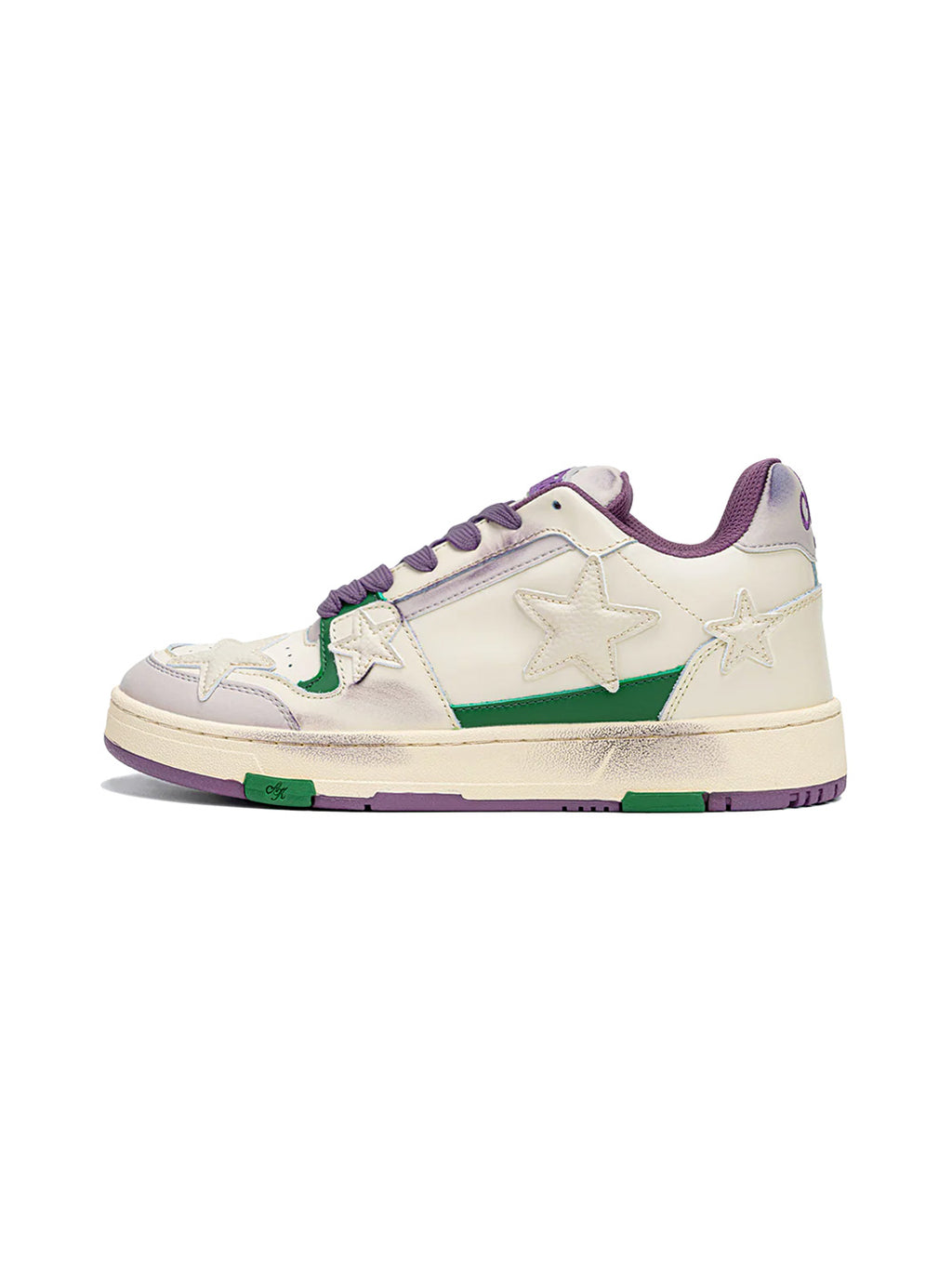 Using star design as the main focus, elements are applied to the shoes. The distressed elements of purple star shoes run through the entire shoe body, and different patterns are manually rubbed to echo the upper. Each pair of shoes has a unique design style.