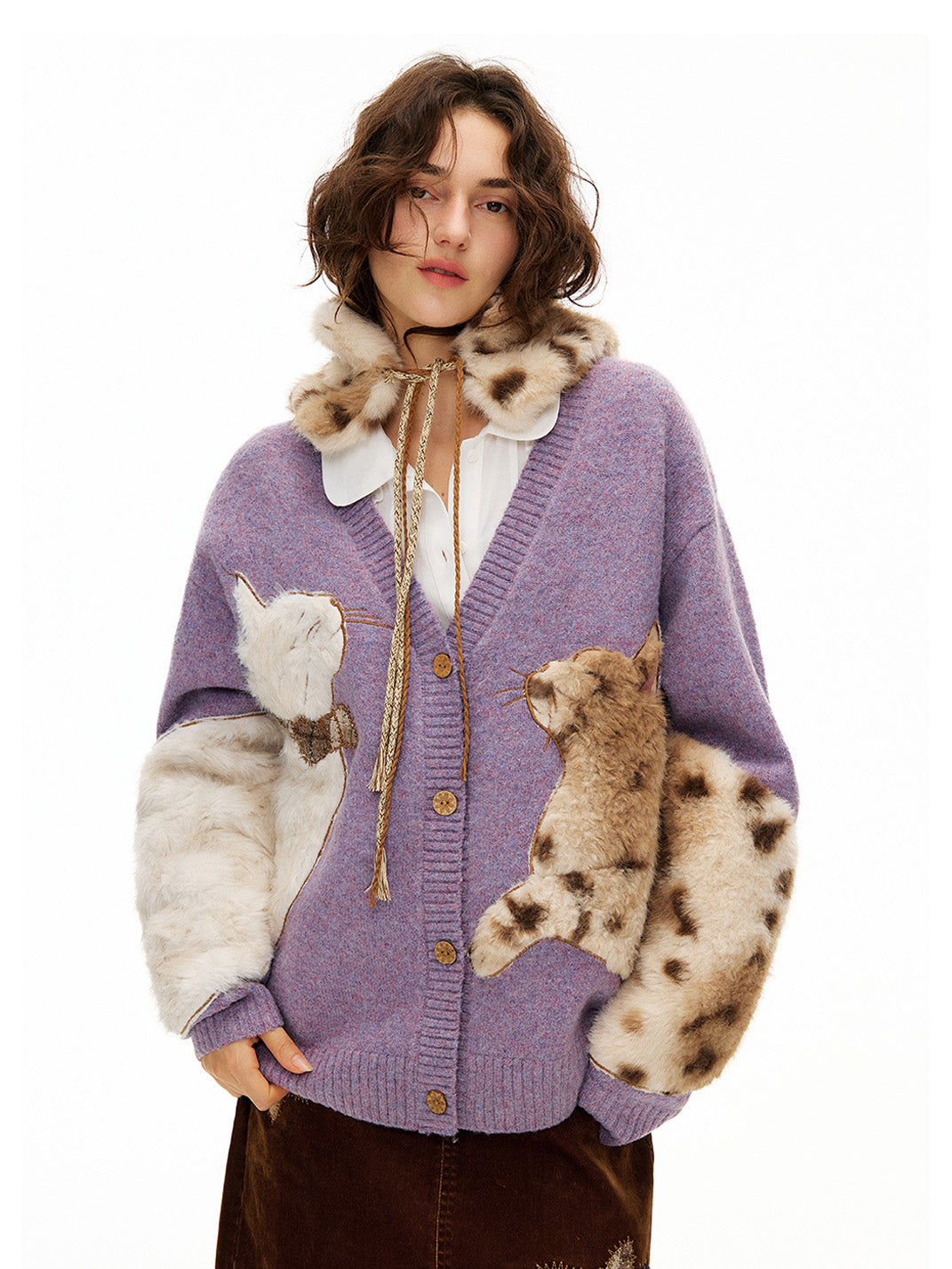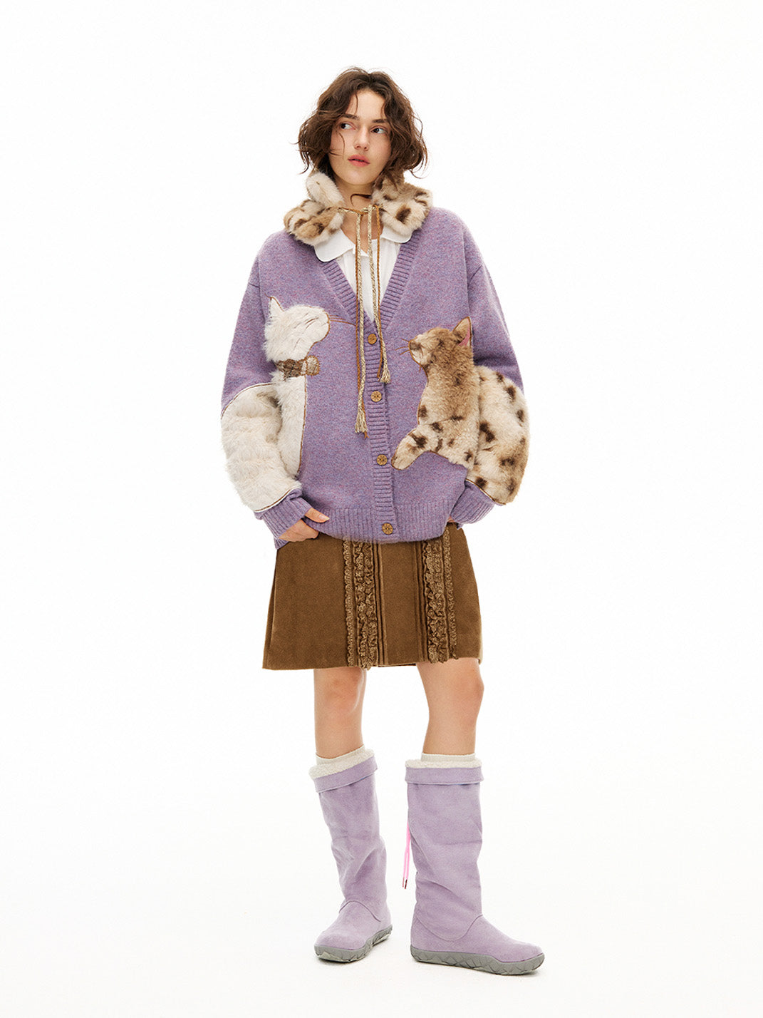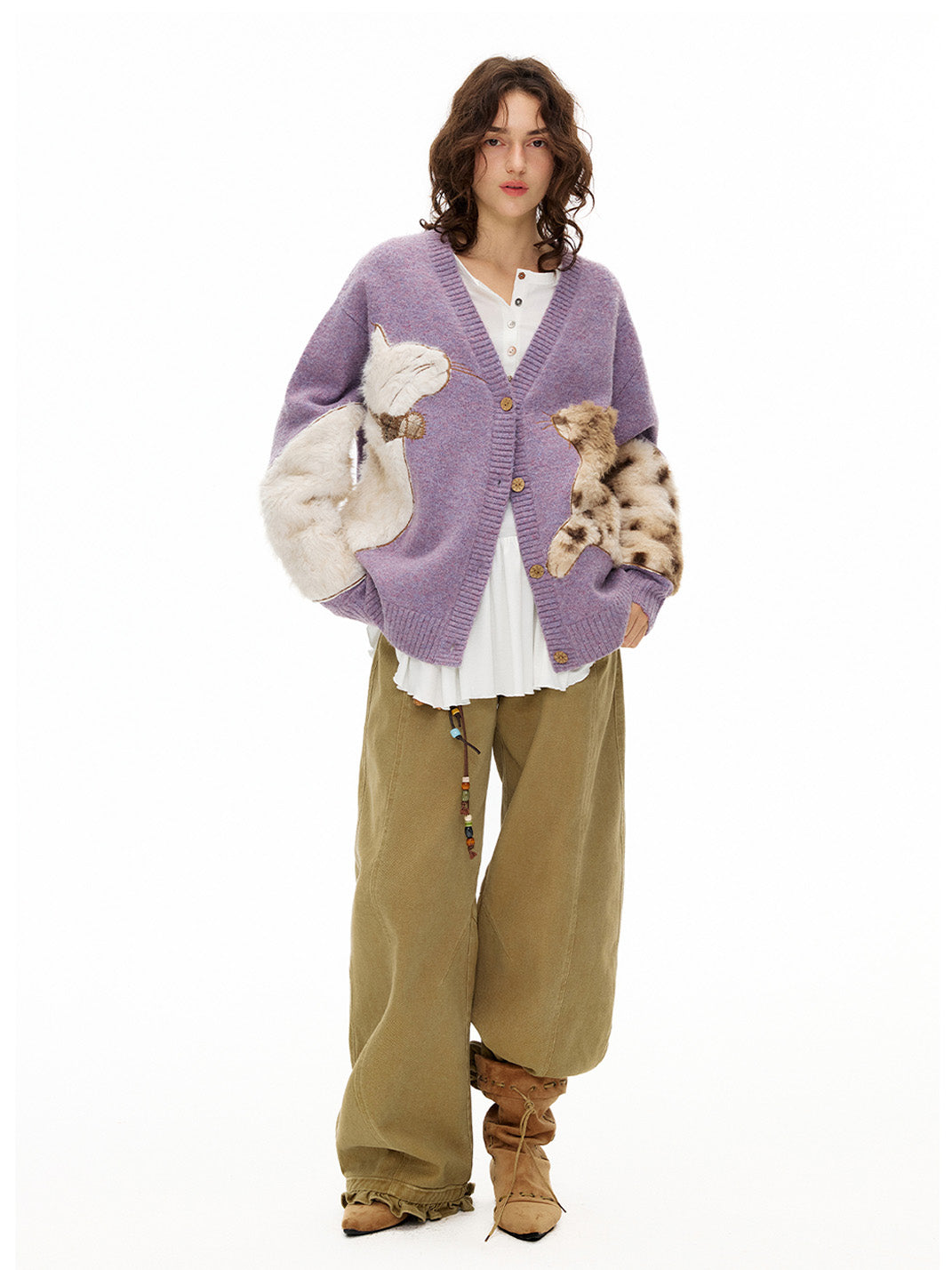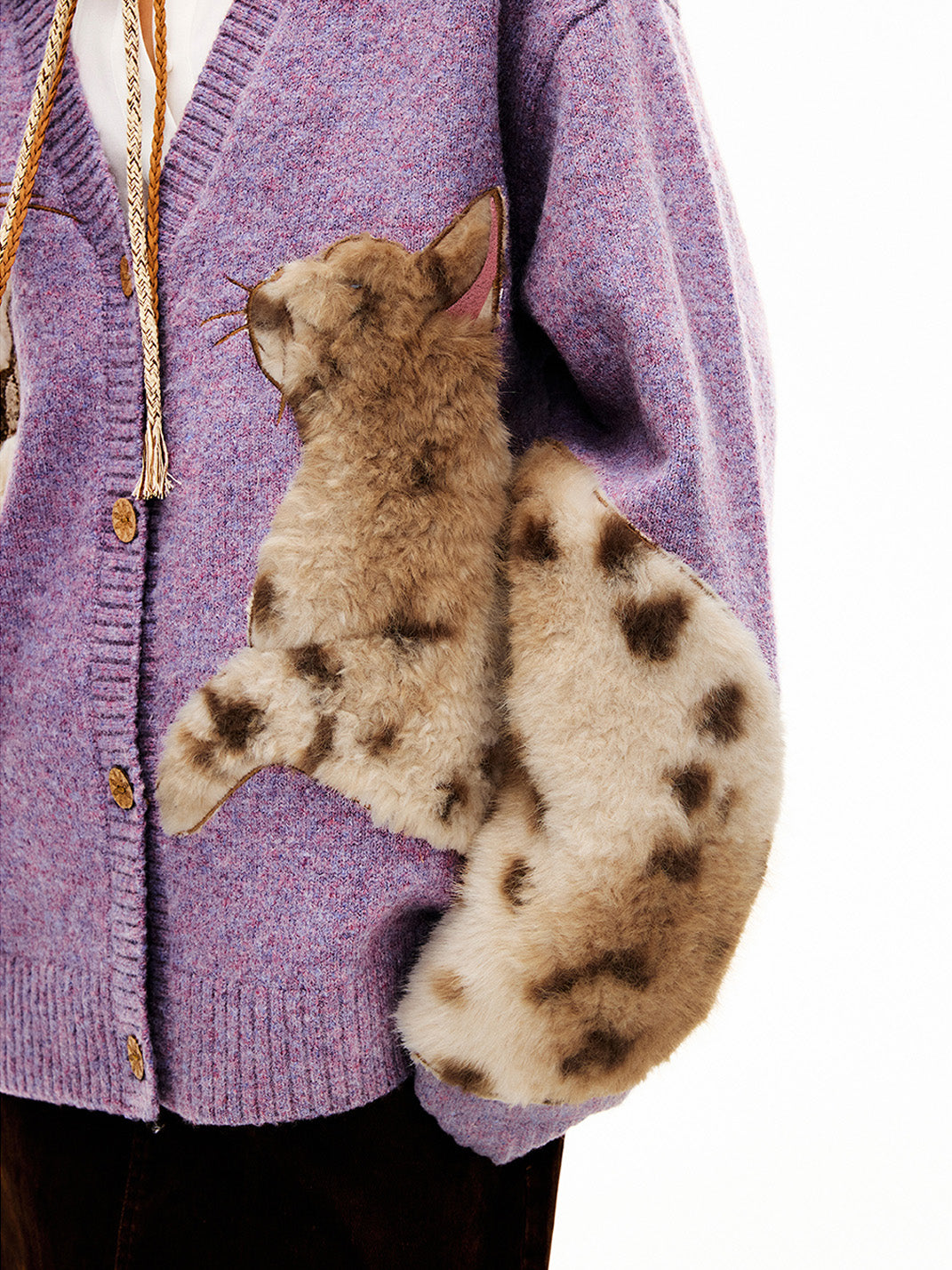 This cardigan features a relaxed, laid-back silhouette in a taro purple hue, creating a warm and romantic atmosphere. The V-neck with wooden buttons adds a touch of natural simplicity, while the clean lines of the front contribute to a relaxed and casual look. The most striking feature is the 3D cat appliqué design on both sides of the front: crafted from flocked eco-friendly fur fabric, it's soft to the touch and vividly three-dimensional.