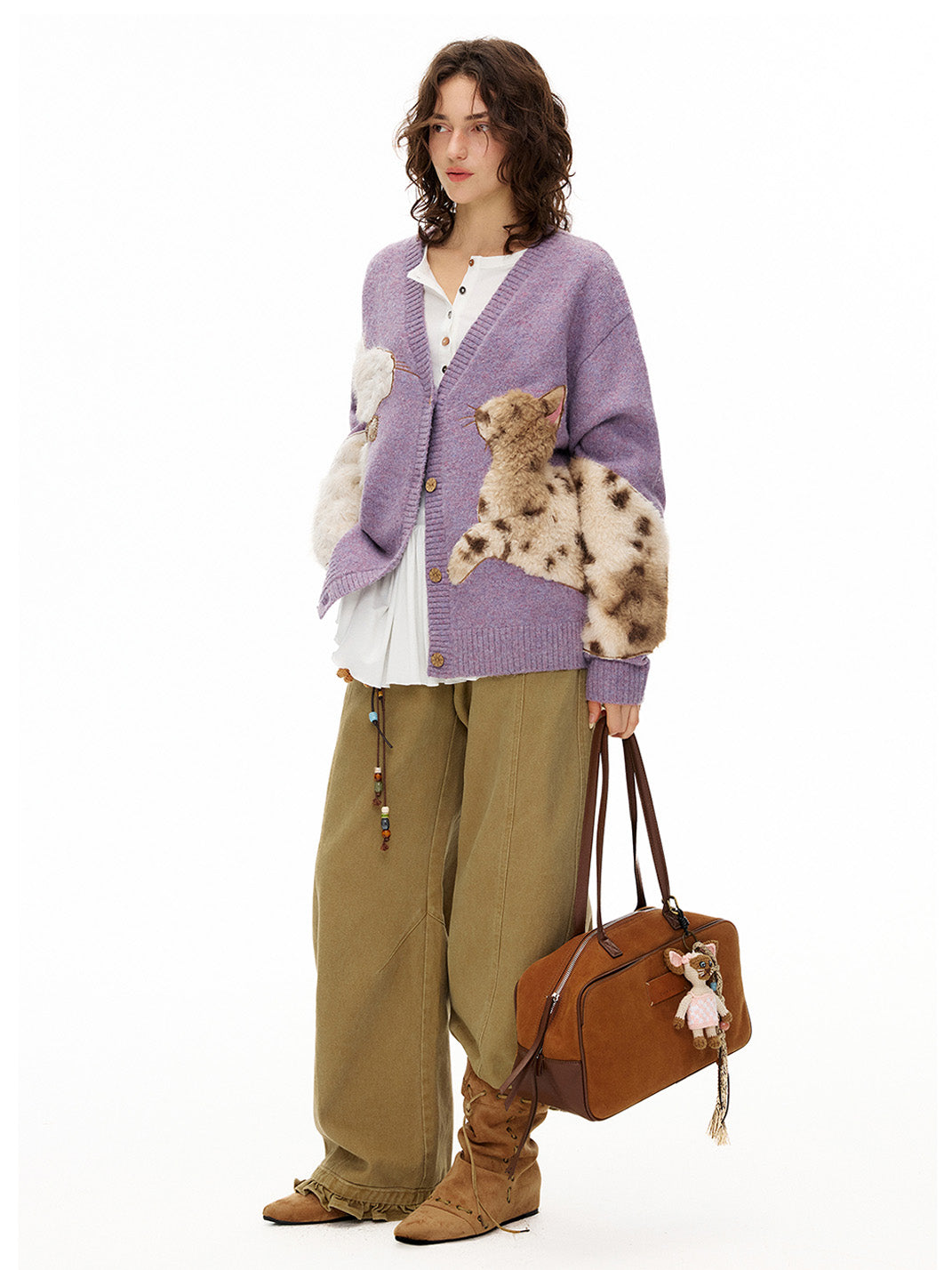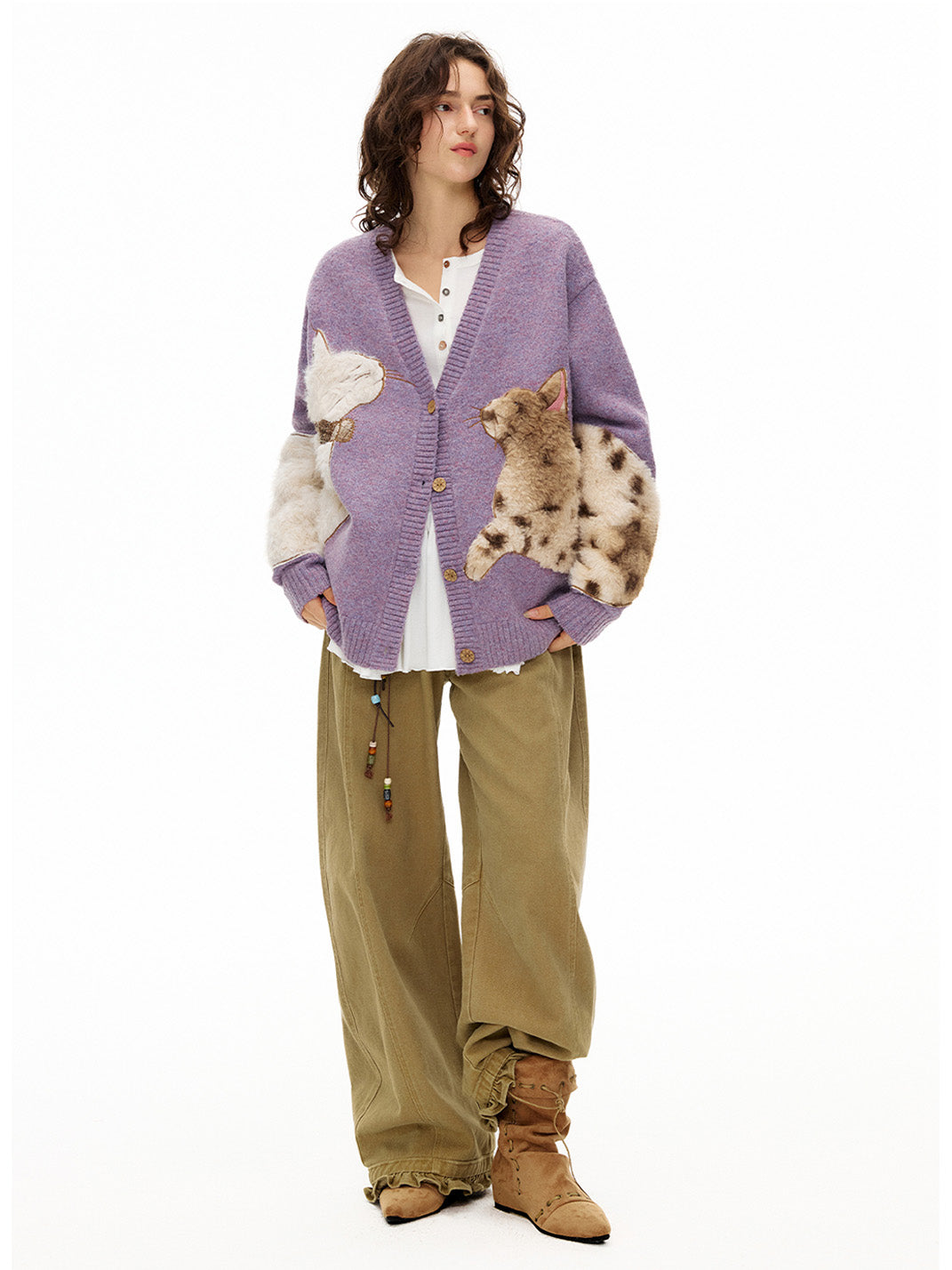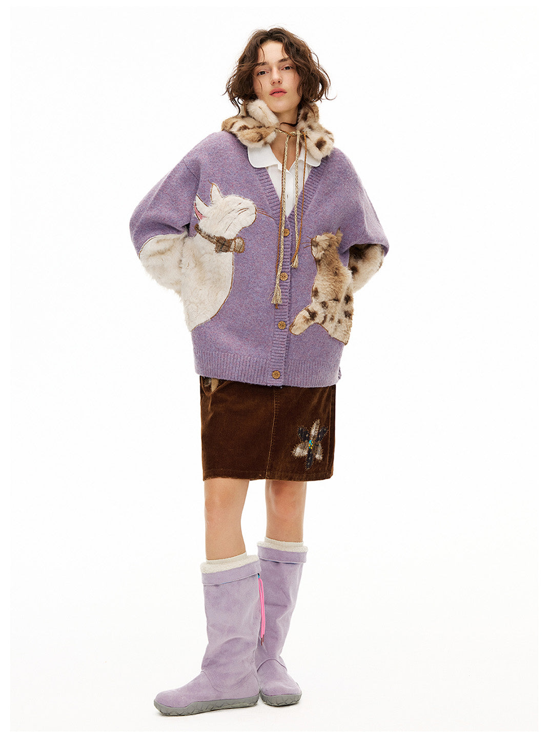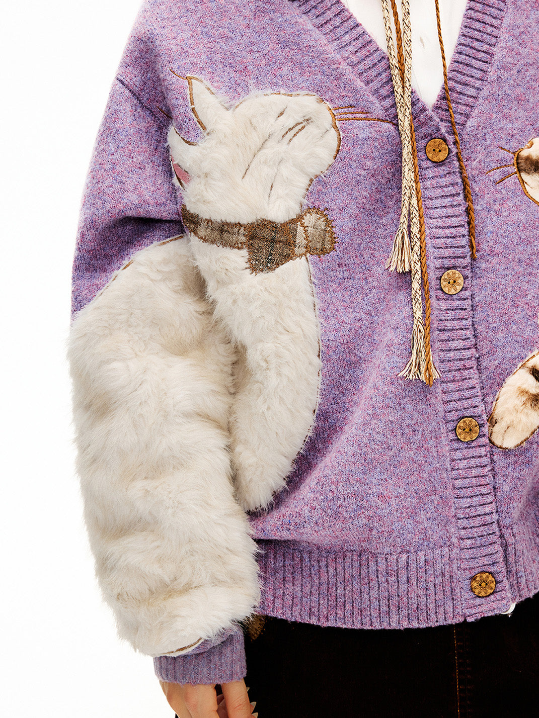 This cardigan features a relaxed, laid-back silhouette in a taro purple hue, creating a warm and romantic atmosphere. The V-neck with wooden buttons adds a touch of natural simplicity, while the clean lines of the front contribute to a relaxed and casual look. The most striking feature is the 3D cat appliqué design on both sides of the front: crafted from flocked eco-friendly fur fabric, it's soft to the touch and vividly three-dimensional.