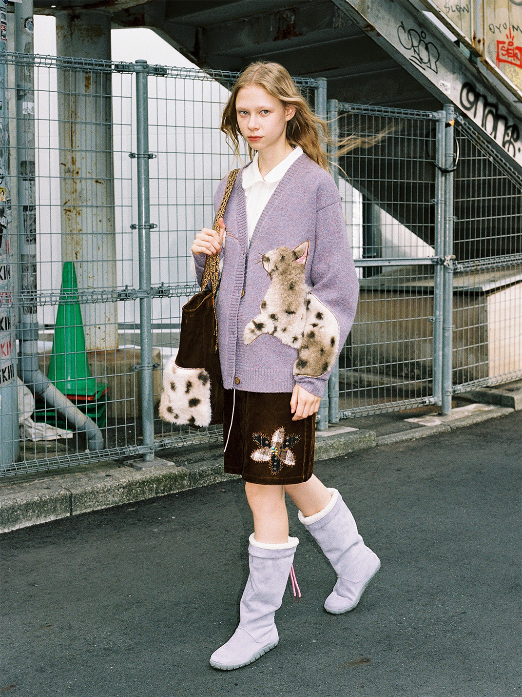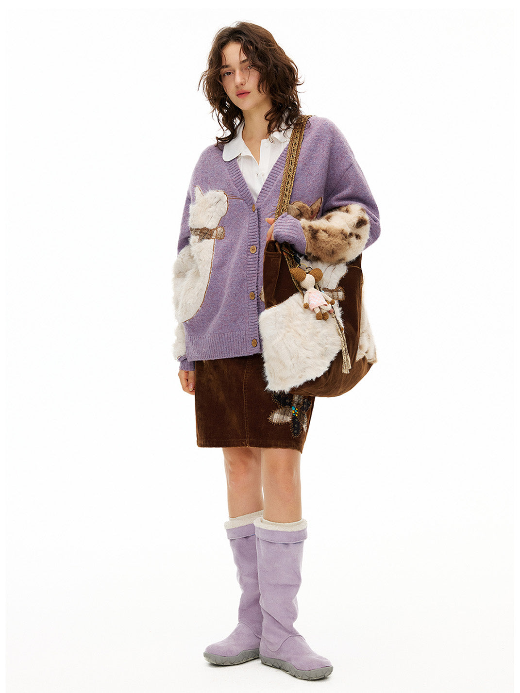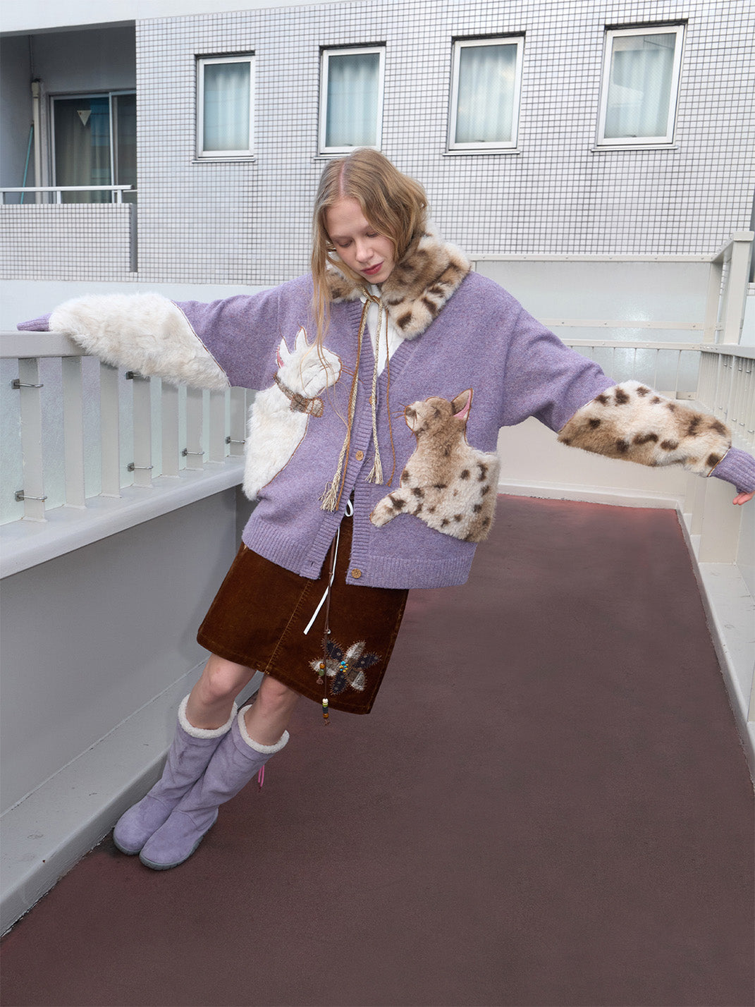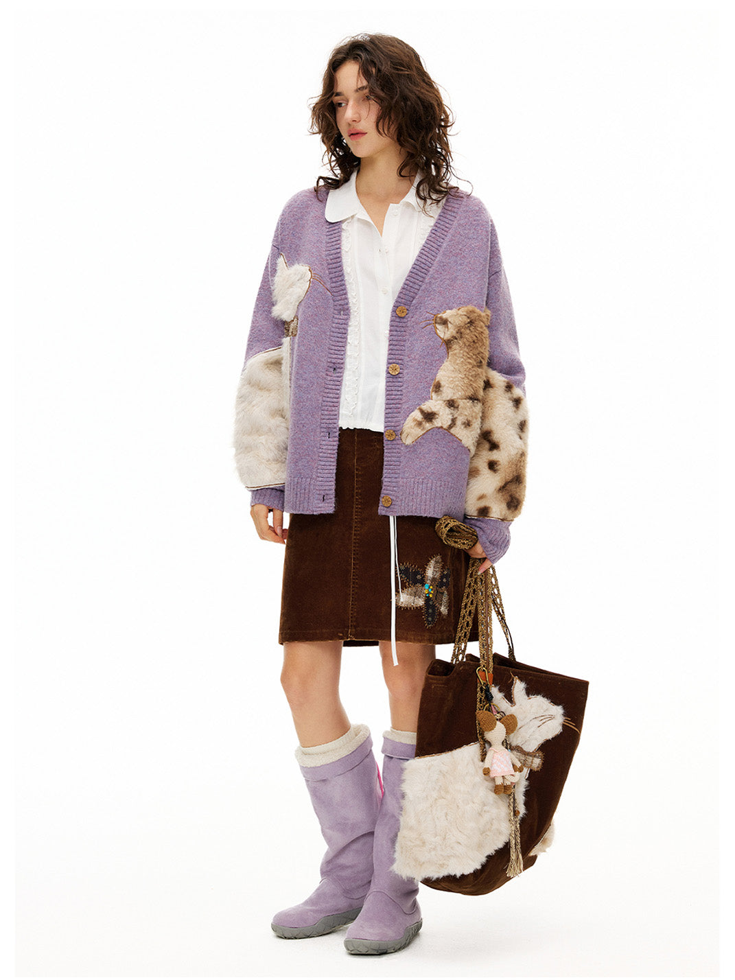 This cardigan features a relaxed, laid-back silhouette in a taro purple hue, creating a warm and romantic atmosphere. The V-neck with wooden buttons adds a touch of natural simplicity, while the clean lines of the front contribute to a relaxed and casual look. The most striking feature is the 3D cat appliqué design on both sides of the front: crafted from flocked eco-friendly fur fabric, it's soft to the touch and vividly three-dimensional.