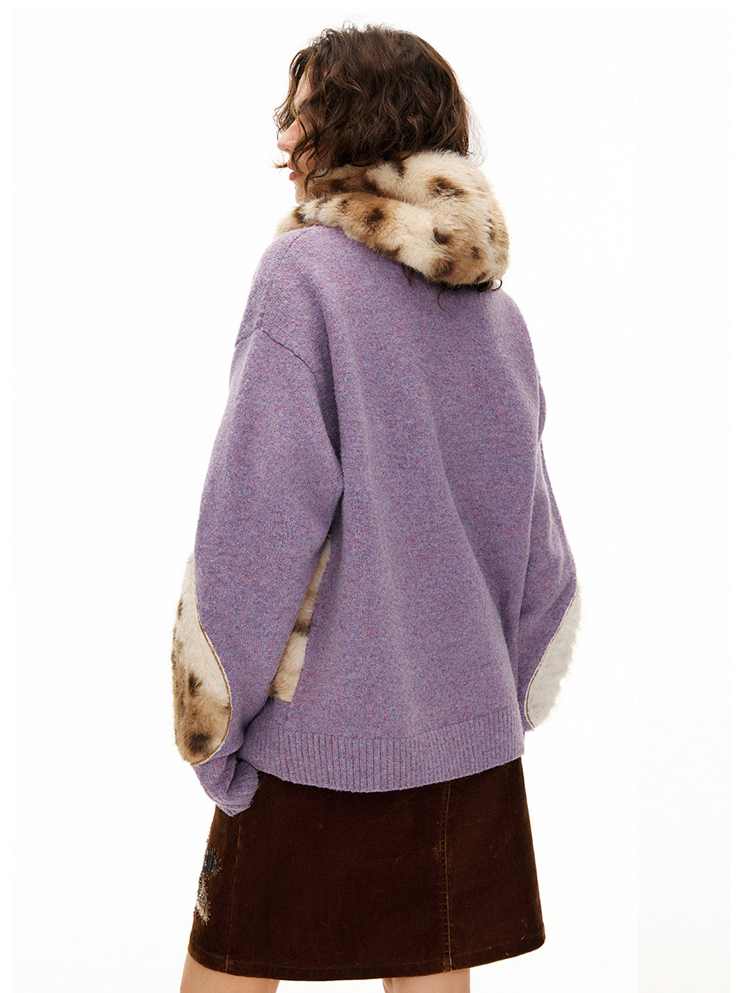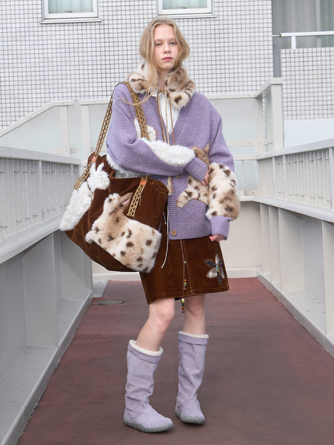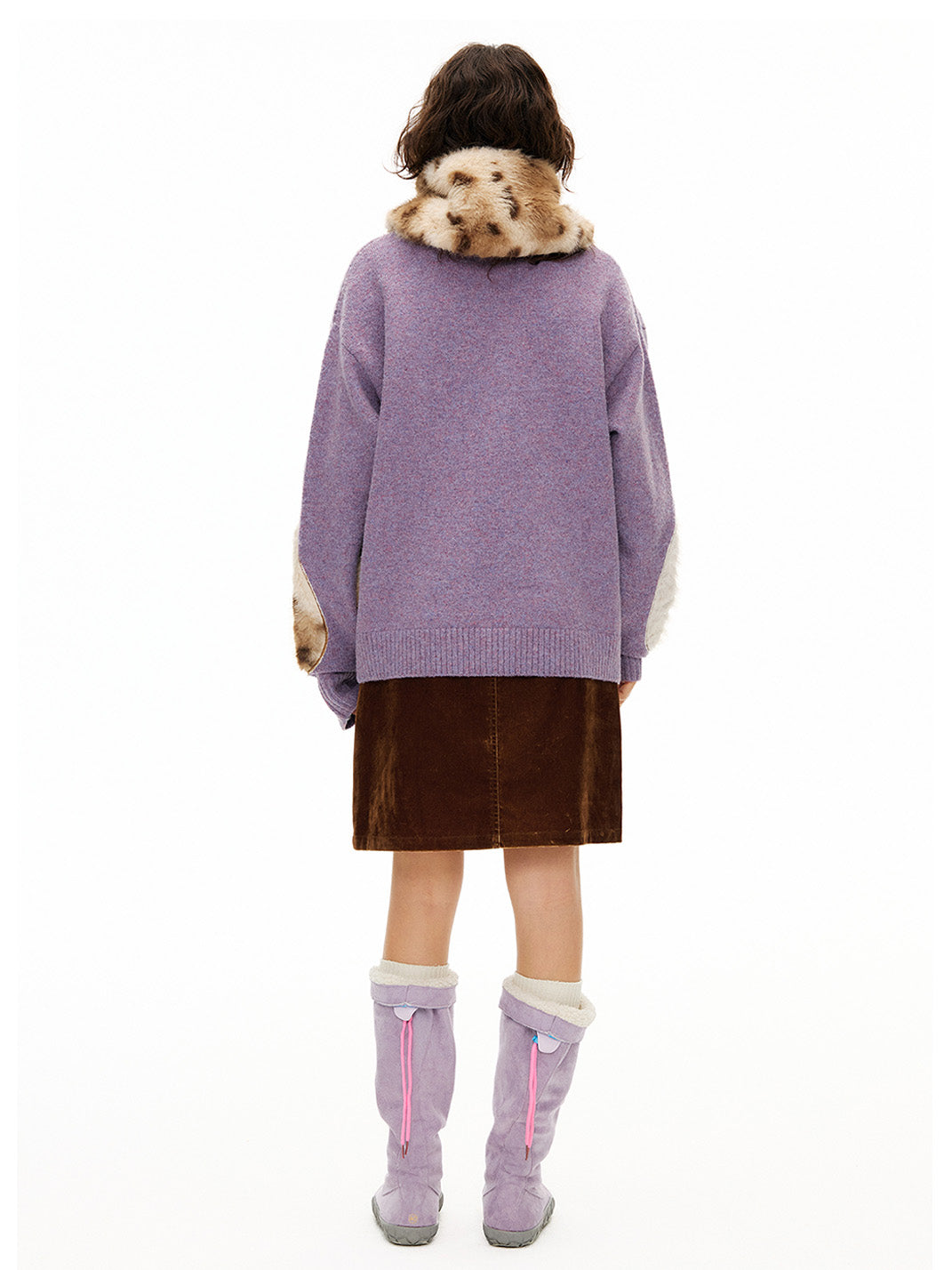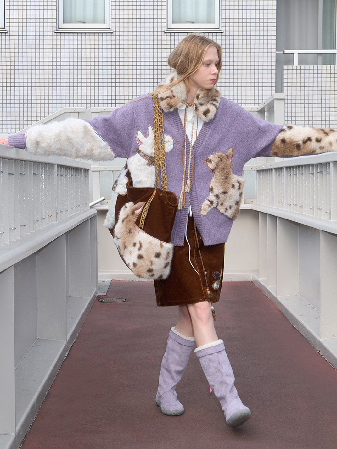 This cardigan features a relaxed, laid-back silhouette in a taro purple hue, creating a warm and romantic atmosphere. The V-neck with wooden buttons adds a touch of natural simplicity, while the clean lines of the front contribute to a relaxed and casual look. The most striking feature is the 3D cat appliqué design on both sides of the front: crafted from flocked eco-friendly fur fabric, it's soft to the touch and vividly three-dimensional.