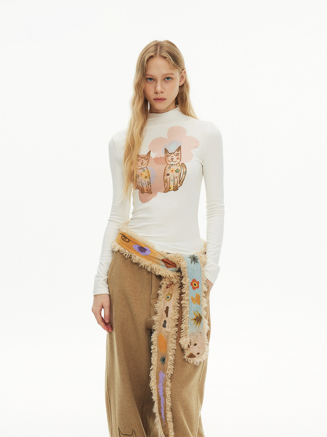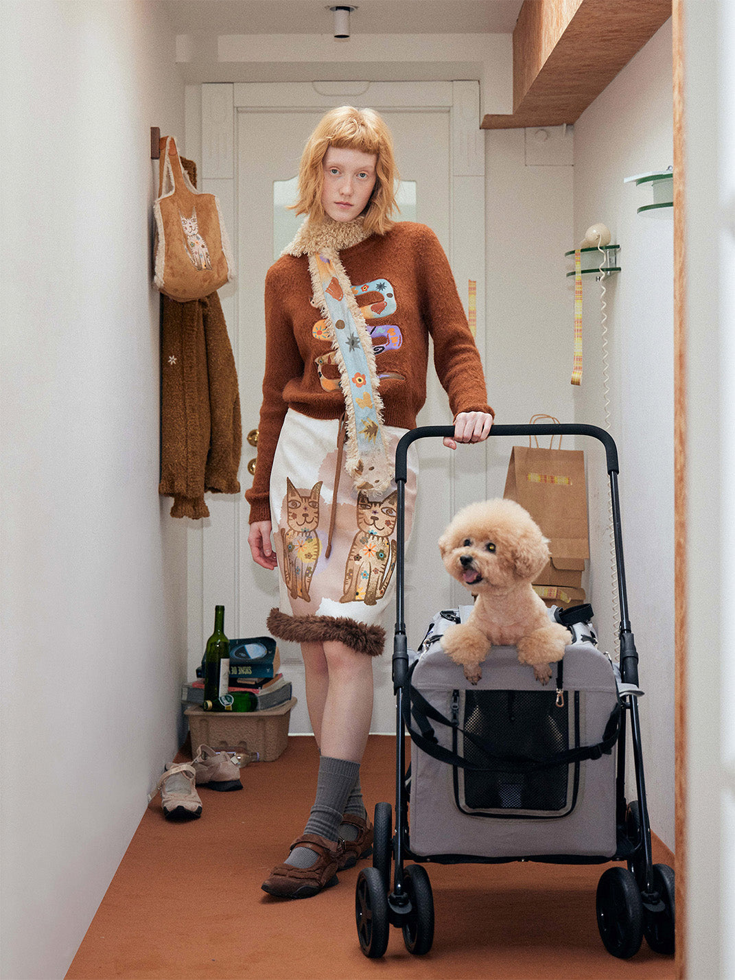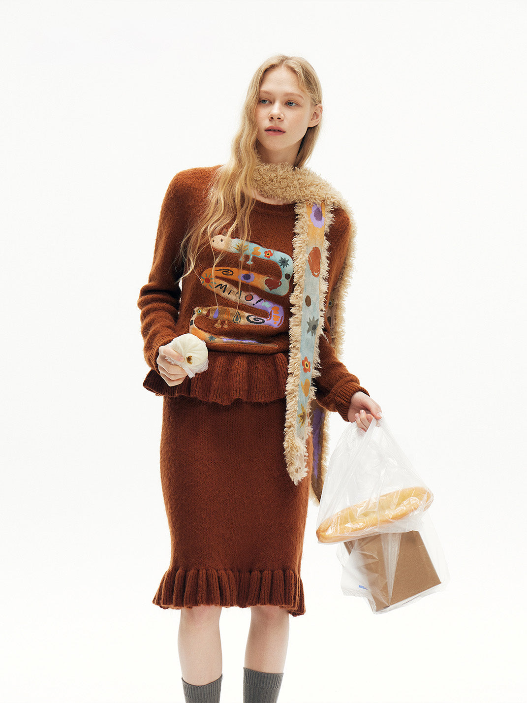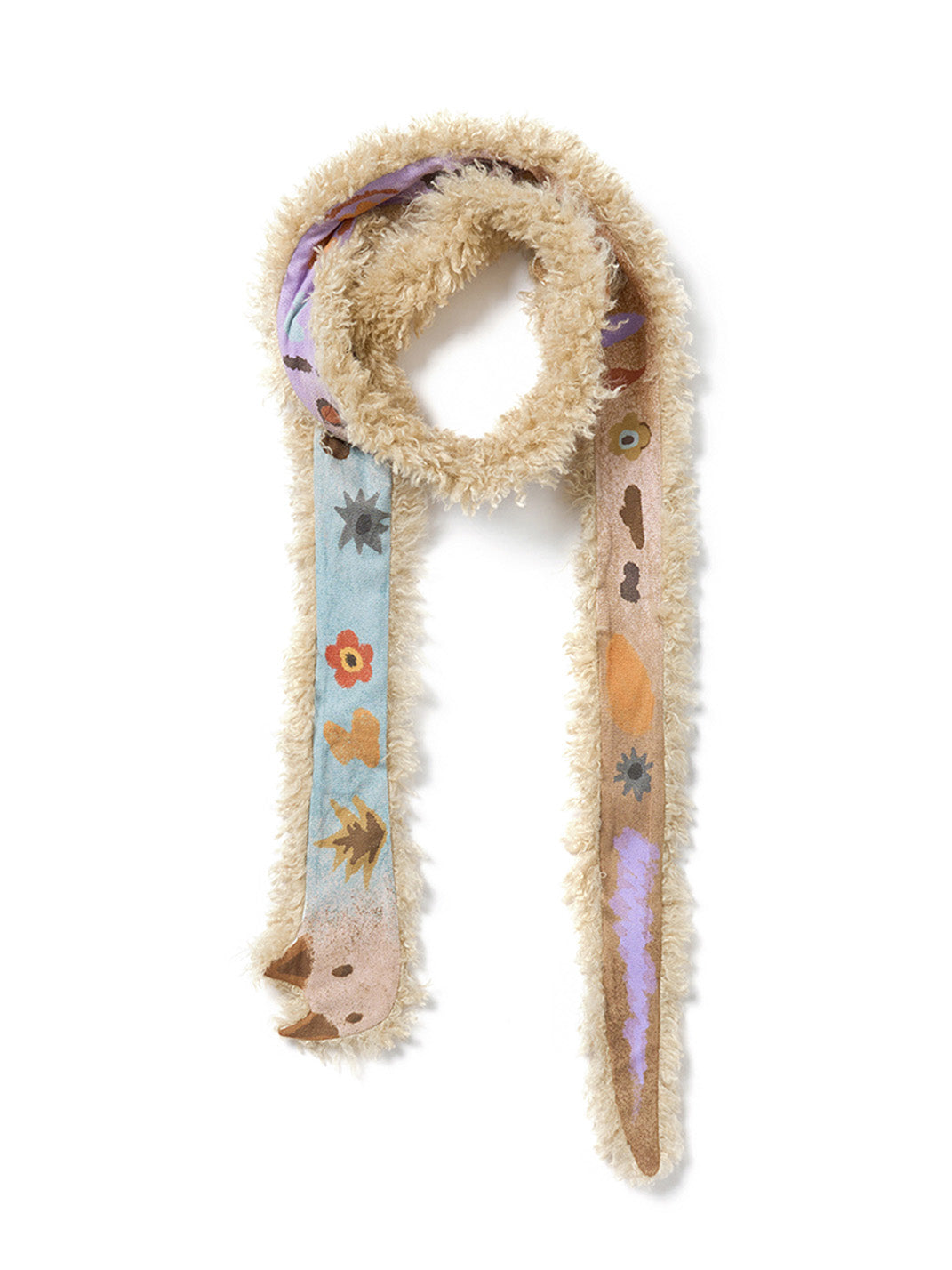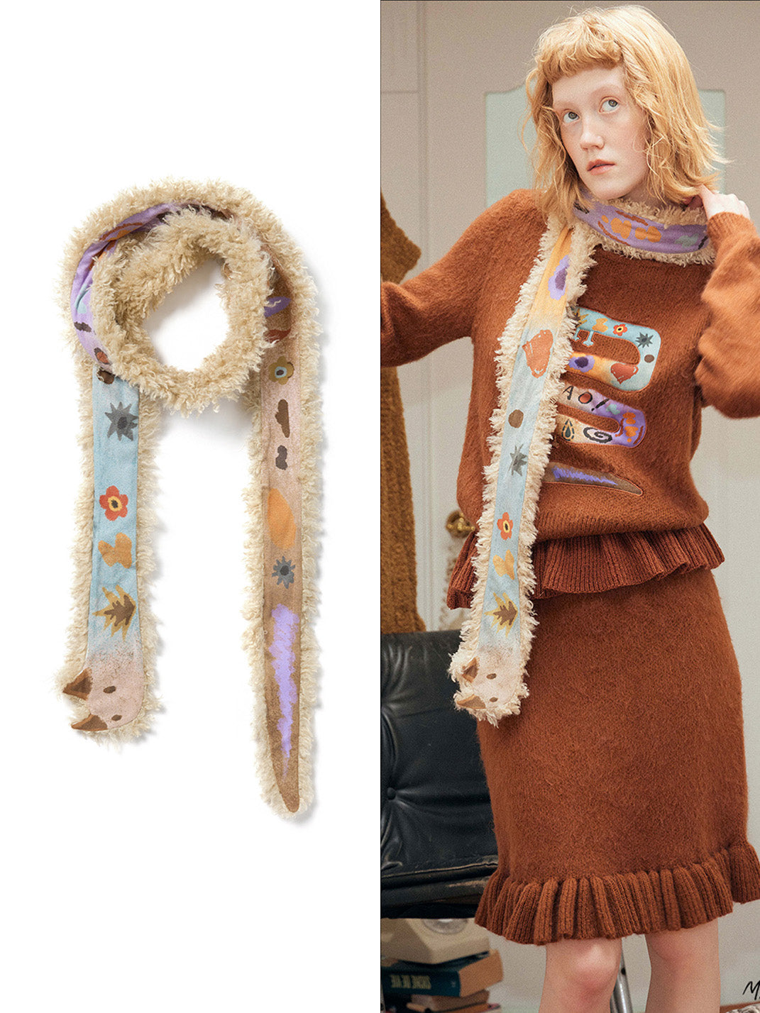 This Year of the Snake "Cat and Snake" printed eco-friendly fur scarf is a unique New Year's item. Made from soft faux lamb's wool, the scarf features rich colors and patterns, including small flowers and abstract designs, adding a touch of playfulness and fun. Inspired by the snake, the scarf symbolizes the vitality and blessings of the New Year, making the overall look even more festive.