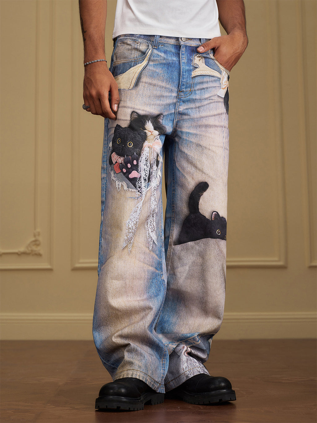 YADcrew | Black Cat Doll Bow Fun Printed Jeans saltar al contenido