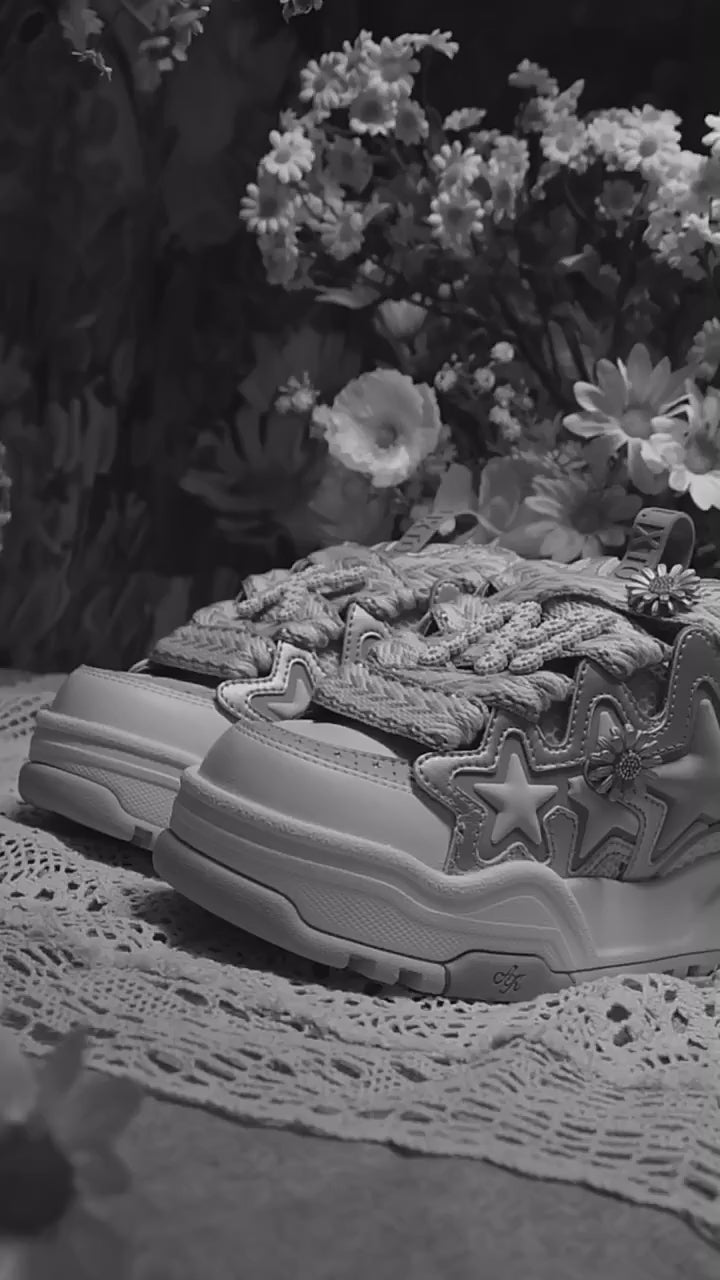 El tema adopta el elemento común de MEDM, pequeñas margaritas, adornadas a ambos lados de los zapatos, e incorpora accesorios de margaritas, que no solo conservan el estilo, sino que también los hacen versátiles y prácticos. Se ha añadido tela de encaje personalizada en la lengüeta y los laterales, y la colocación y selección de los cordones tienen un marcado sentido del diseño sin resultar demasiado femeninos, lo que los convierte en una prenda versátil que no distingue género. Los zapatos también cuentan con un diseño reflectante 3M, lo que los convierte en un elemento destacado para salir de noche.