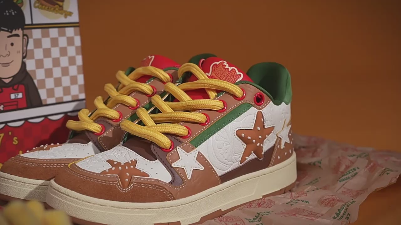 La estructura general del zapato está inspirada en hamburguesas y papas fritas, integrando el diseño de las zapatillas con elementos de la comida rápida estadounidense. Diversos detalles muestran que la estructura general y la temática "Burger Club" son más completas. En cuanto a las características de uso, la paleta de colores combina ingeniosamente los colores de los panes, las hamburguesas, las salsas y las verduras, lo que no solo restaura la apariencia de la hamburguesa, sino que también presenta un sabor único y moderno.