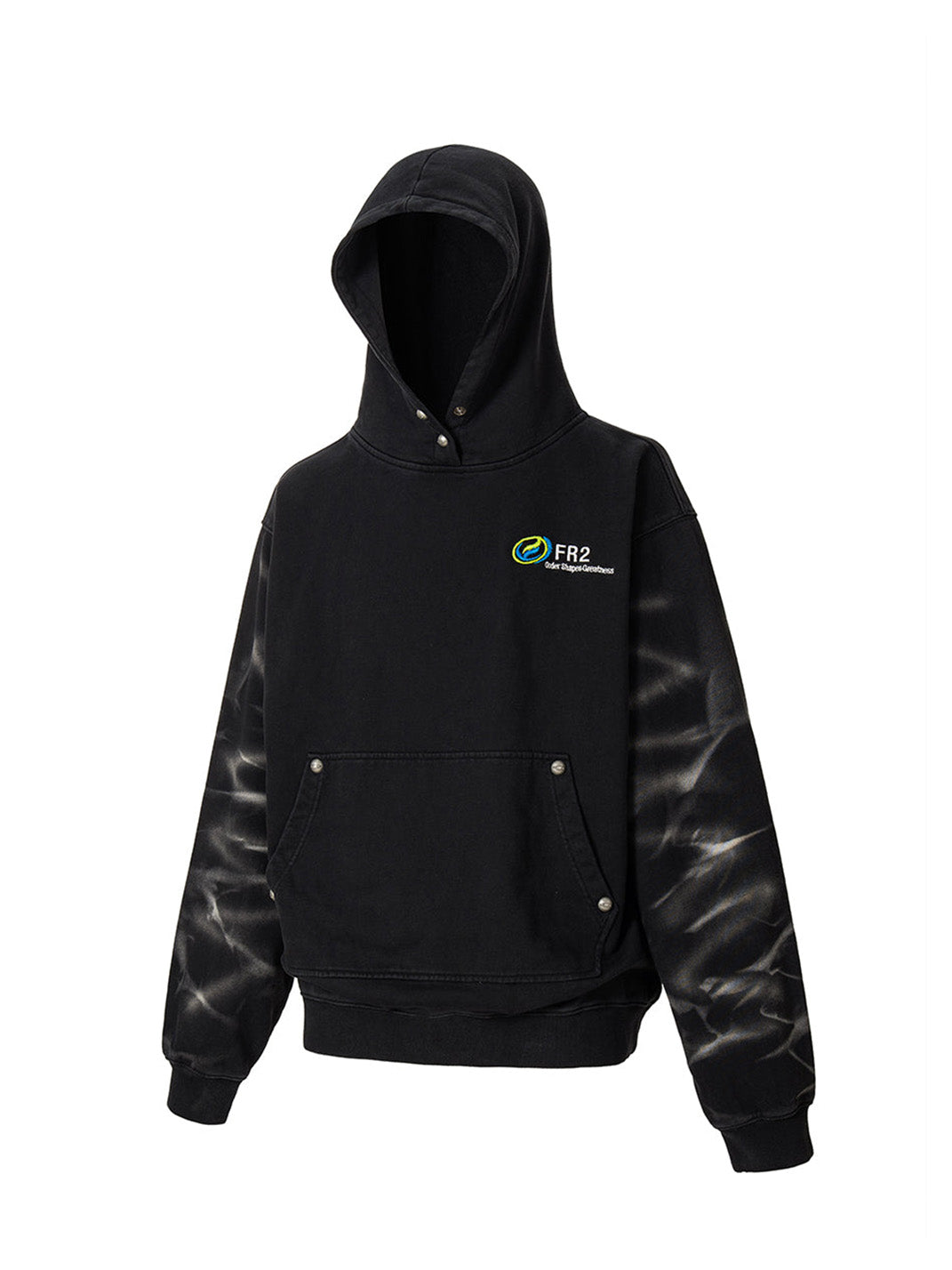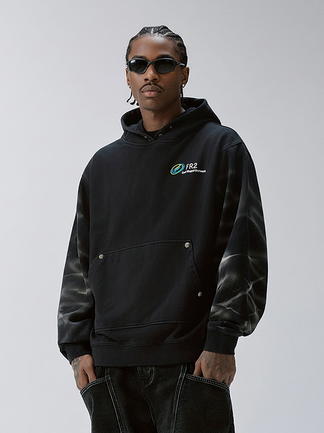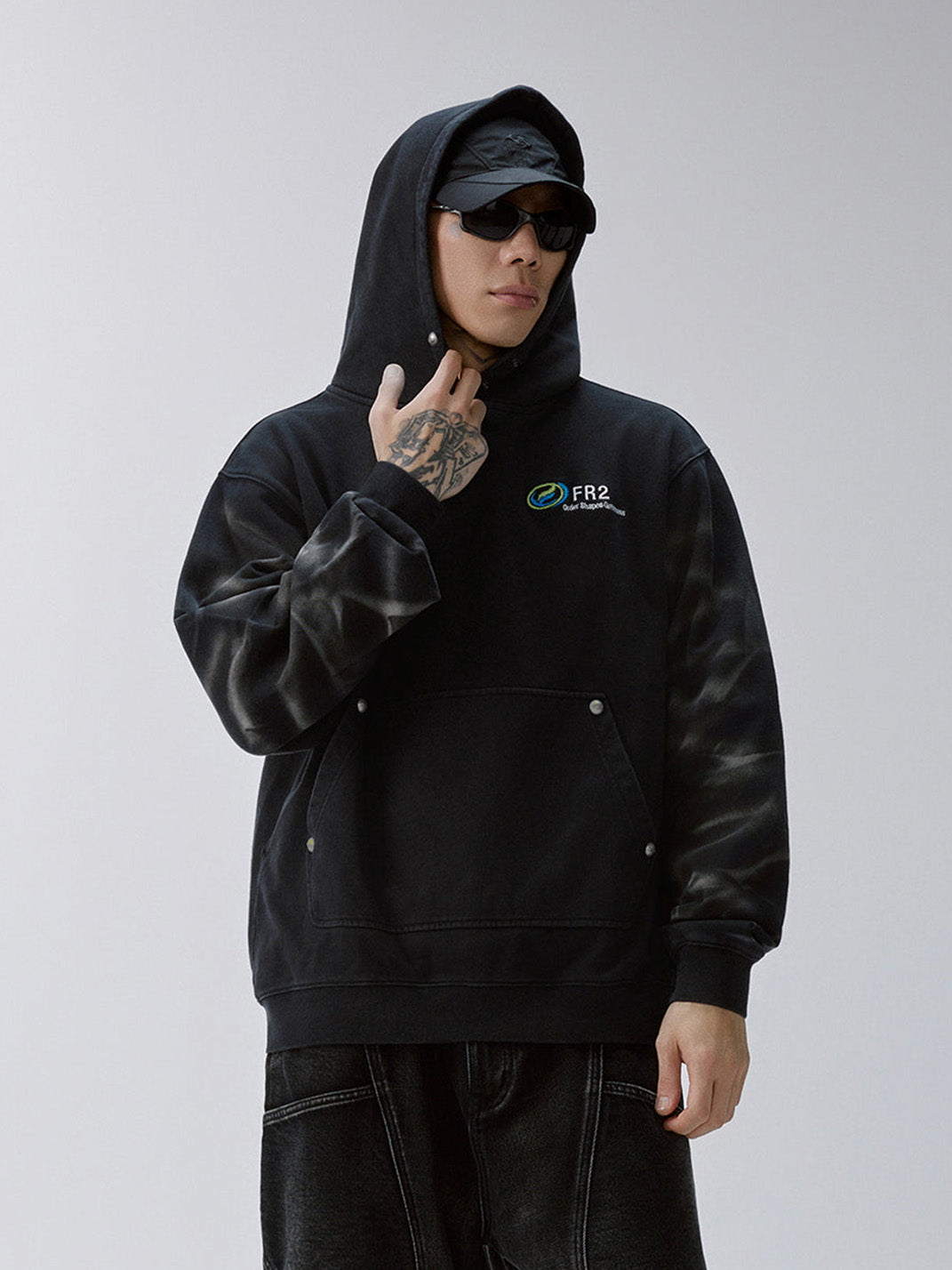 The Tie-Dye Embroidered LOGO Hoodie blends retro dye techniques with a modern streetwear silhouette. Featuring subtle, radial tie-dye effects along the sleeves, the piece contrasts washed black fabric with a vibrant chest logo embroidery. Its relaxed cut, ribbed finishes, and stud-accented kangaroo pocket channel a utilitarian yet laid-back feel. This hoodie stands out for its tonal complexity and low-key attitude, rooted in graphic detail and dye treatment.