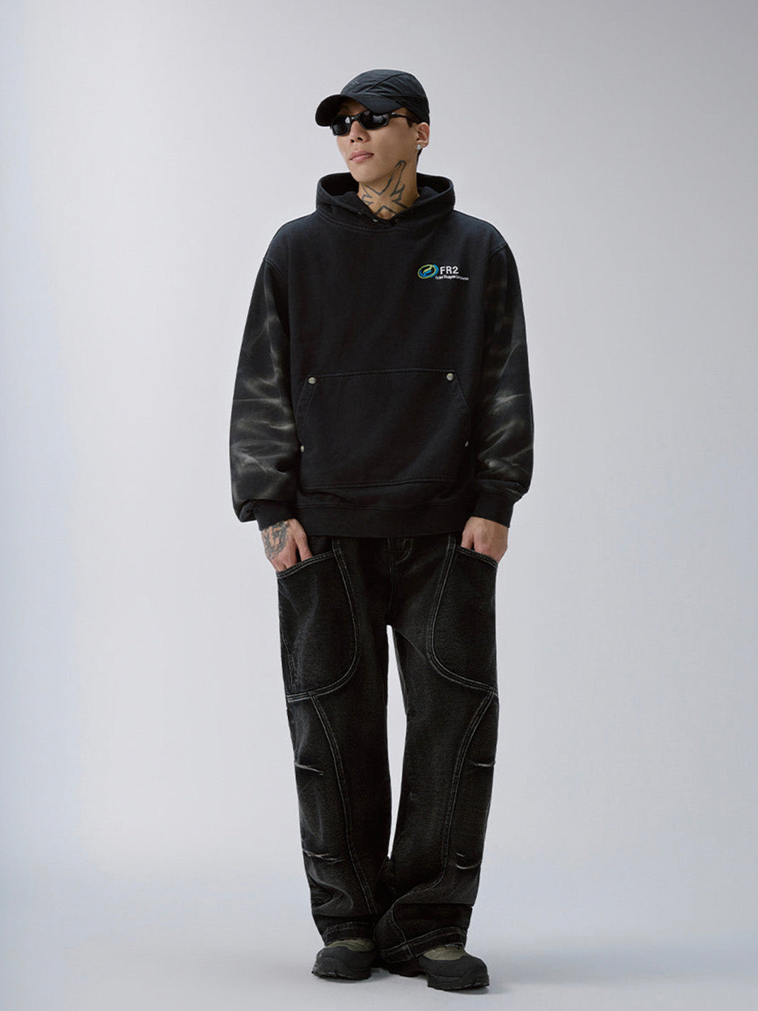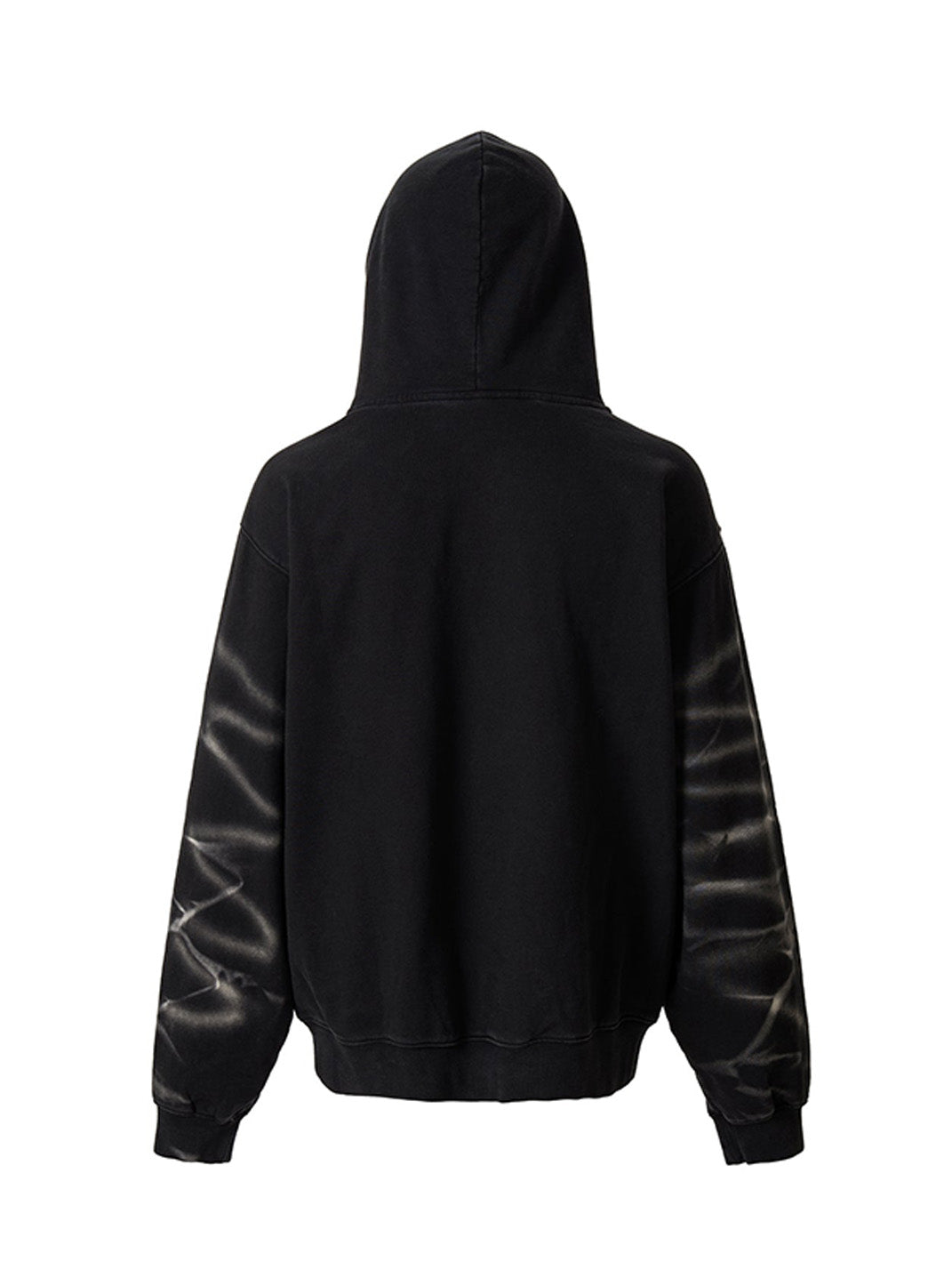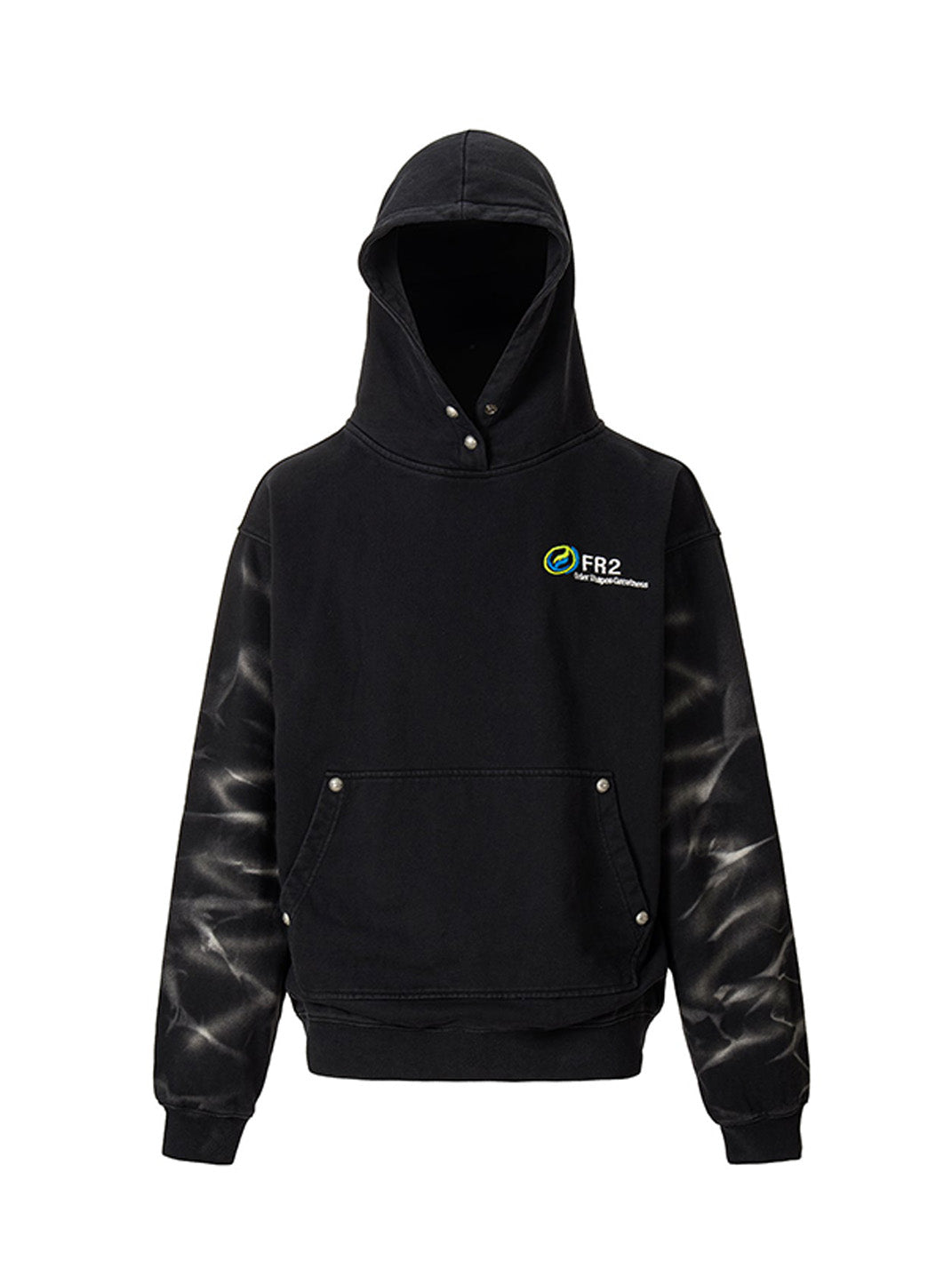 The Tie-Dye Embroidered LOGO Hoodie blends retro dye techniques with a modern streetwear silhouette. Featuring subtle, radial tie-dye effects along the sleeves, the piece contrasts washed black fabric with a vibrant chest logo embroidery. Its relaxed cut, ribbed finishes, and stud-accented kangaroo pocket channel a utilitarian yet laid-back feel. This hoodie stands out for its tonal complexity and low-key attitude, rooted in graphic detail and dye treatment.