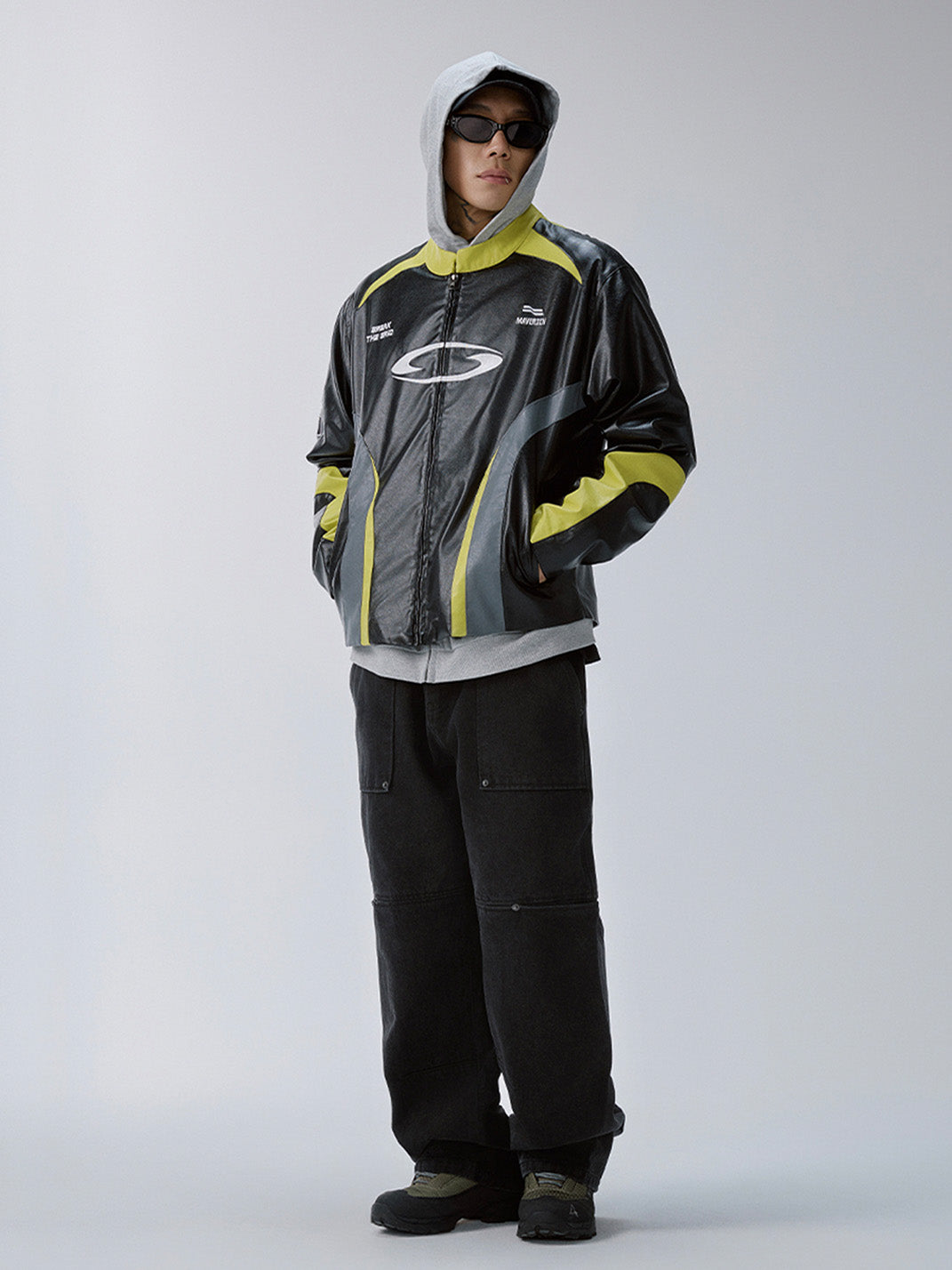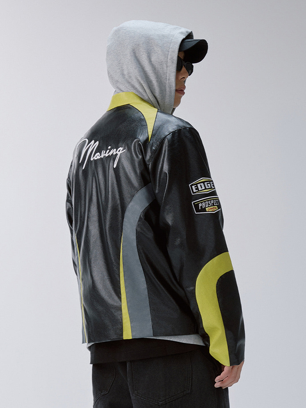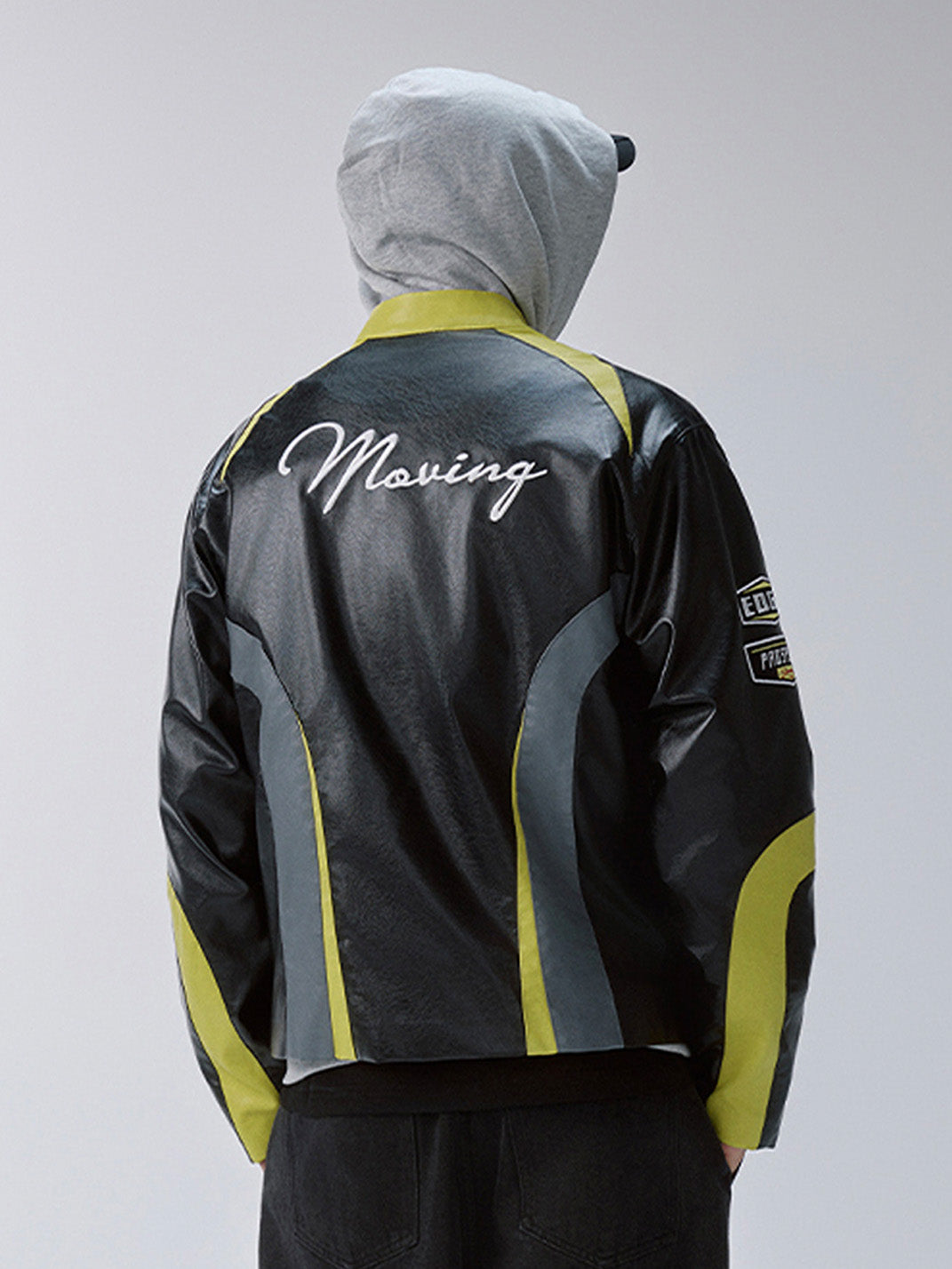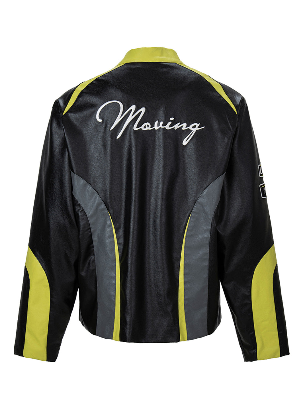 The Contrast Panel Embroidered Moto Jacket reinterprets retro motorsport graphics through a sharp streetwear lens. Constructed from a glossy PU-cotton blend, the jacket stands out with high-contrast color blocking in black, yellow, and slate grey, accentuated by curved side paneling and statement embroidery. Details like the oversized chest emblem, scripted "Moving" graphic on the back, and stacked racing patches on the sleeve speak to speed culture and underground team aesthetics. A structured fit and mock neck collar complete this visually charged outer layer.