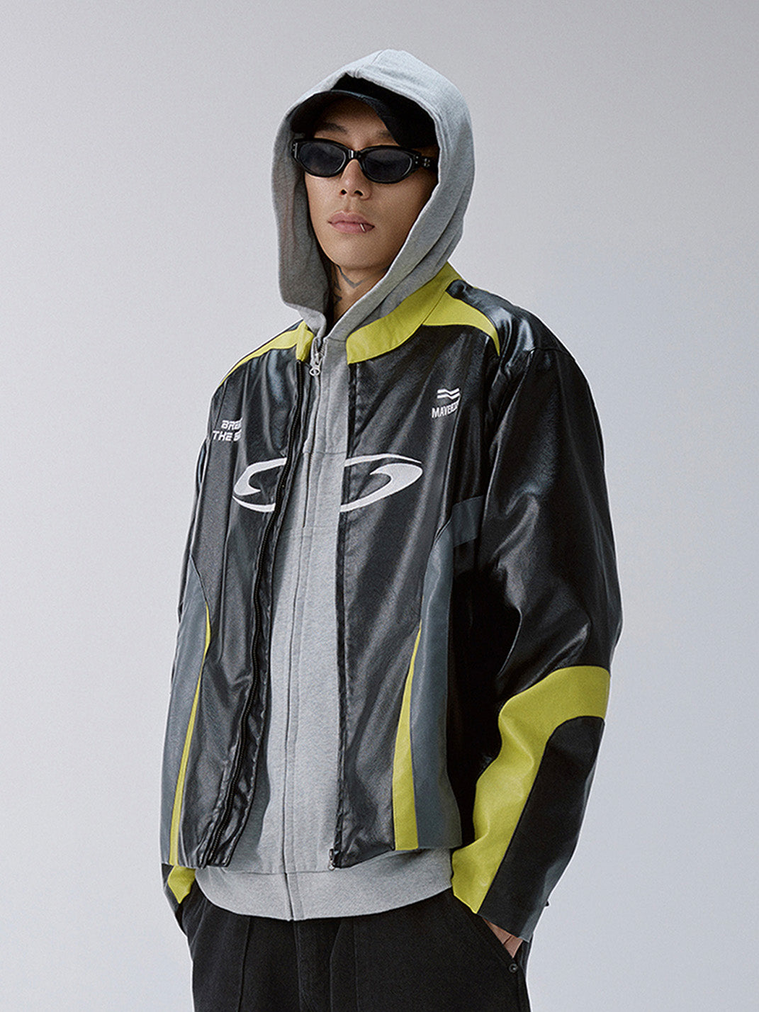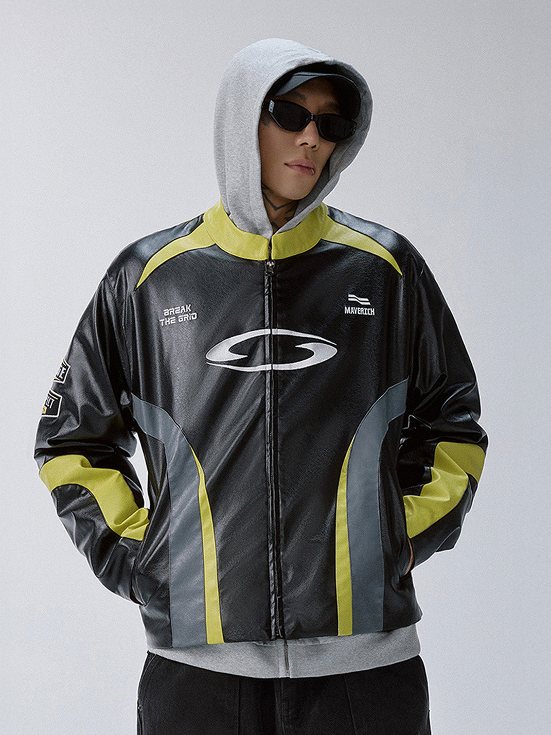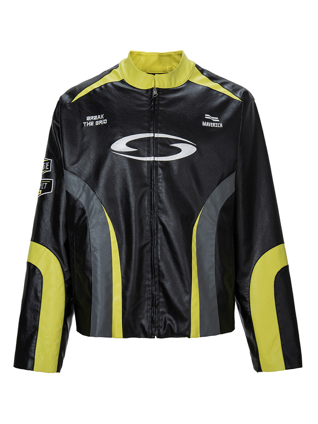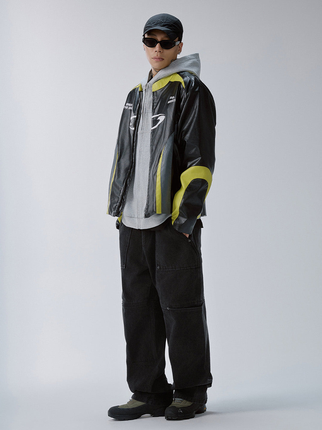 The Contrast Panel Embroidered Moto Jacket reinterprets retro motorsport graphics through a sharp streetwear lens. Constructed from a glossy PU-cotton blend, the jacket stands out with high-contrast color blocking in black, yellow, and slate grey, accentuated by curved side paneling and statement embroidery. Details like the oversized chest emblem, scripted "Moving" graphic on the back, and stacked racing patches on the sleeve speak to speed culture and underground team aesthetics. A structured fit and mock neck collar complete this visually charged outer layer.