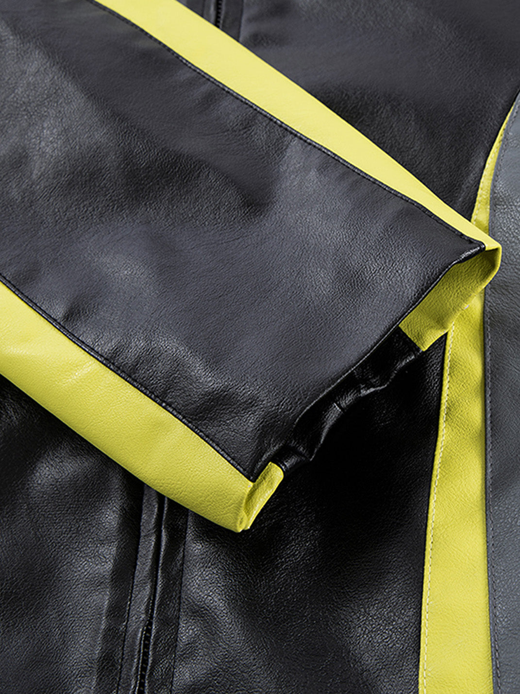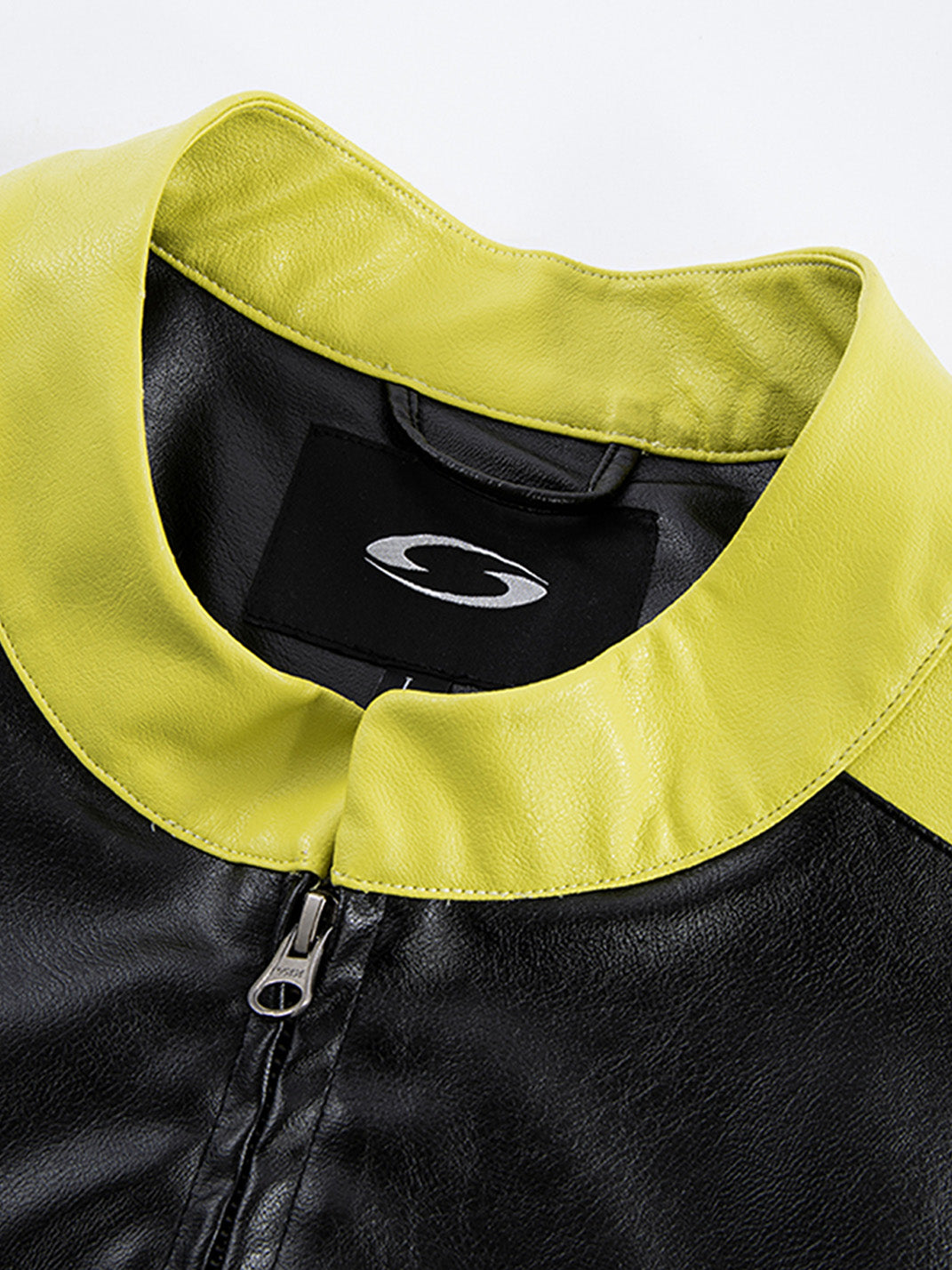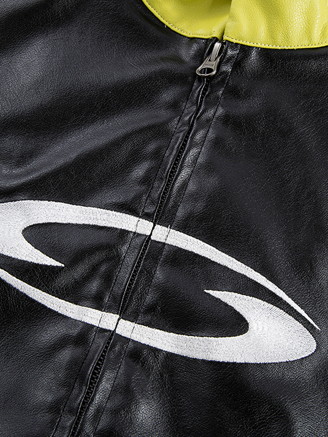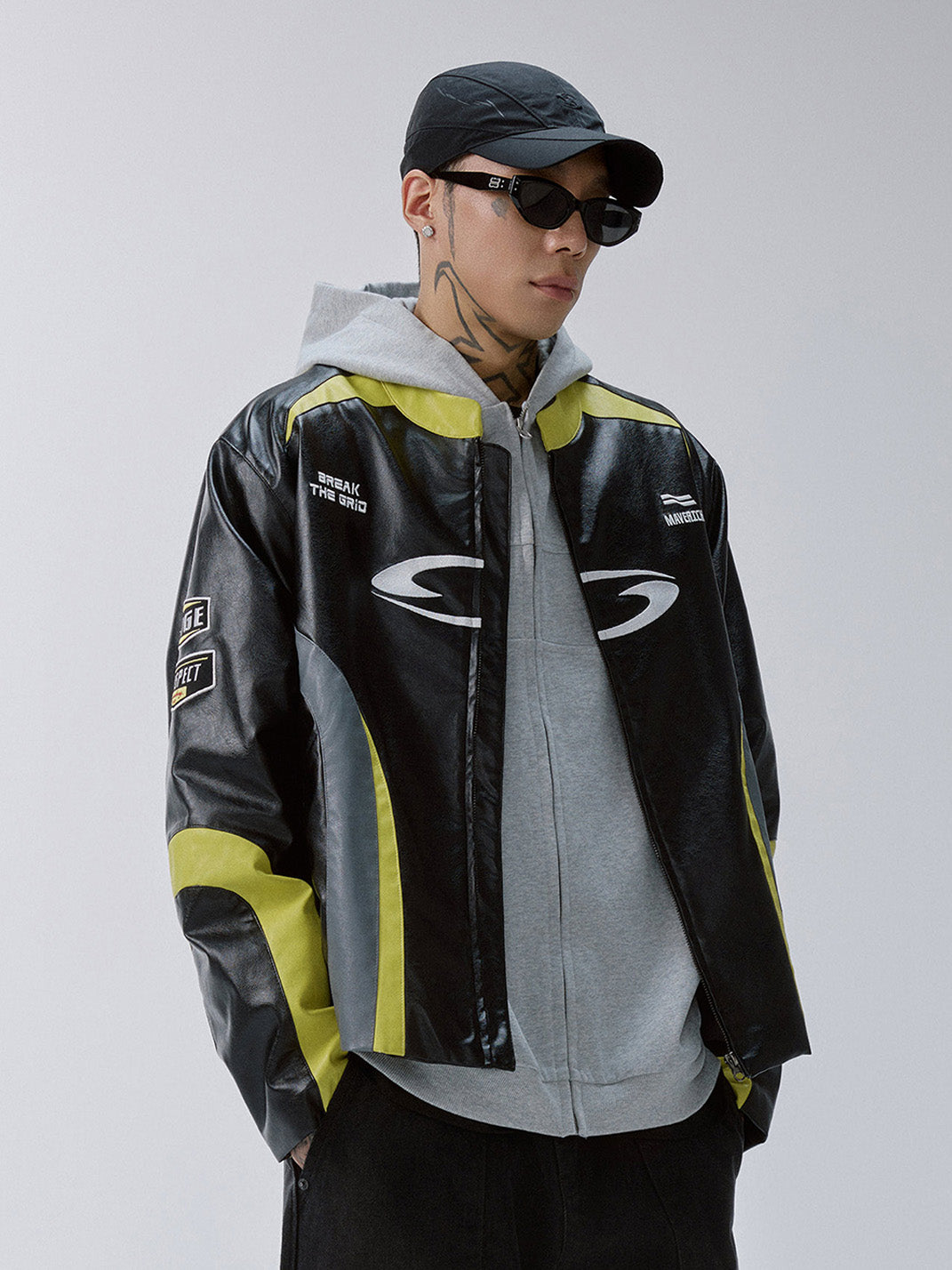 The Contrast Panel Embroidered Moto Jacket reinterprets retro motorsport graphics through a sharp streetwear lens. Constructed from a glossy PU-cotton blend, the jacket stands out with high-contrast color blocking in black, yellow, and slate grey, accentuated by curved side paneling and statement embroidery. Details like the oversized chest emblem, scripted "Moving" graphic on the back, and stacked racing patches on the sleeve speak to speed culture and underground team aesthetics. A structured fit and mock neck collar complete this visually charged outer layer.