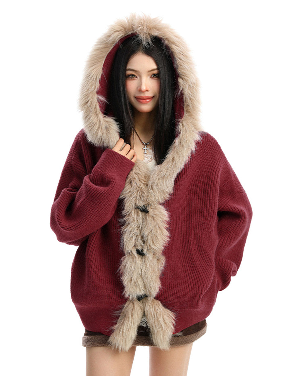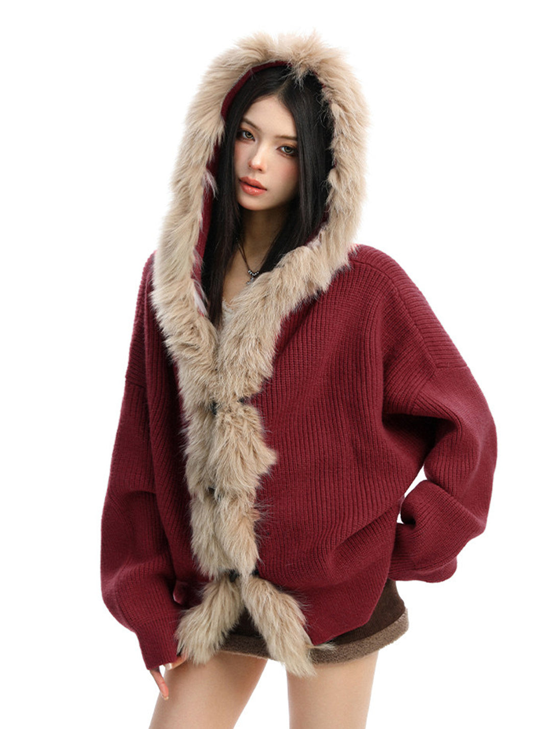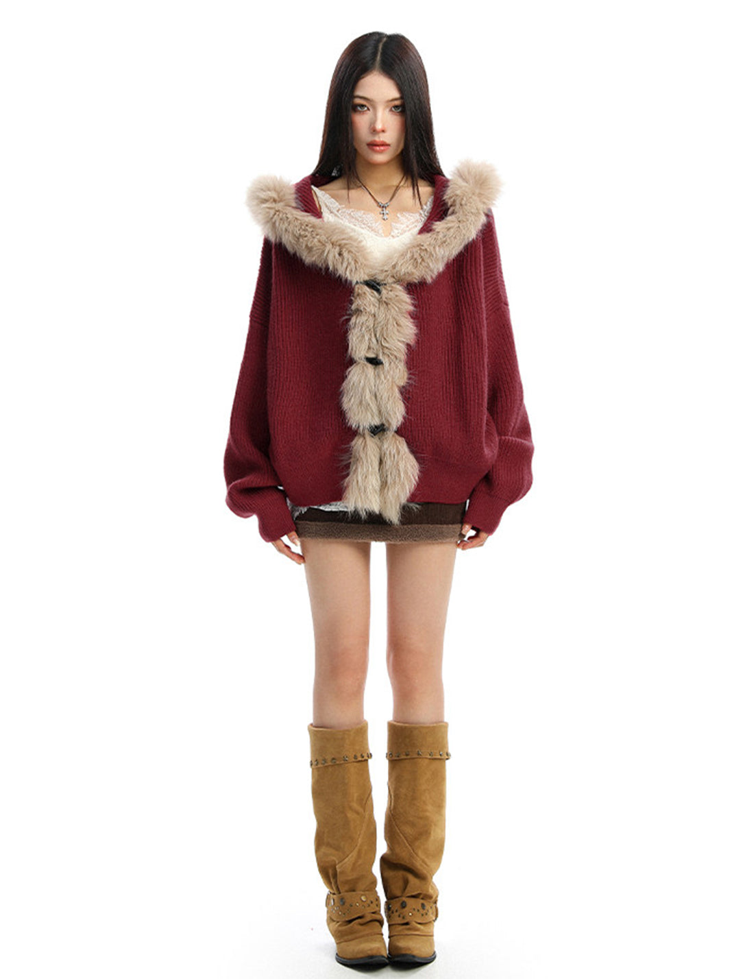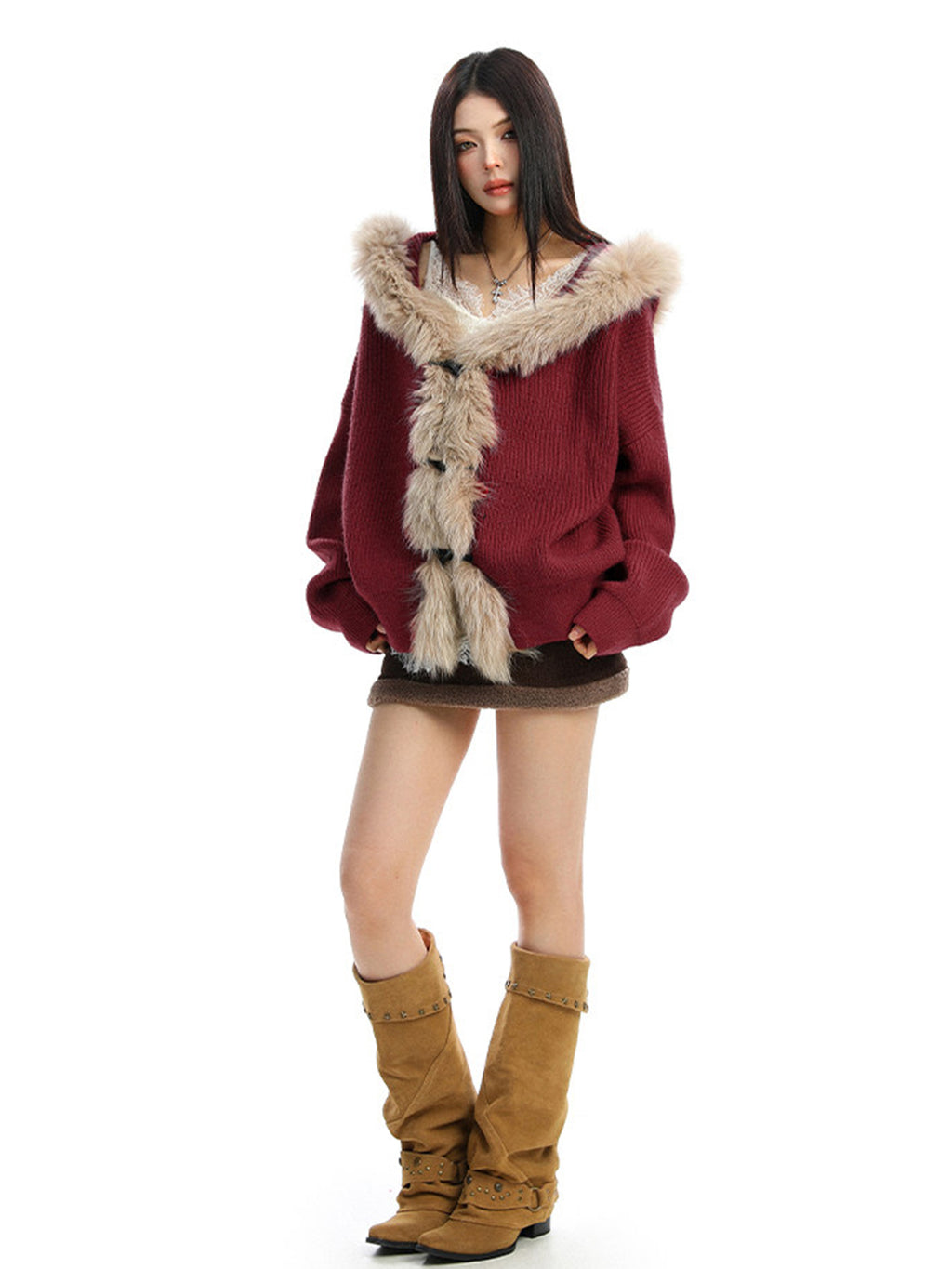 BIGGOLD | Fur Trimmed Hood Knit Sweater saltar al contenido