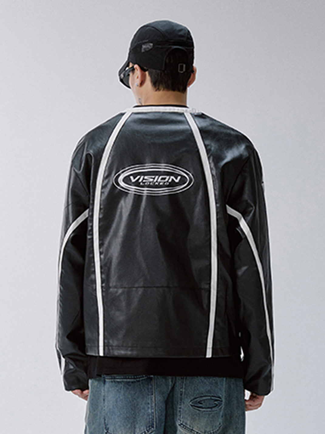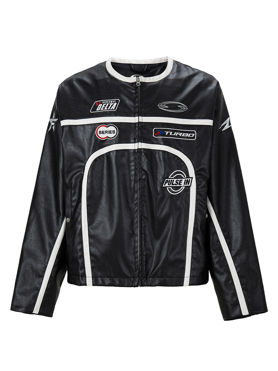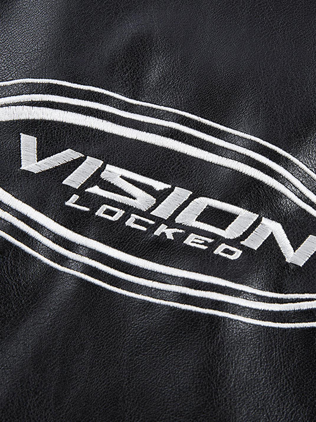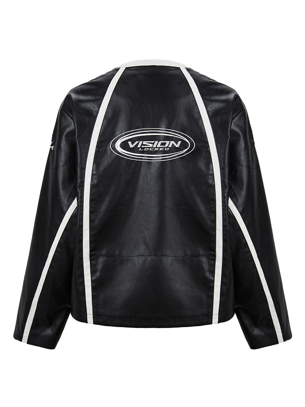 This Racing Patch Contrast Panel PU Moto Jacket merges motorsport aesthetics with a sleek streetwear edge. Crafted from a PU-cotton blend, it features a glossy leather-look finish and sharply defined white contrast piping that cuts across the black body in bold, aerodynamic lines. Embroidered racing-style patches across the chest and a prominent “VISION LOCKED” logo on the back nod to high-octane energy and futuristic subcultures. The jacket is finished with a streamlined collar, durable YKK zipper, and structured silhouette that channels both retro racing and modern rebellion.