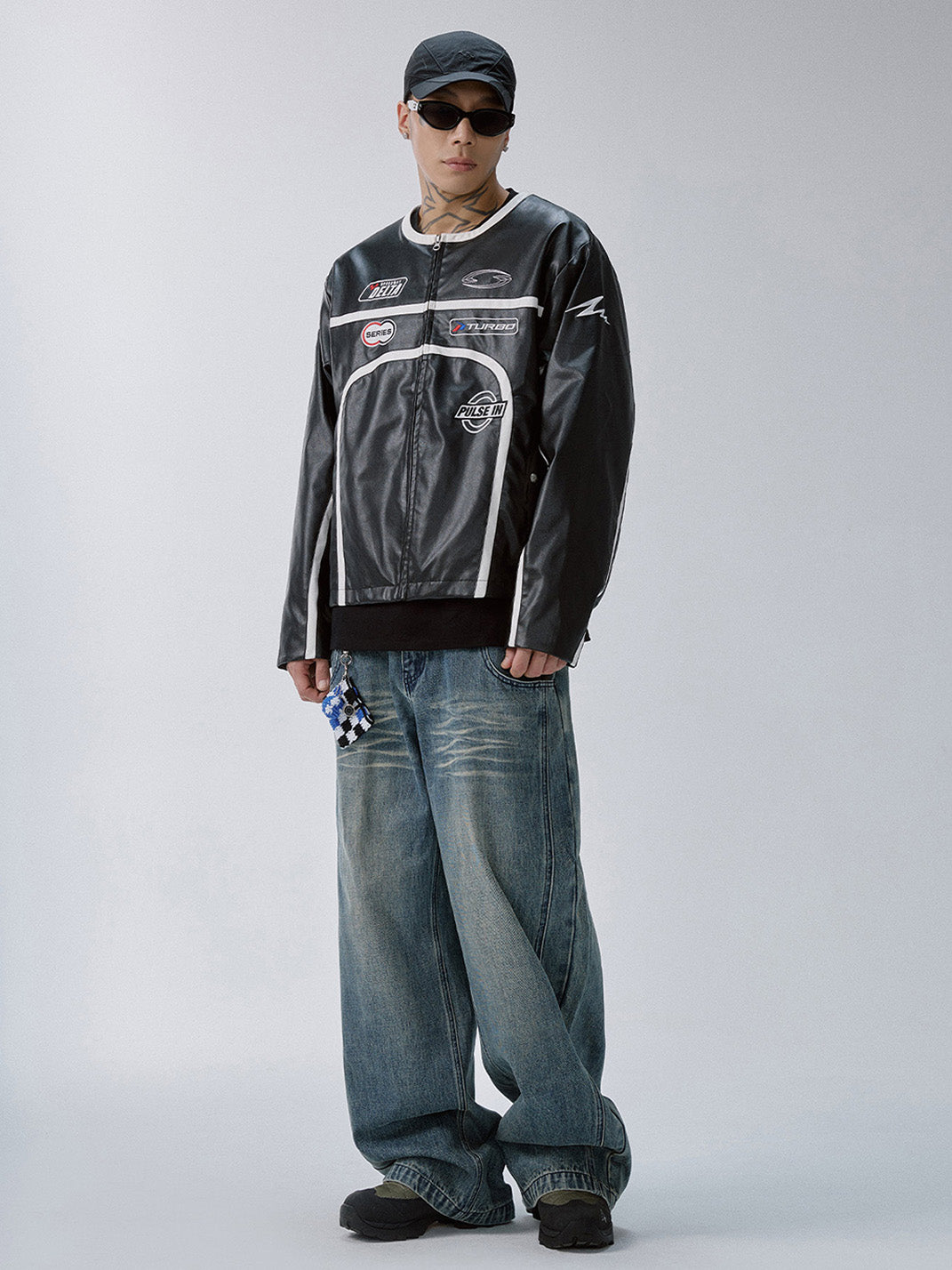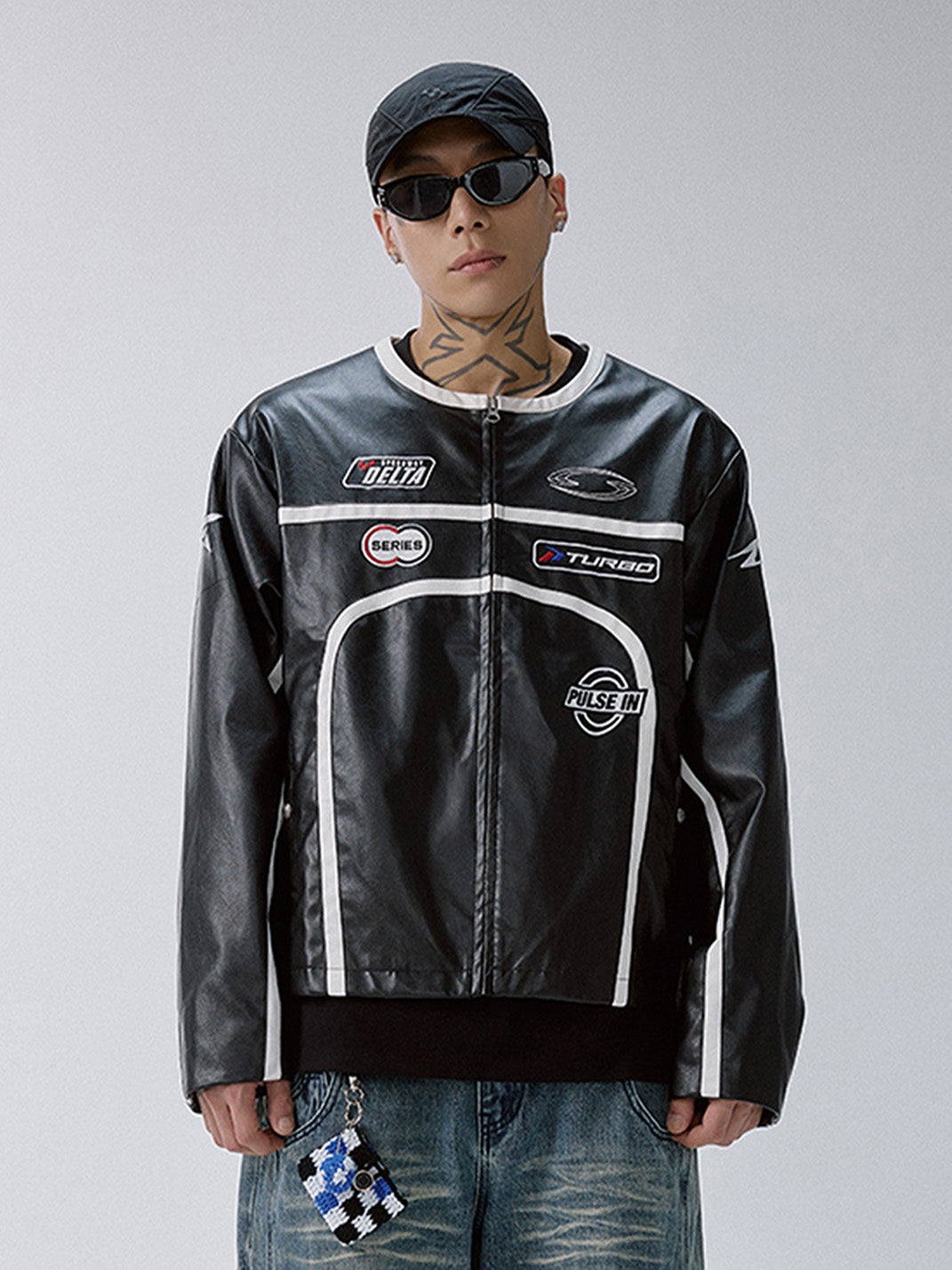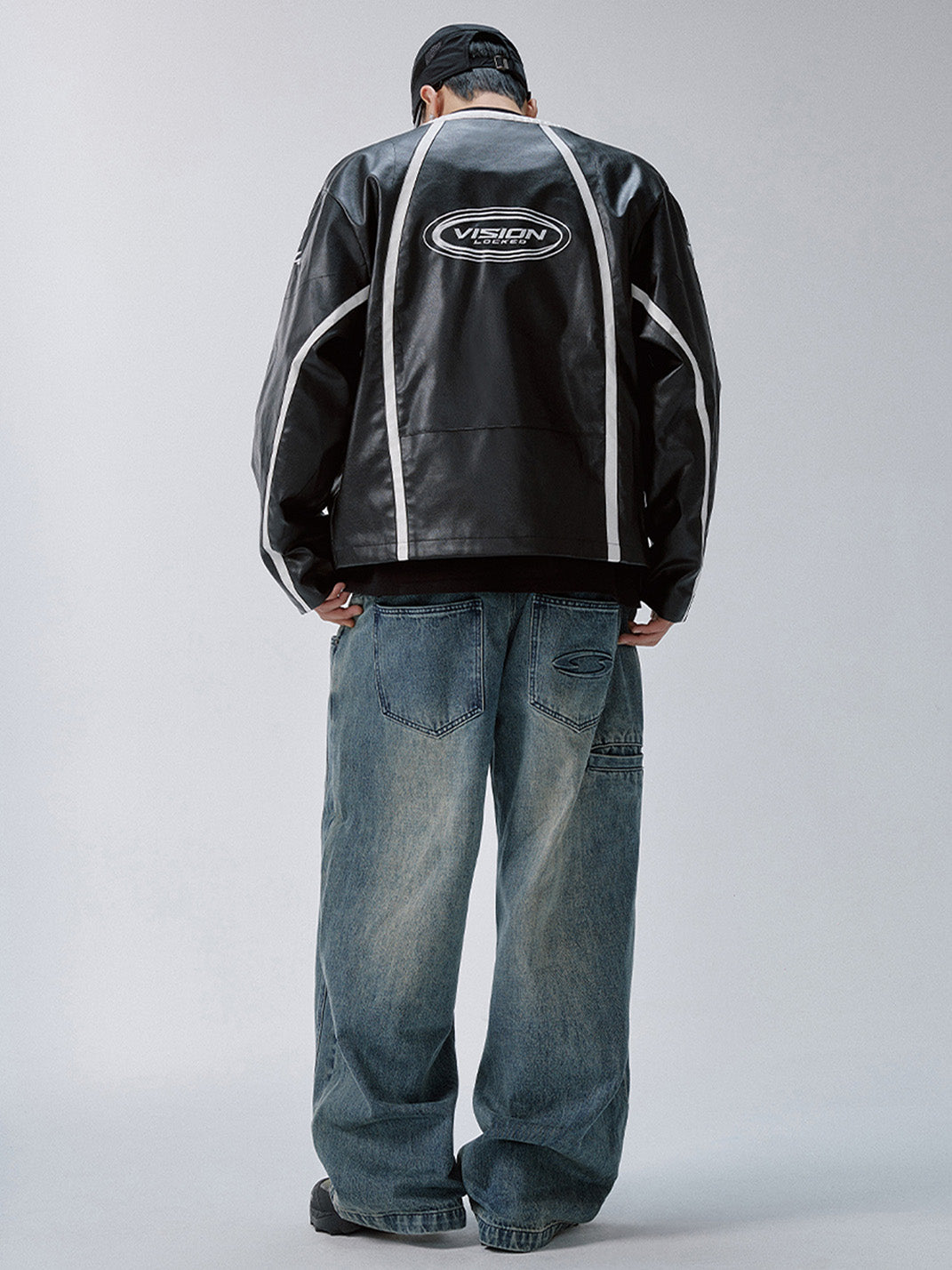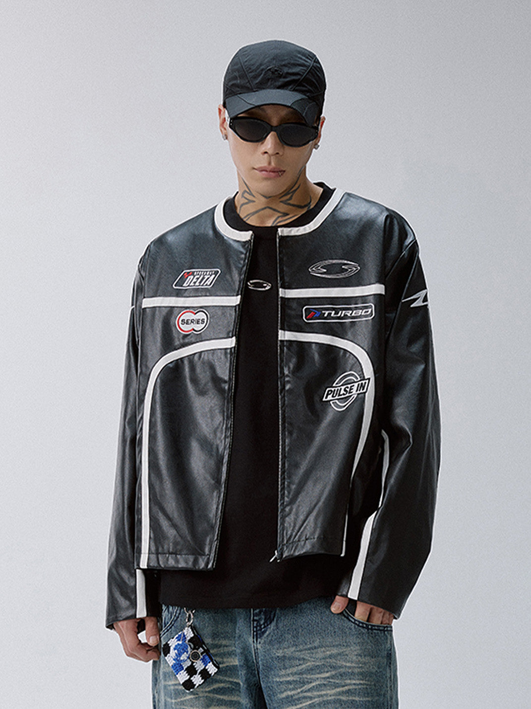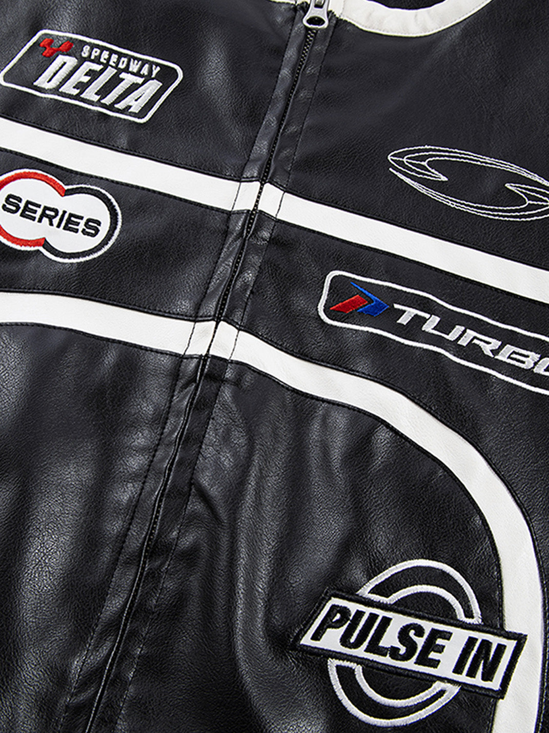 This Racing Patch Contrast Panel PU Moto Jacket merges motorsport aesthetics with a sleek streetwear edge. Crafted from a PU-cotton blend, it features a glossy leather-look finish and sharply defined white contrast piping that cuts across the black body in bold, aerodynamic lines. Embroidered racing-style patches across the chest and a prominent “VISION LOCKED” logo on the back nod to high-octane energy and futuristic subcultures. The jacket is finished with a streamlined collar, durable YKK zipper, and structured silhouette that channels both retro racing and modern rebellion.