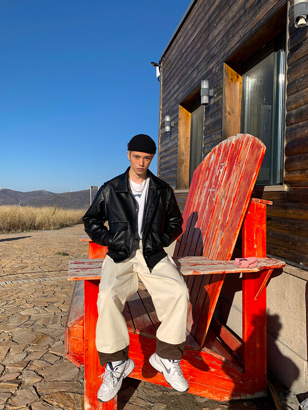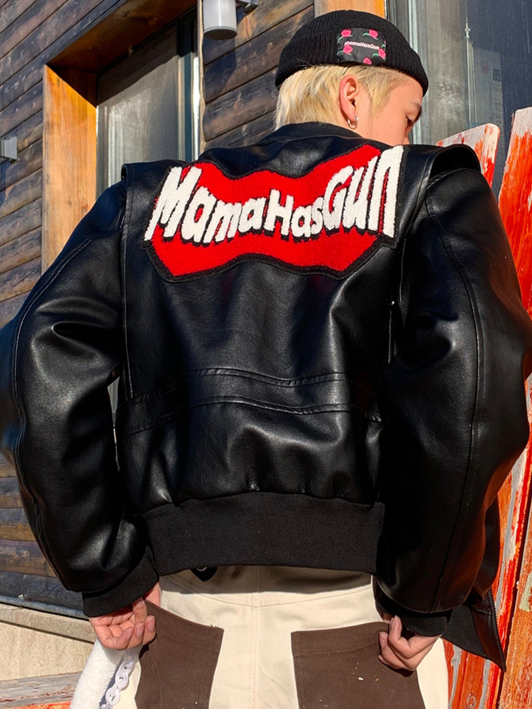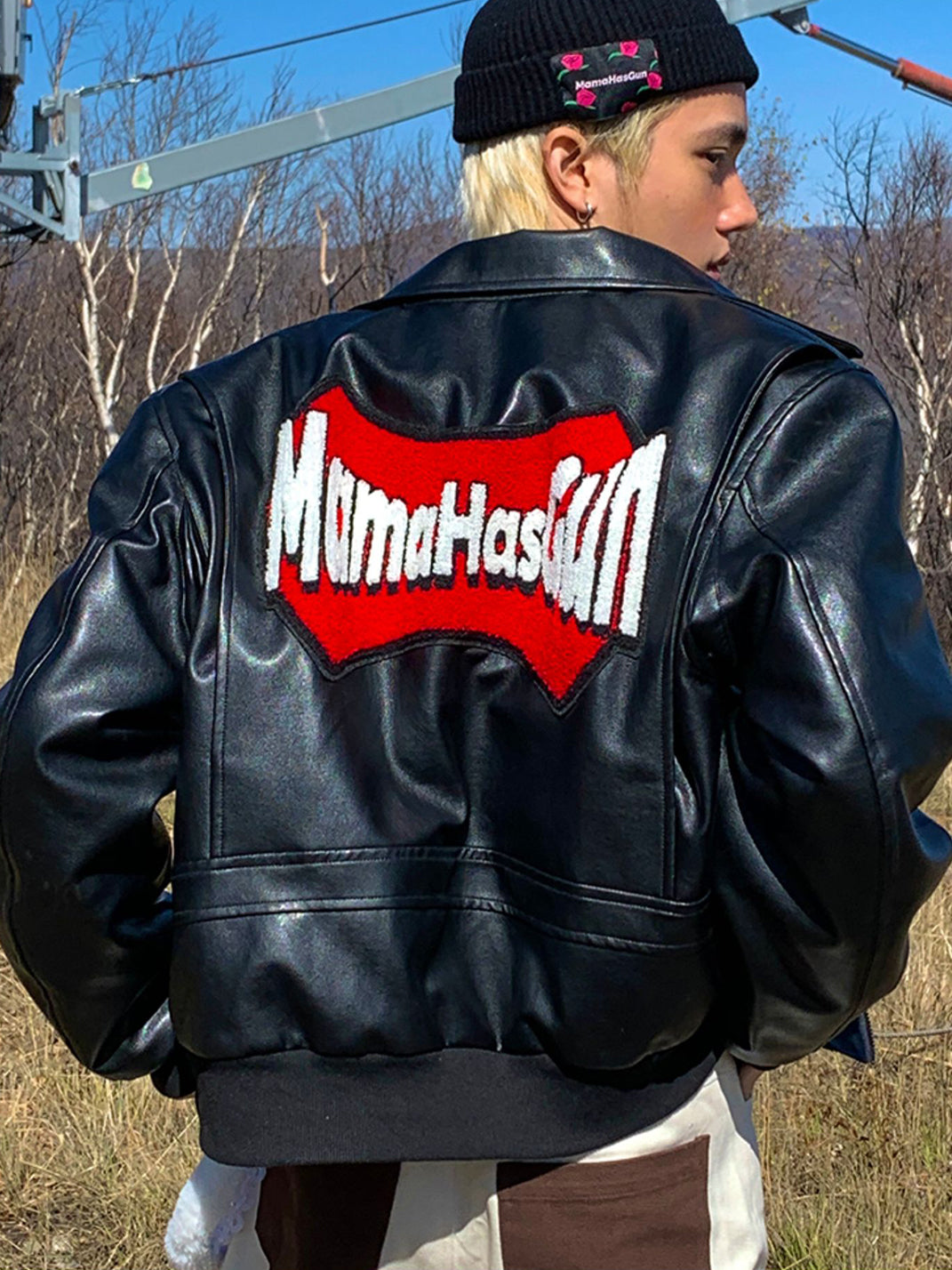 MMHG | Vintage Towel Embroidery Contrast Logo Loose Fit Leather Jacket