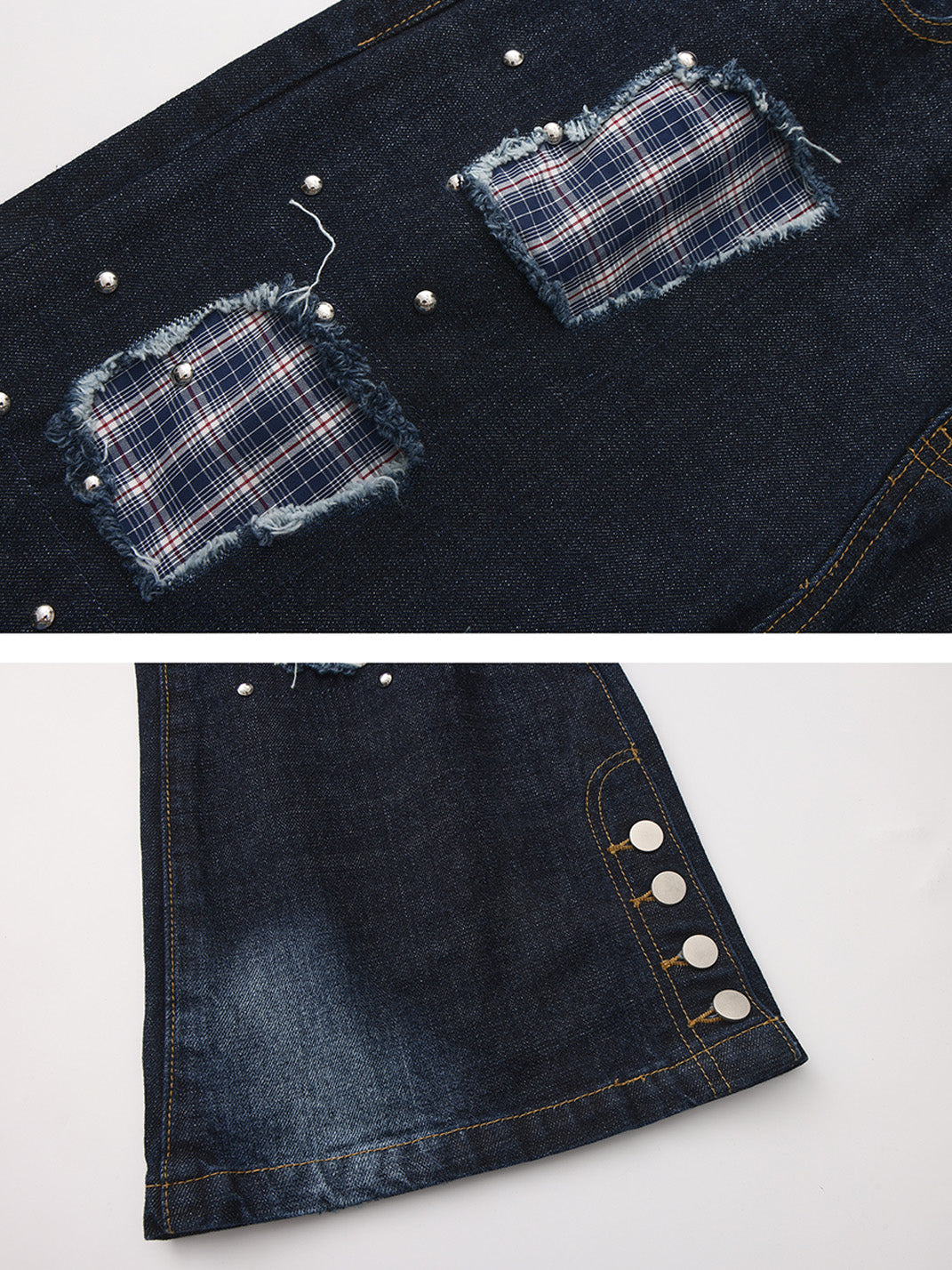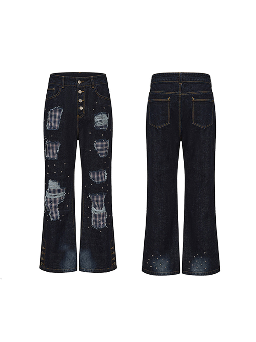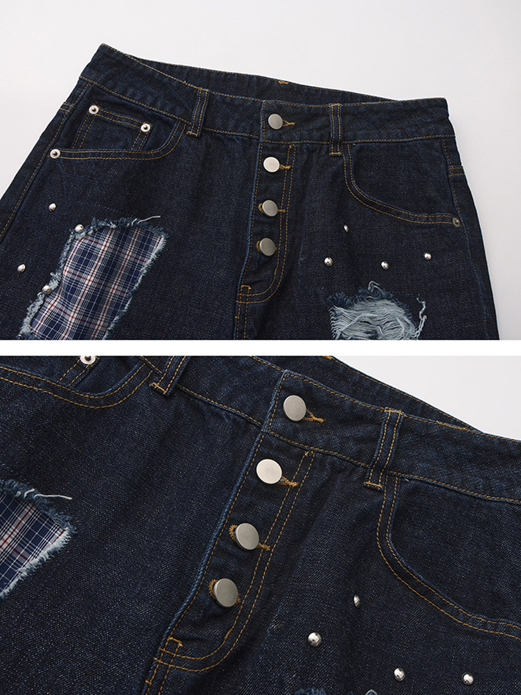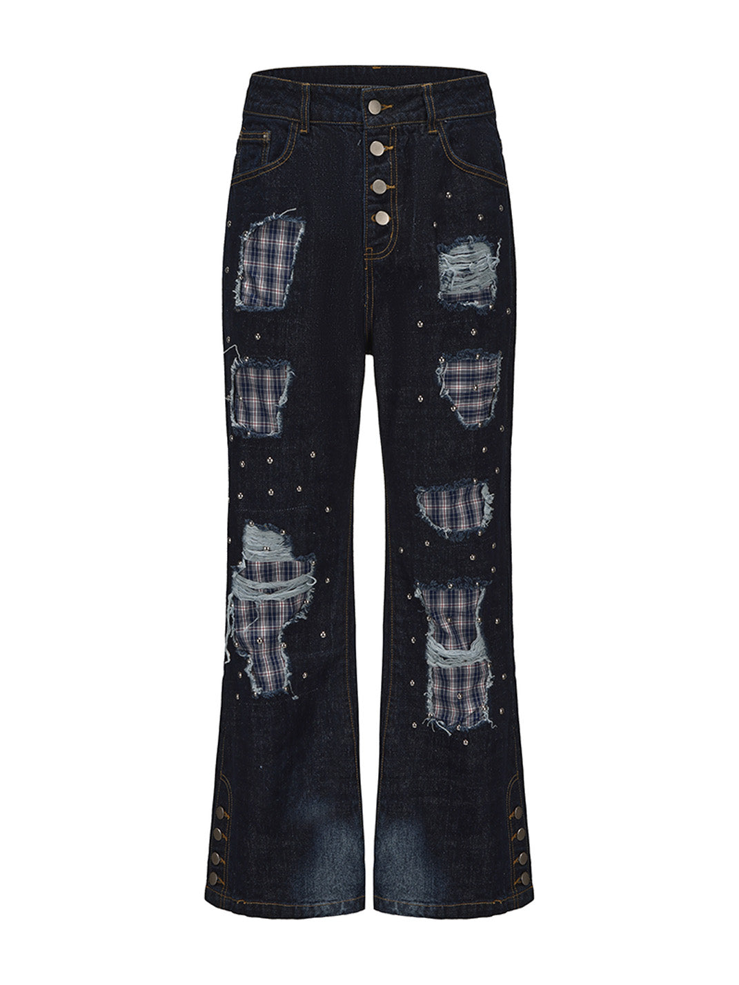 PAIKI | Plaid Patchwork Distressed Denim Pants saltar al contenido