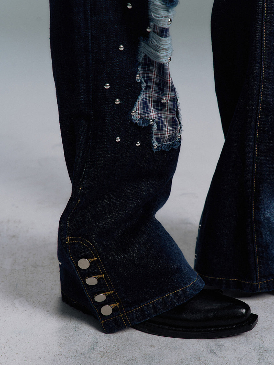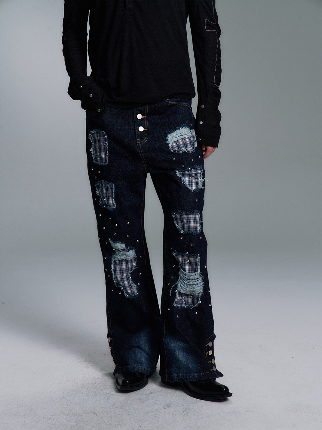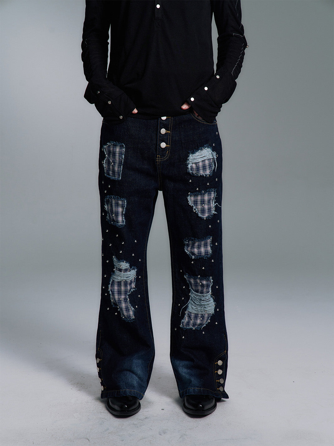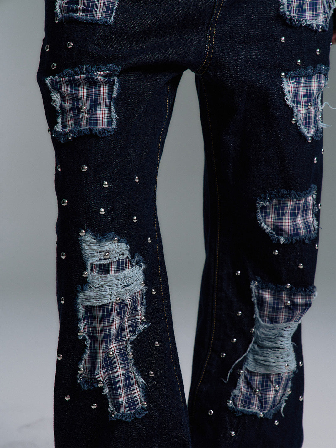 PAIKI | Plaid Patchwork Distressed Denim Pants