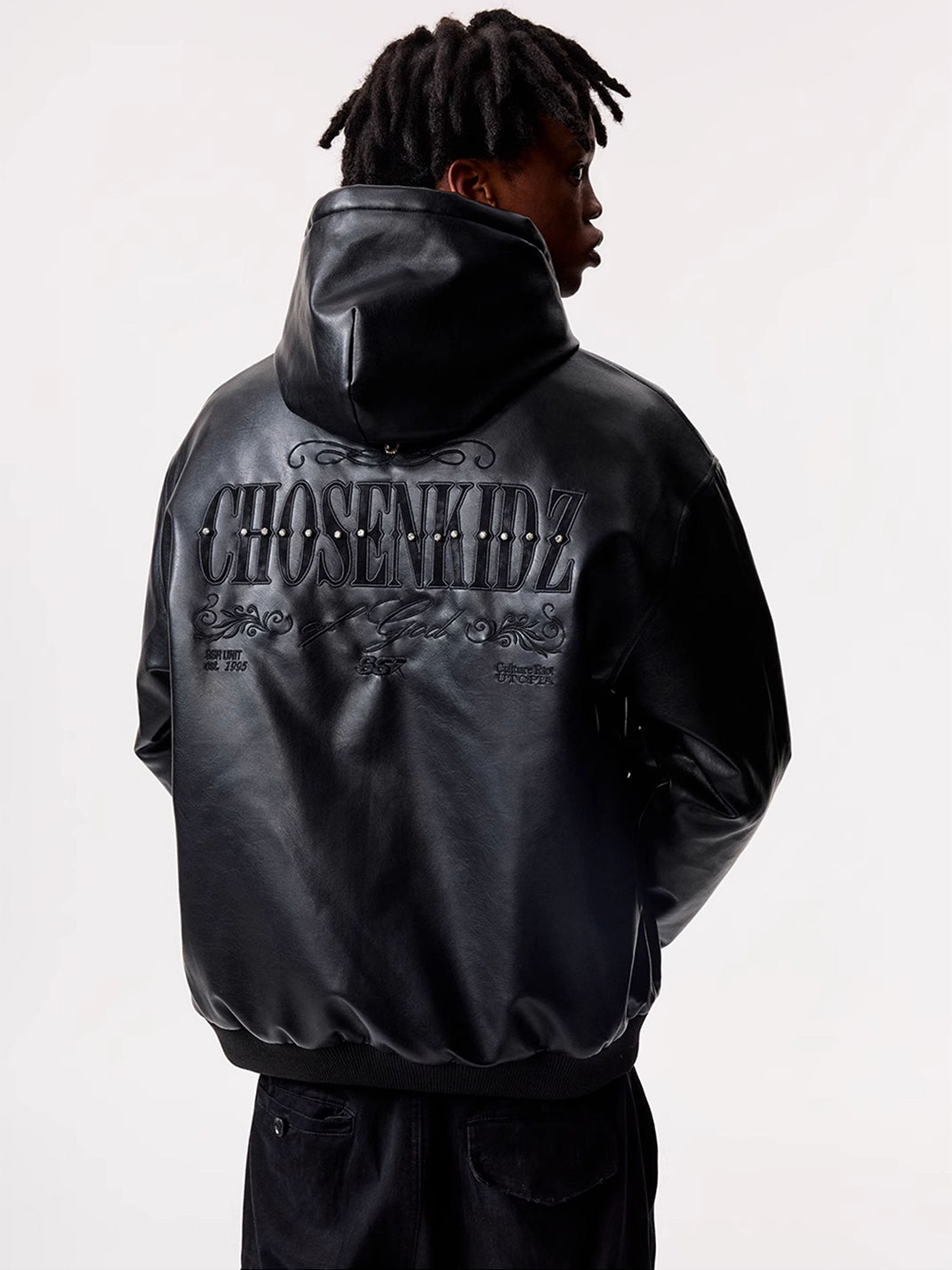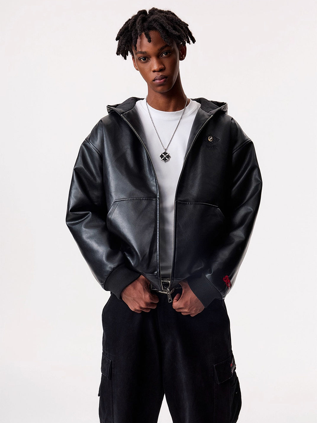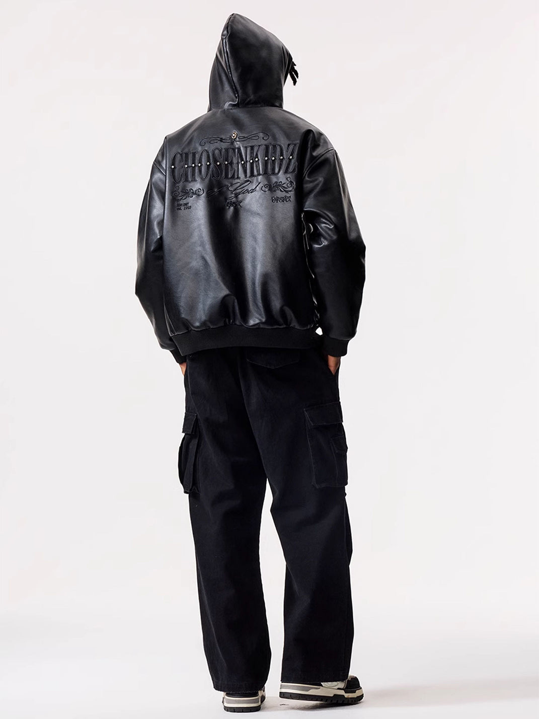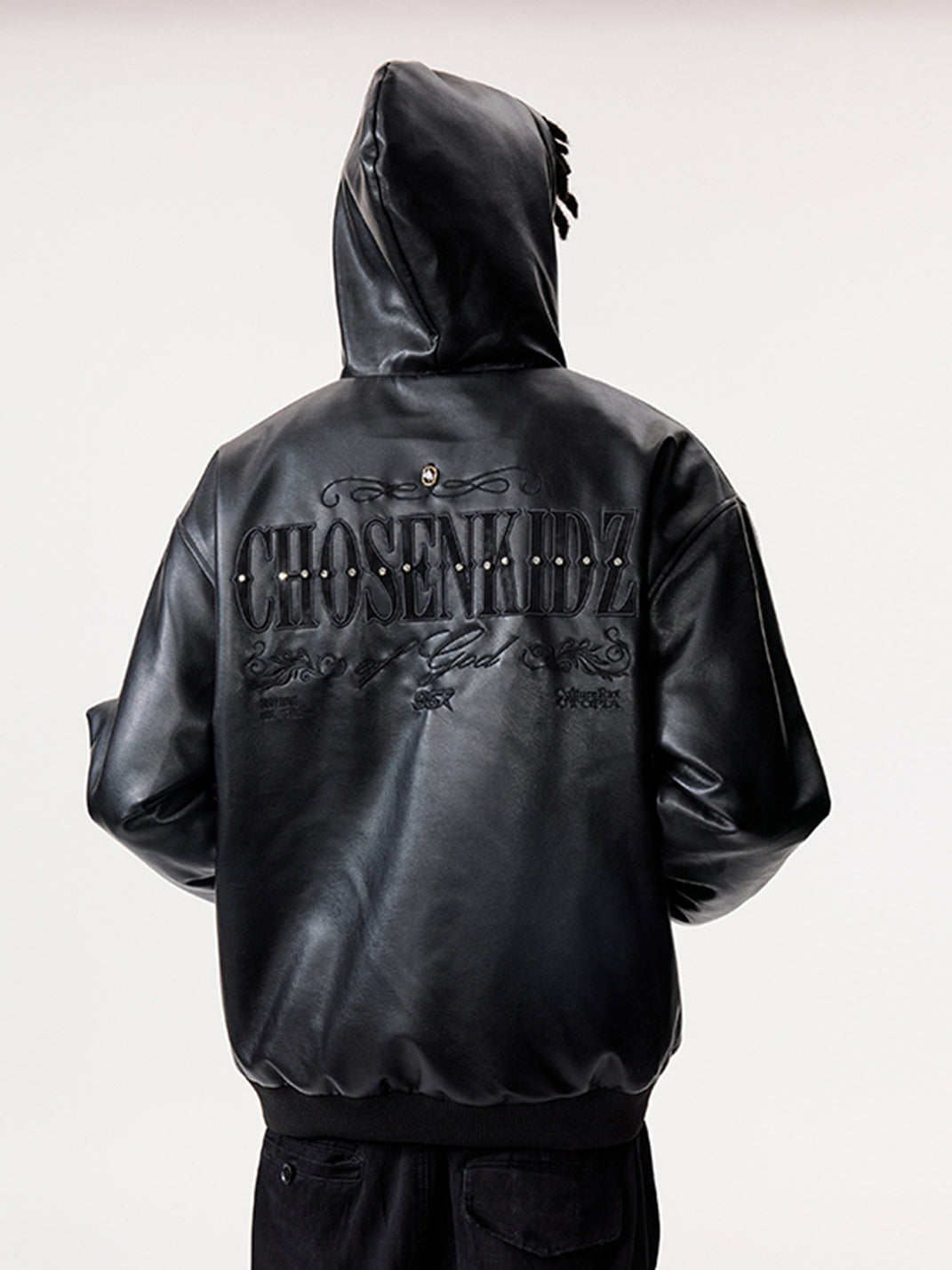 SSR | Embroidery PU Leather Hooded Jacket saltar al contenido