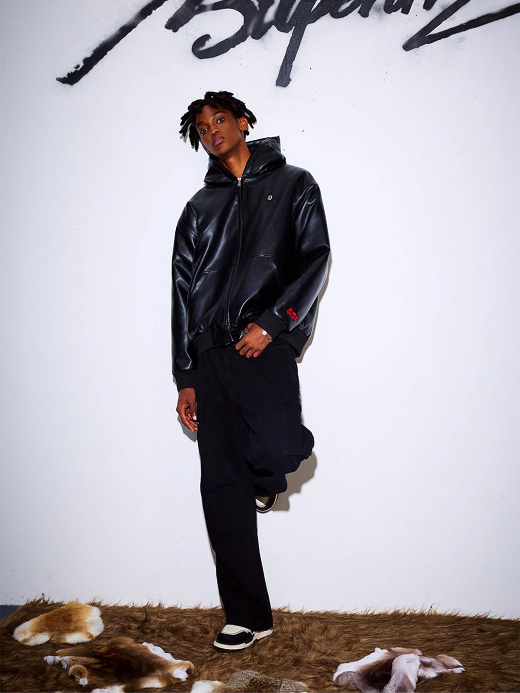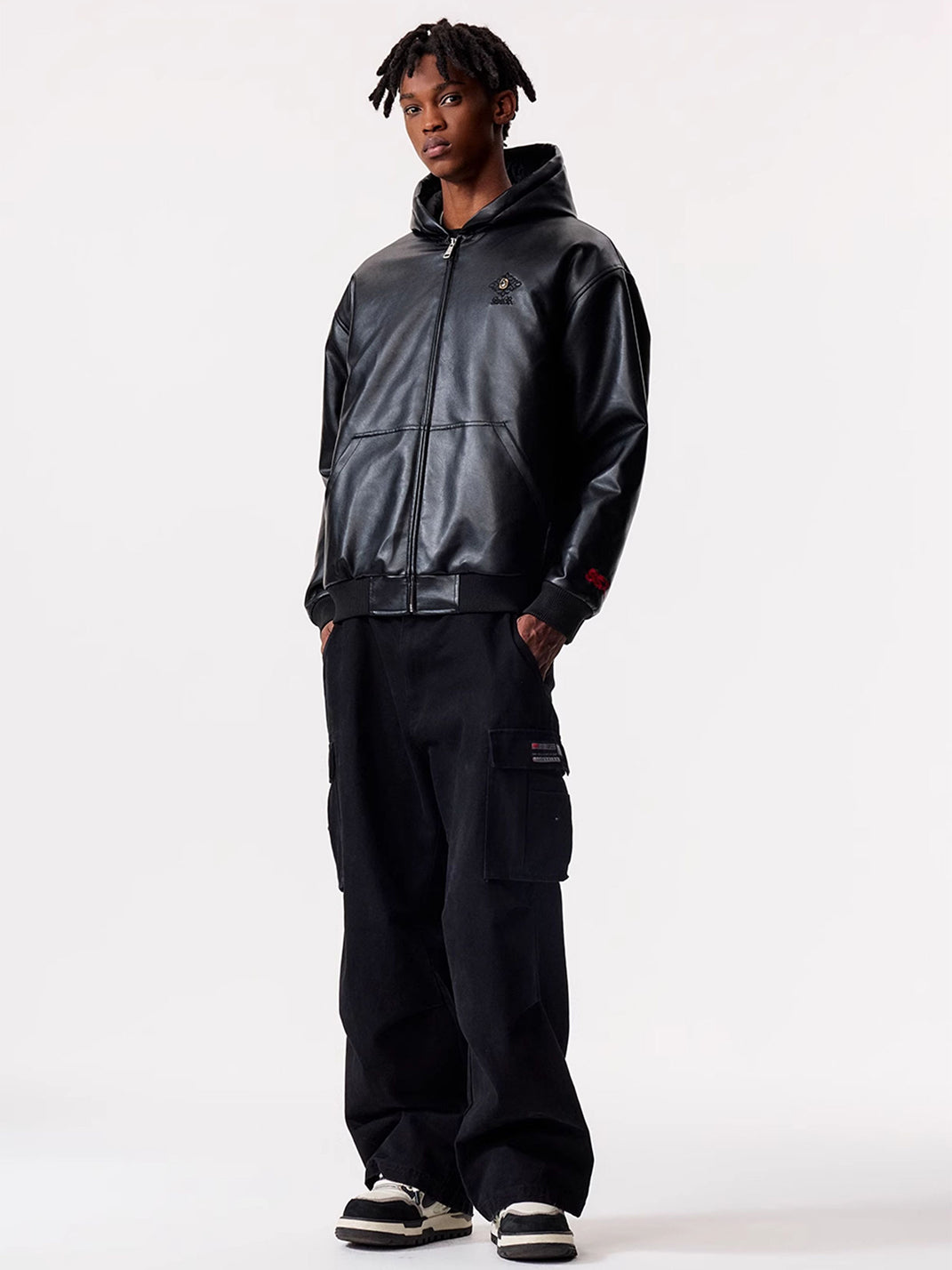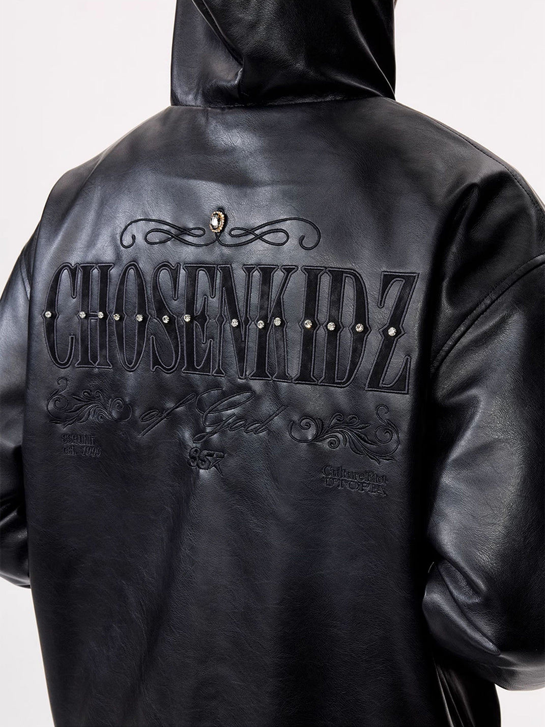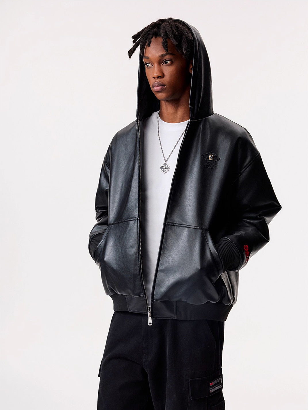 SSR | Embroidery PU Leather Hooded Jacket saltar al contenido