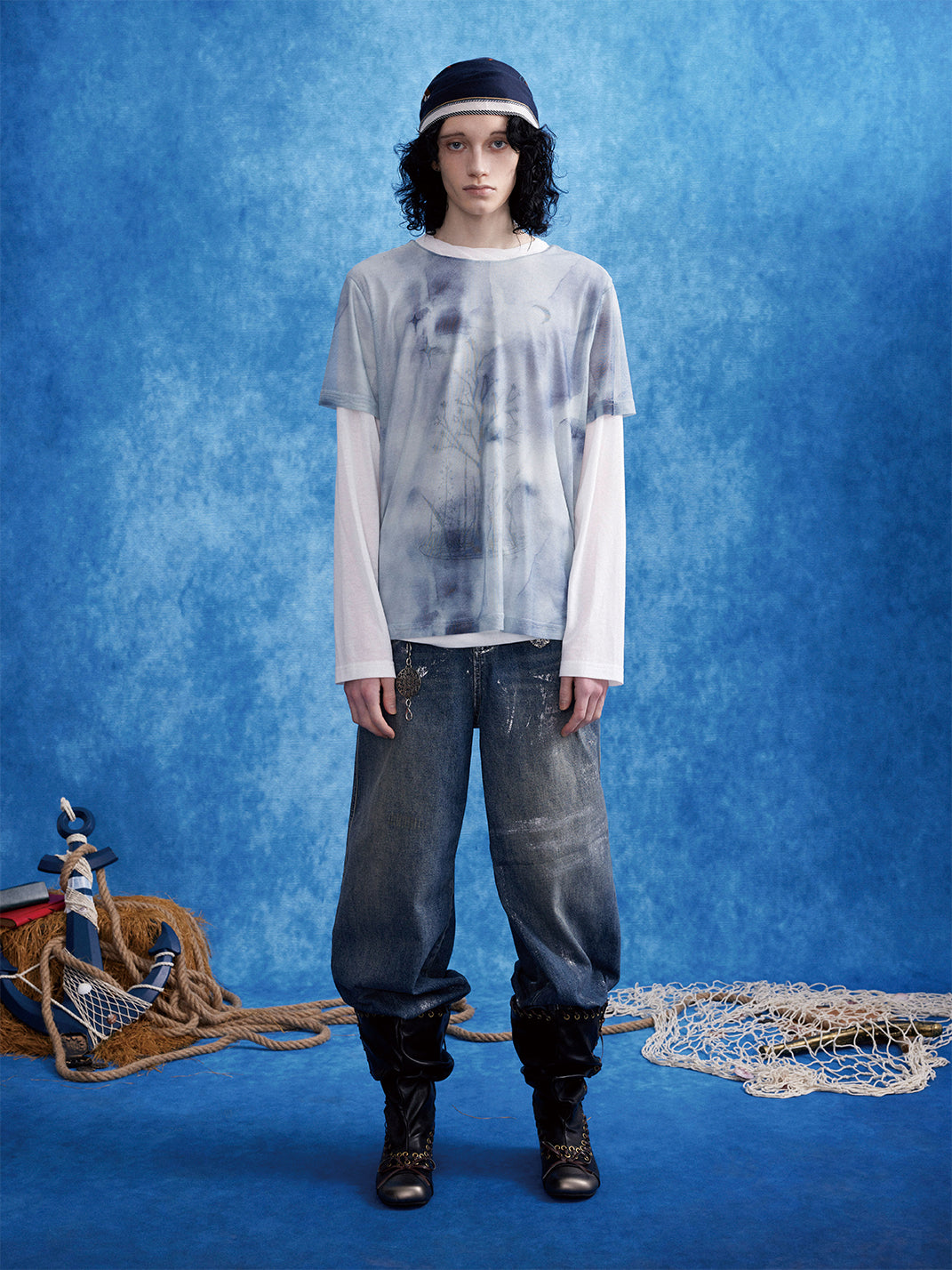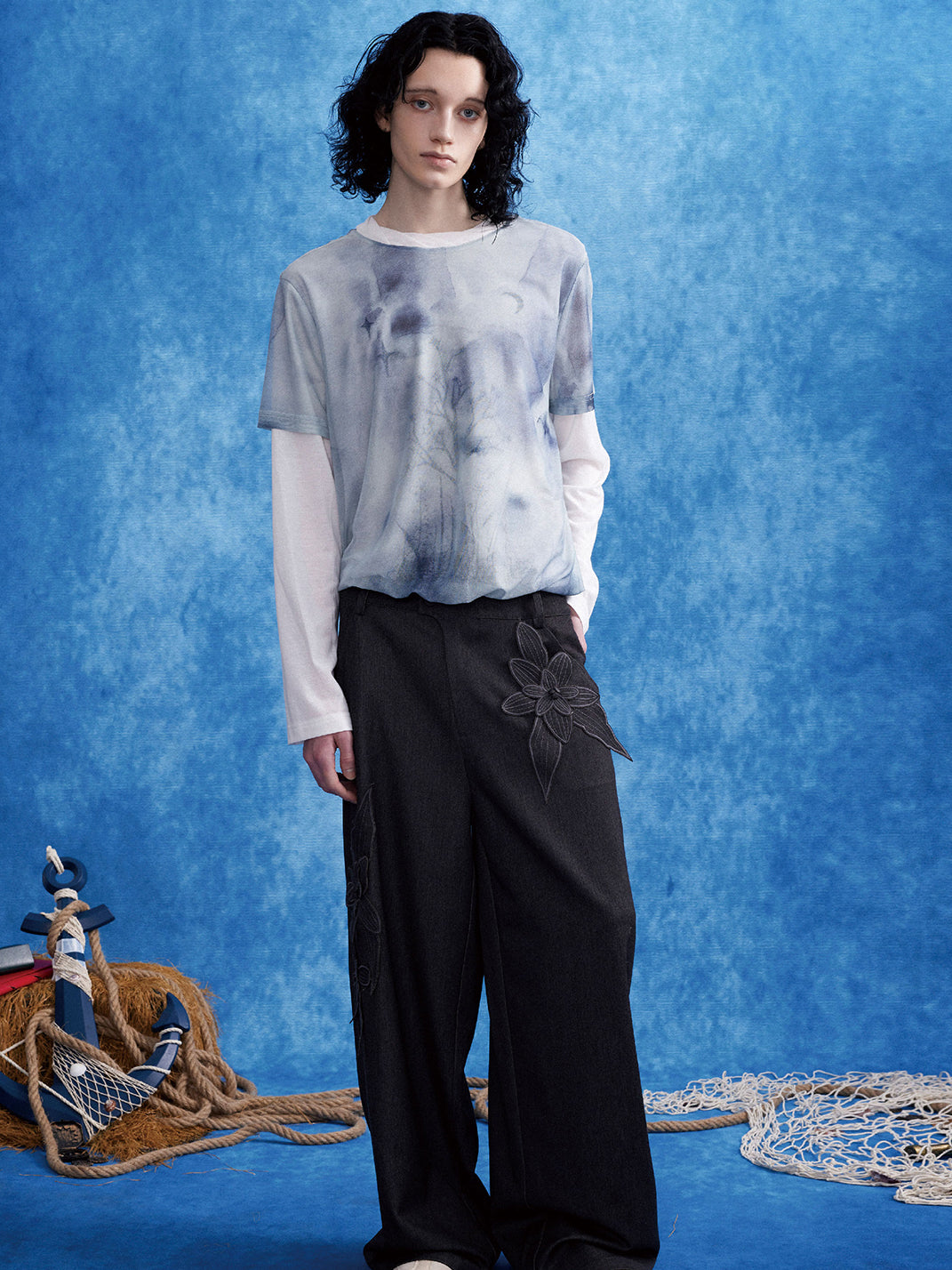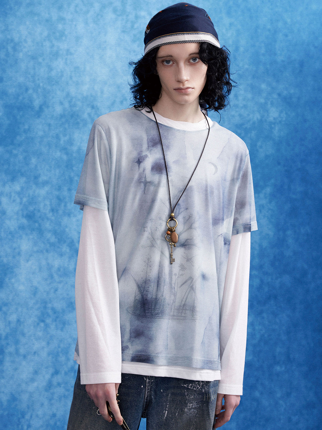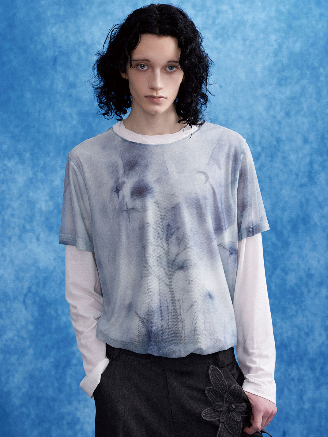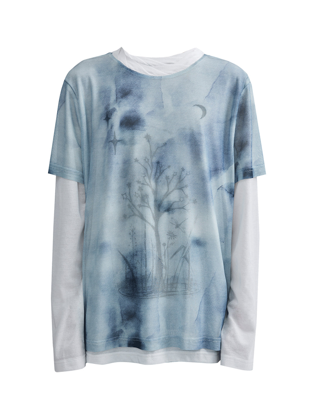 OIPWORD | “Moon-Perching Tree” Printed Double-Layer Long Sleeve Top