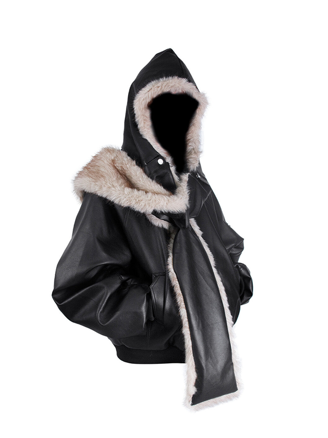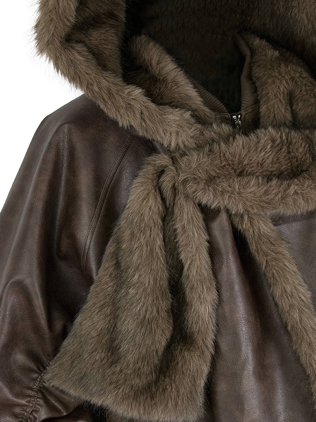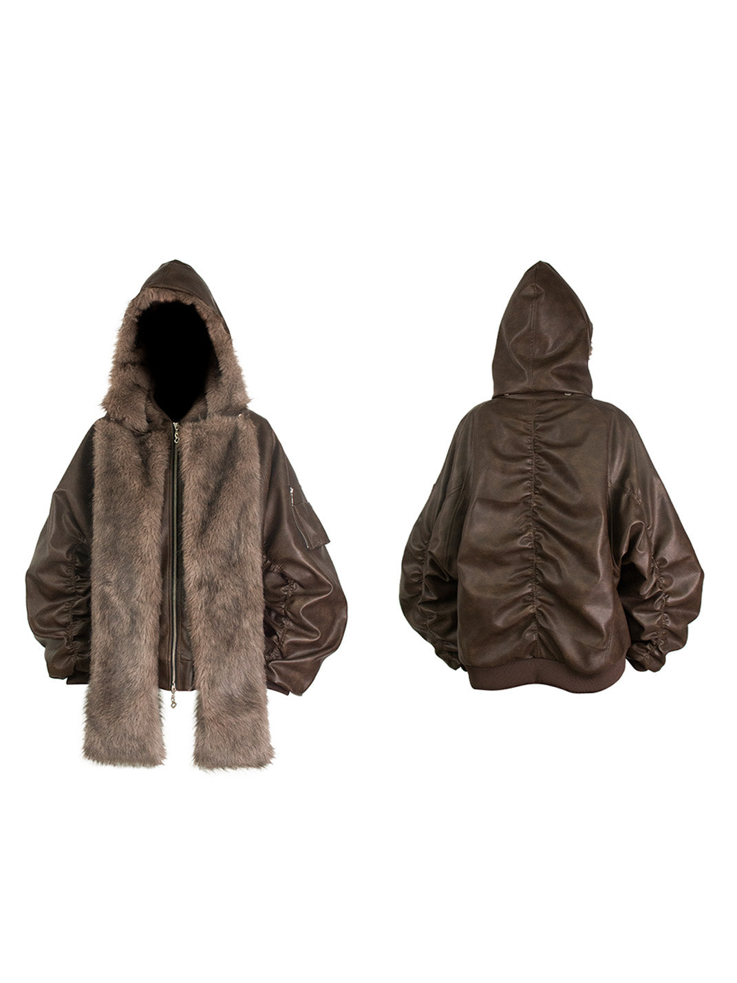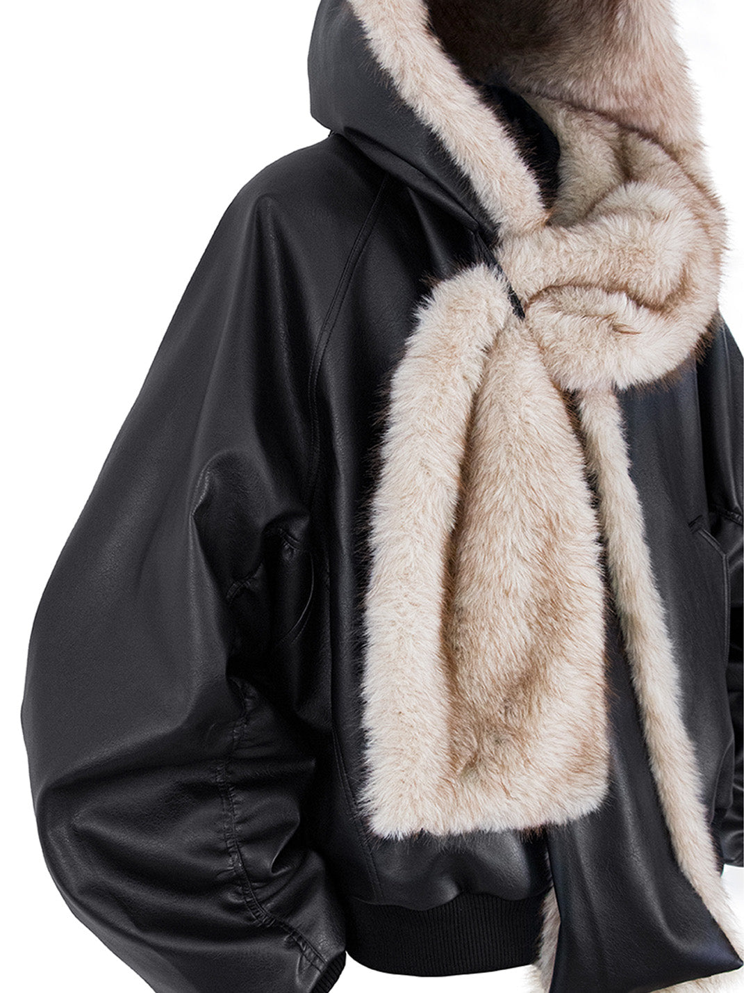 RELABEL | Detachable Plush Scarf Ruched Hooded Jacket
