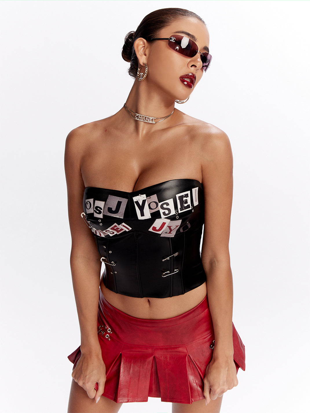 Front and back panels are decorated with striking red-and-black contrast prints, while grommet and safety-pin details lend a bold, edgy finish.