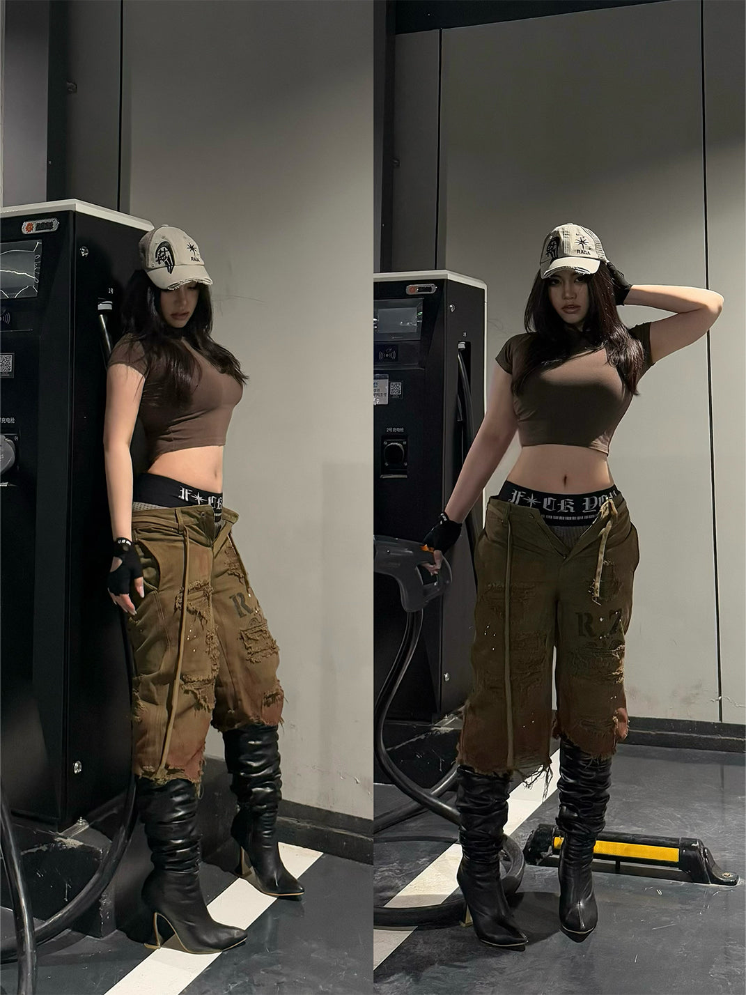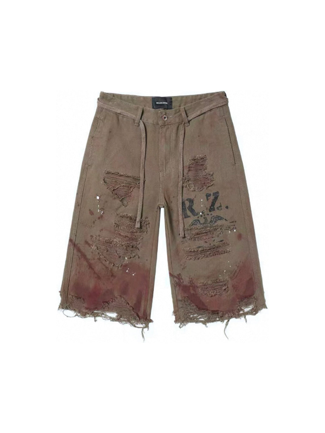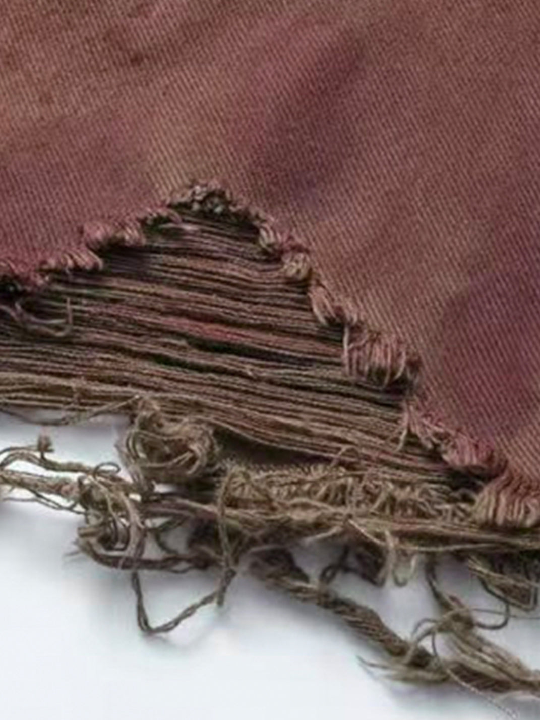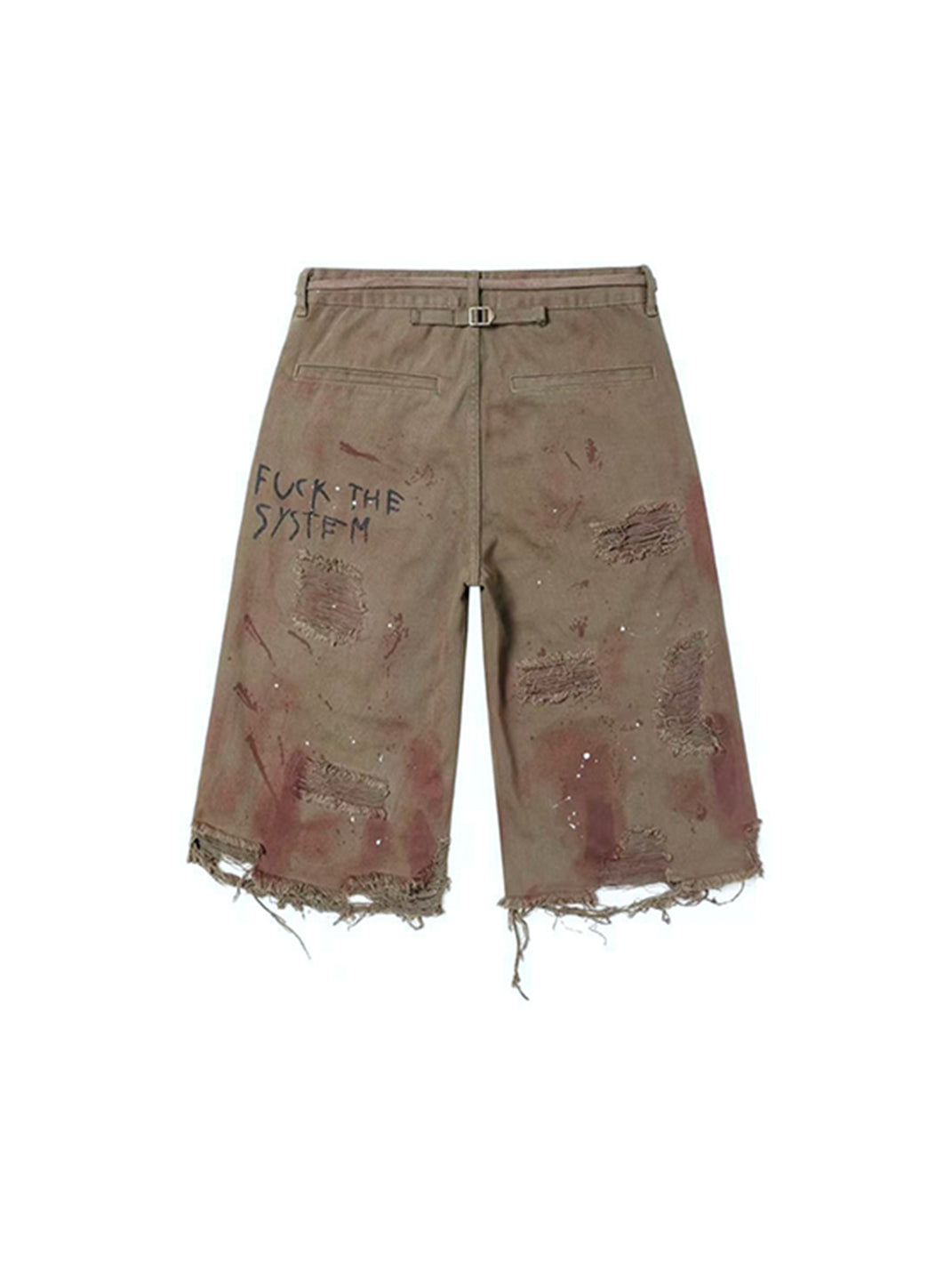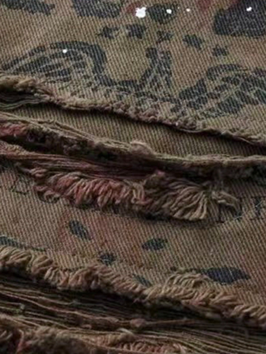 Confeccionados con tela de algodón puro de alto gramaje, estos pantalones son resistentes y estructurados. Los múltiples lavados y el desteñido crean un aspecto vintage y desgastado. El diseño de la espalda presenta motivos de [Águila Sangrienta - Hemostasia - Extremidades Cortadas], que reflejan la temática de supervivientes de la colección 25ss "Riot". Toda la prenda está desgastada a mano, con manchas intencionadas y salpicaduras de tinte natural para una sensación robusta y desgastada.