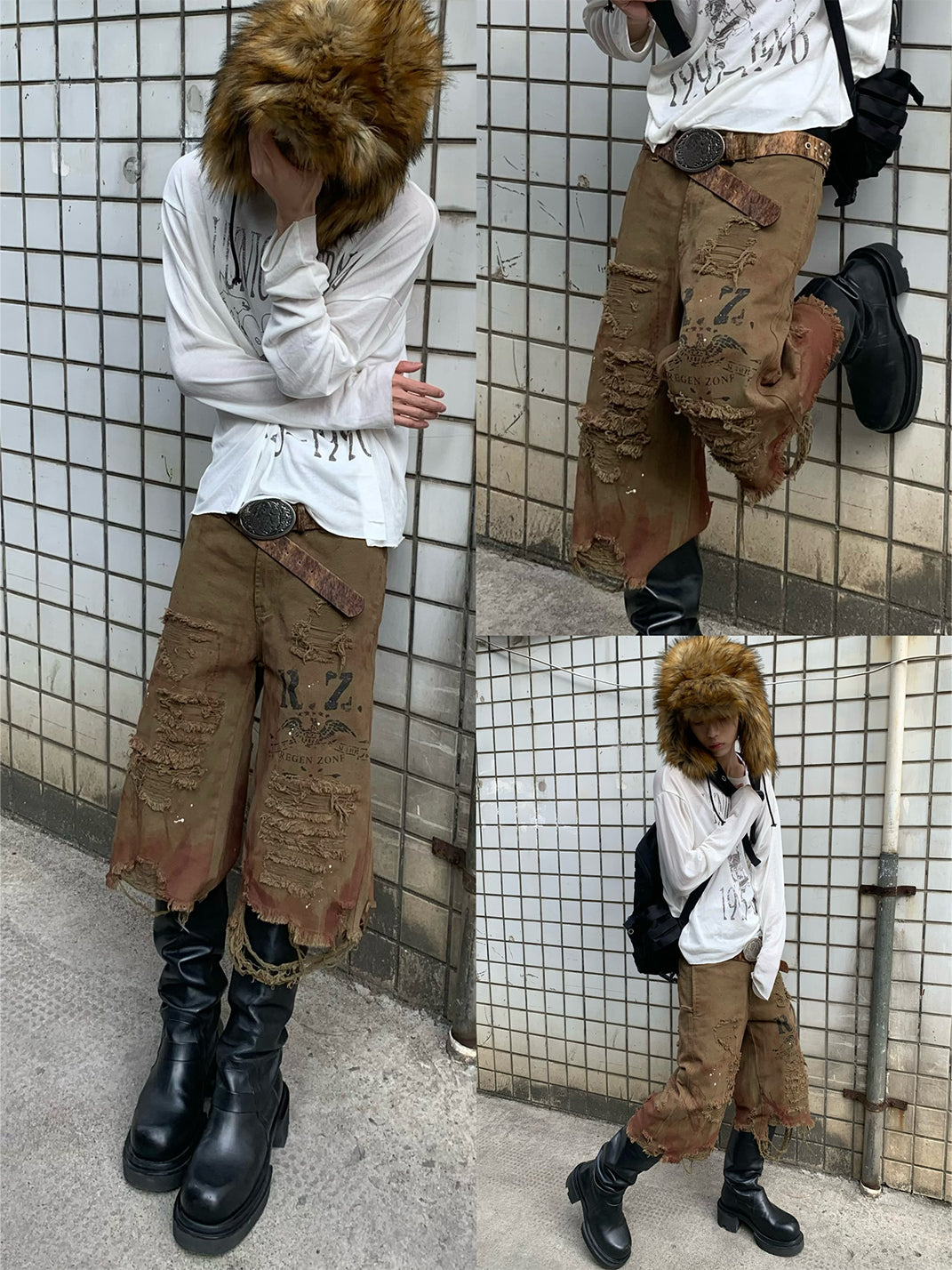 Los detalles pintados a mano y las técnicas de teñido personalizadas añaden toques únicos. Cada par incluye una cuerda de cáñamo gruesa y personalizada para realzar su estética urbana. La cintura trasera cuenta con una hebilla ajustable para un ajuste personalizado, y la bragueta delantera cuenta con una cremallera YKK.