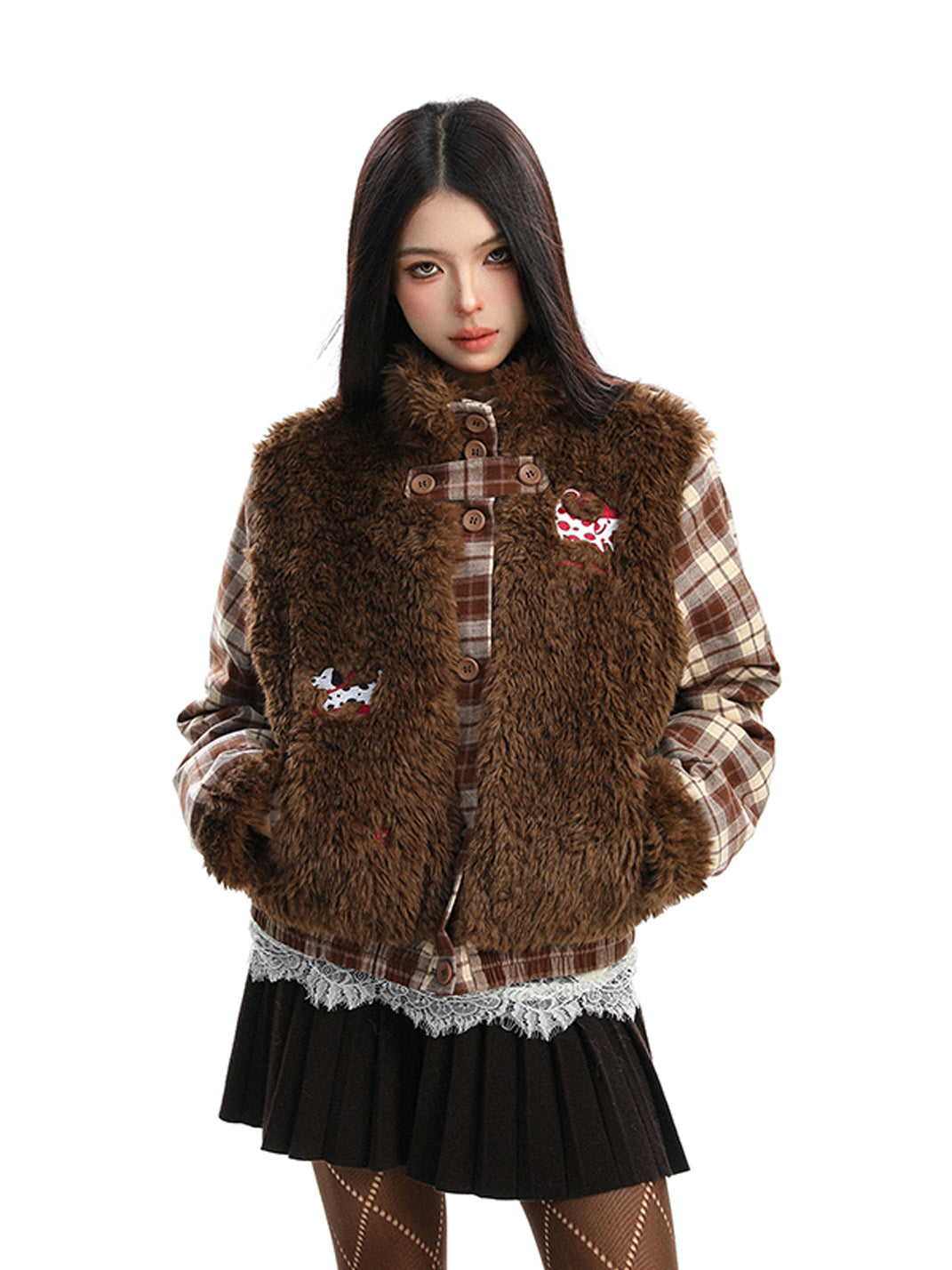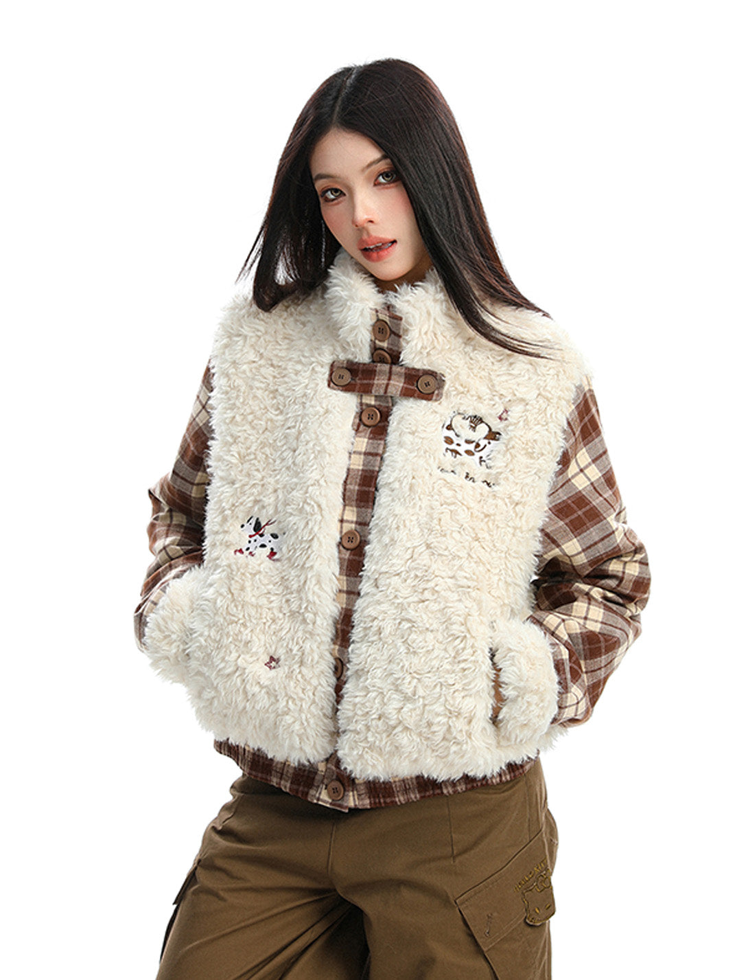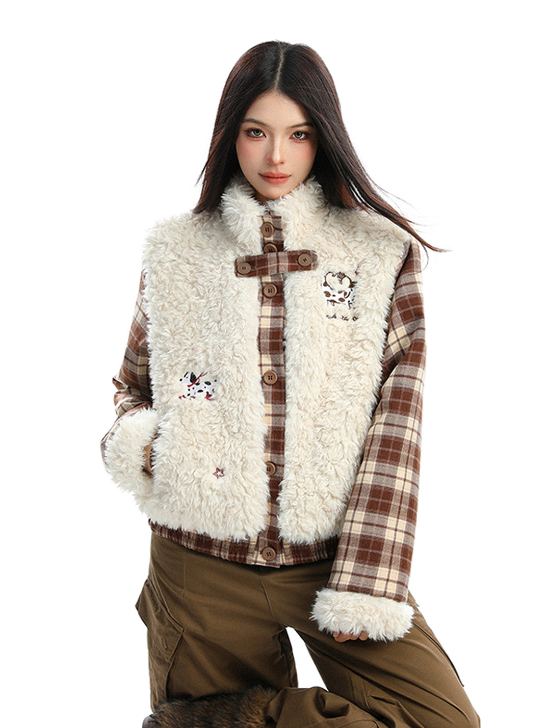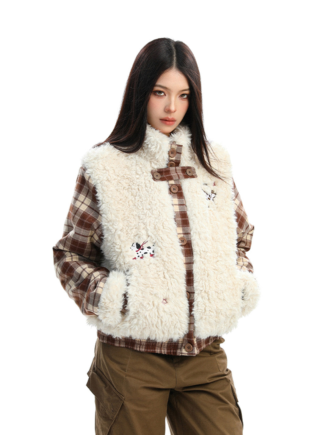 BIGGOLD | Lamb Fleece and Plaid Spliced Stand Collar Quilted Coat