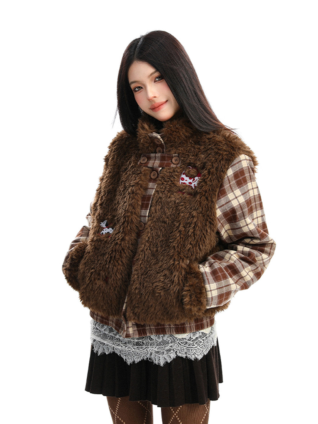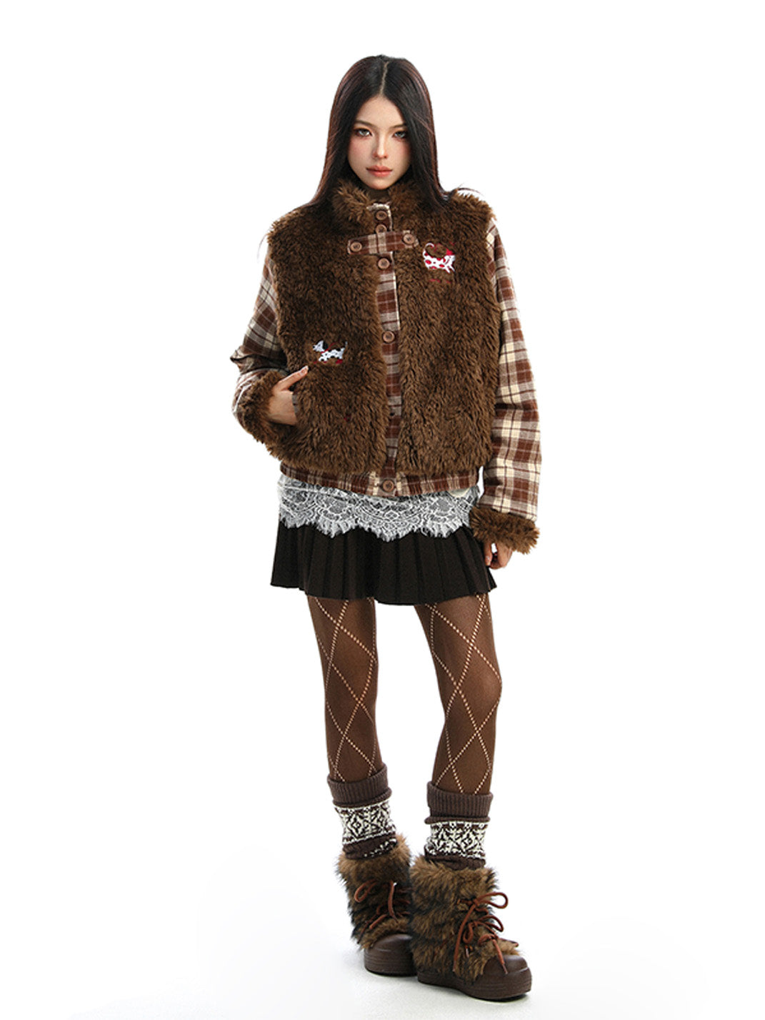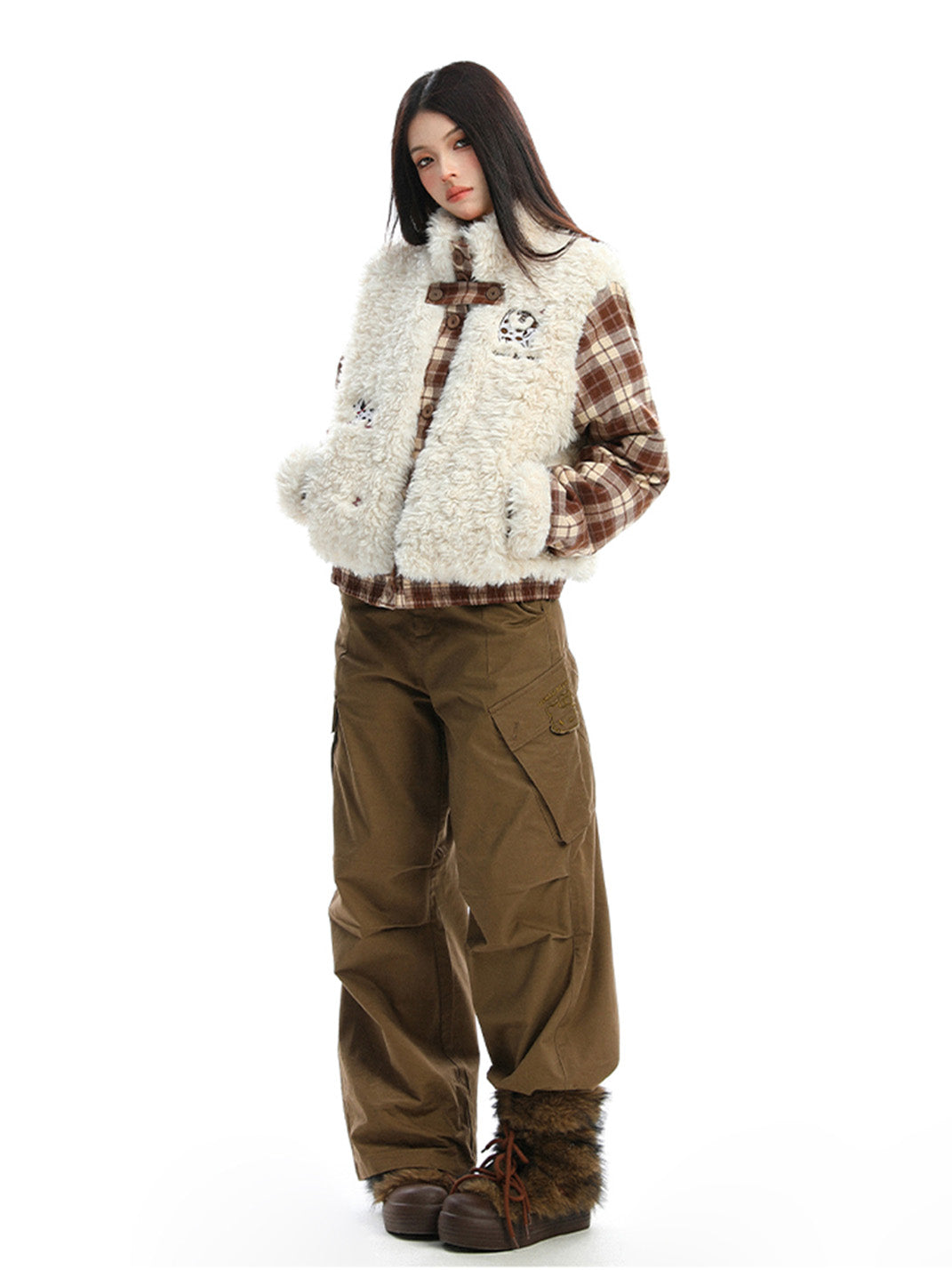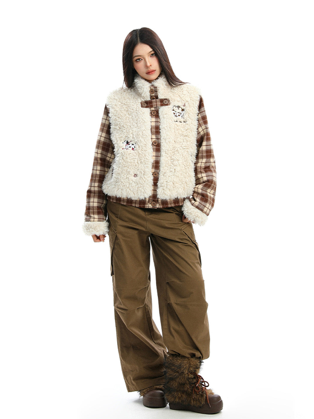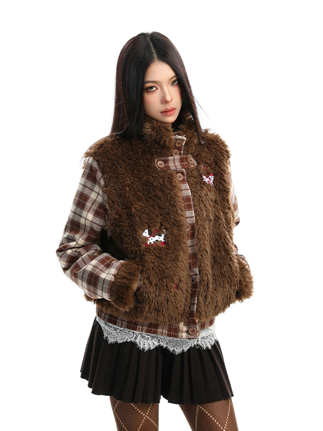 BIGGOLD | Lamb Fleece and Plaid Spliced Stand Collar Quilted Coat